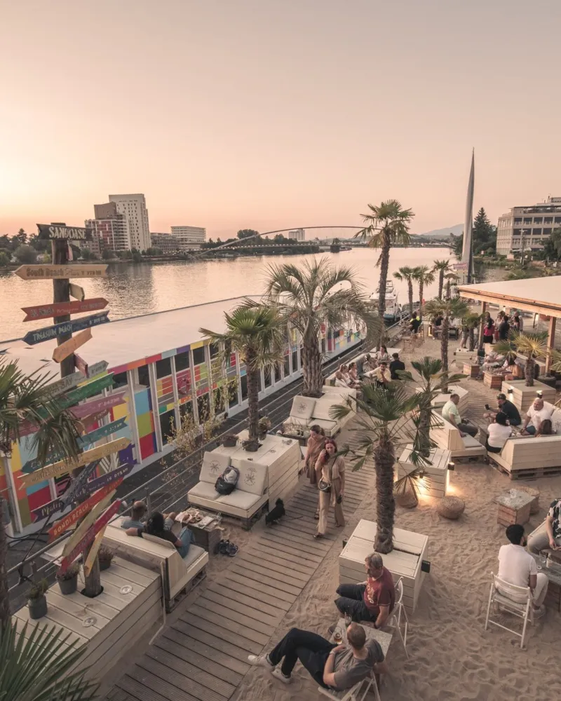 Wer das Gefühl von Sand zwischen den Zehen vermisst, ist hier genau richtig. An diesem beliebten Hotspot am Dreiländereck fühlst du dich wie auf einer kleinen Insel. Übrigens kannst du die gesamte Location – als Sommeroase oder Winterdorf – auch mieten.