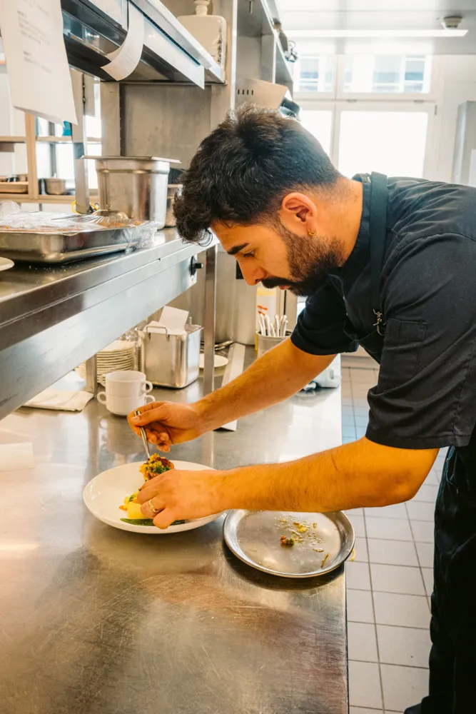Das gesamte Haus wirkt nun unbeschwerter, grosszügiger, ruhiger und deutlich freundlicher als zuvor. Das scheint auch auf die Mitarbeitenden abzufärben, die Gäste warmherzig empfangen und auch untereinander einen wohlwollenden Umgang pflegen. Das respektvolle Miteinander, das Interesse am Menschen, die persön- liche Gastfreundschaft werden von Alexandre Kaden vorgelebt. Er weiss; alles steht und fällt mit dem Team und dessen Motivation. Beim Gang durchs Haus plaudert er mit dem Chef de Service, der Küchenhilfe oder der Reinigungskraft, nimmt nebenbei eine telefoni- sche Tischreservation fürs Restaurant entgegen, beant- wortet die Frage eines Hotelgastes, bespricht sich kurz mit seiner Frau Eleni, die für den Betrieb der Gästezim- mer verantwortlich ist. Dass die beiden seit Jahren in Riehen wohnen, hier bestens vernetzt sind und jeden Winkel, jedes Café, jede Galerie und jeden Spazierweg kennen, kommt den Gästen zugute.