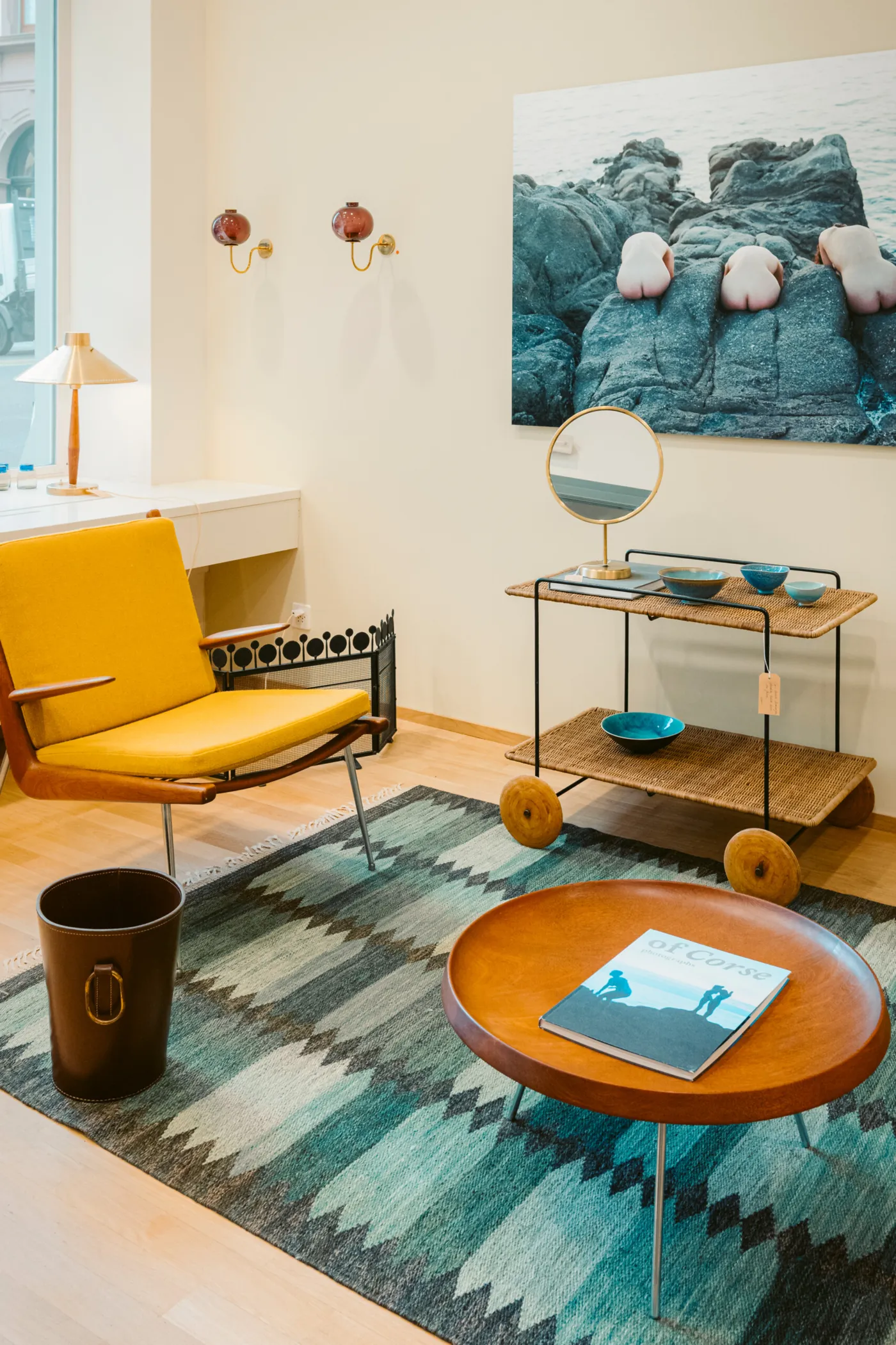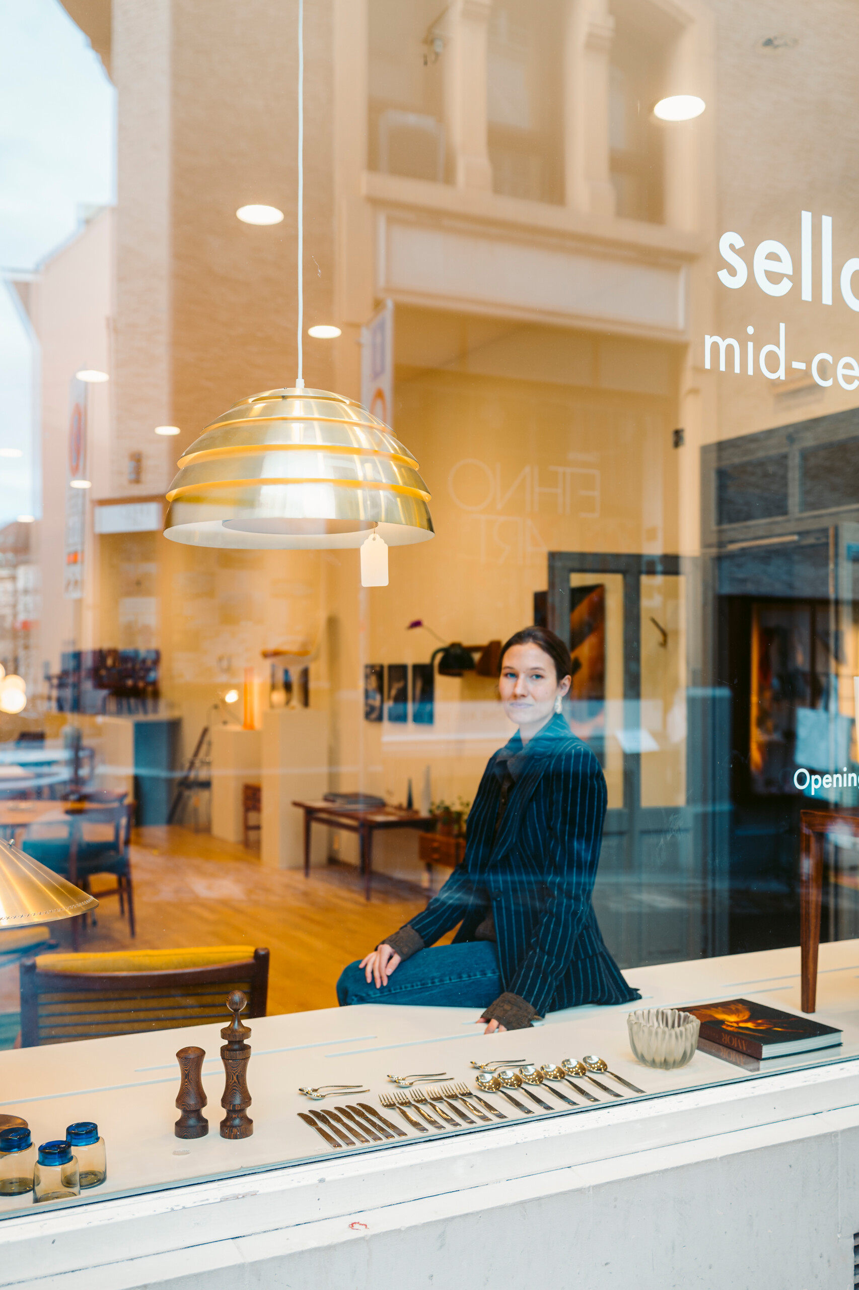 Das riesige Rundbogenfenster am Spalenberg 18 zieht die Blicke auf sich. Drei Lampen, ein Stuhl, ein Tischchen und ein paar Vasen stehen harmonisch kombiniert in der Auslage und geben den Blick auf den dahinterliegenden, grossen Raum frei. Hier drin tut sich einem eine Welt auf, die ein wenig an die Kult-Serie Mad Men erinnert. Aus den Lautsprechern singt mit warmer Stimme Etta James «Stormy Weather». Willkommen bei Sella Studio, in der Midcentury-Welt von Nora Gysin.