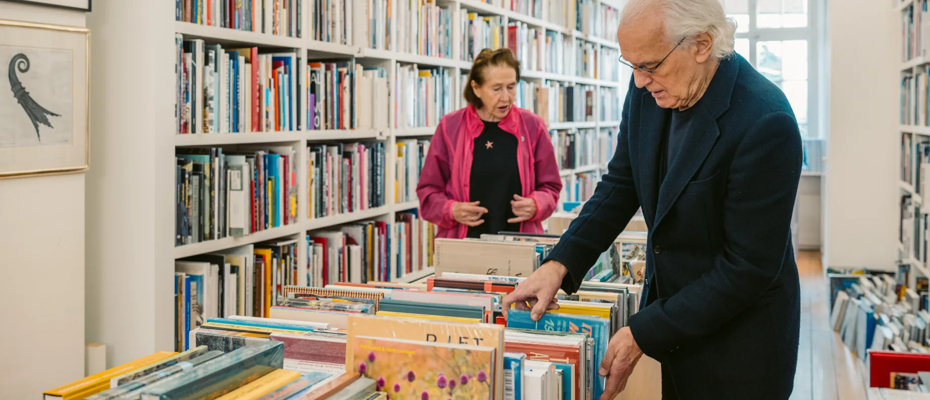 Diego Stampa sortiert die Ausstellungsprospekte auf dem Bänkli vor der Eingangstür, während seine Frau Gilli Stampa hinten in der Buchhandlung für Ordnung sorgt. Die beiden wohnen im selben Haus, in dem sie seit 1969 ihre Galerie samt Buchhandlung führen. Das vereinfacht vieles. Trotzdem arbeitet heute eine Kunsthistorikerin in Büro und Archiv, ein Schreiner kümmert sich um das Auf- und Abhängen der Kunstwerke. Denn auch mit 80+ organisieren die beiden regelmässig neue Ausstellungen, kuratieren das Buchsortiment, betreuen sowohl die Künstlerinnen der Galerie als auch die Besucherinnen und planen bereits die Teilnahme an der kommenden Art Basel.