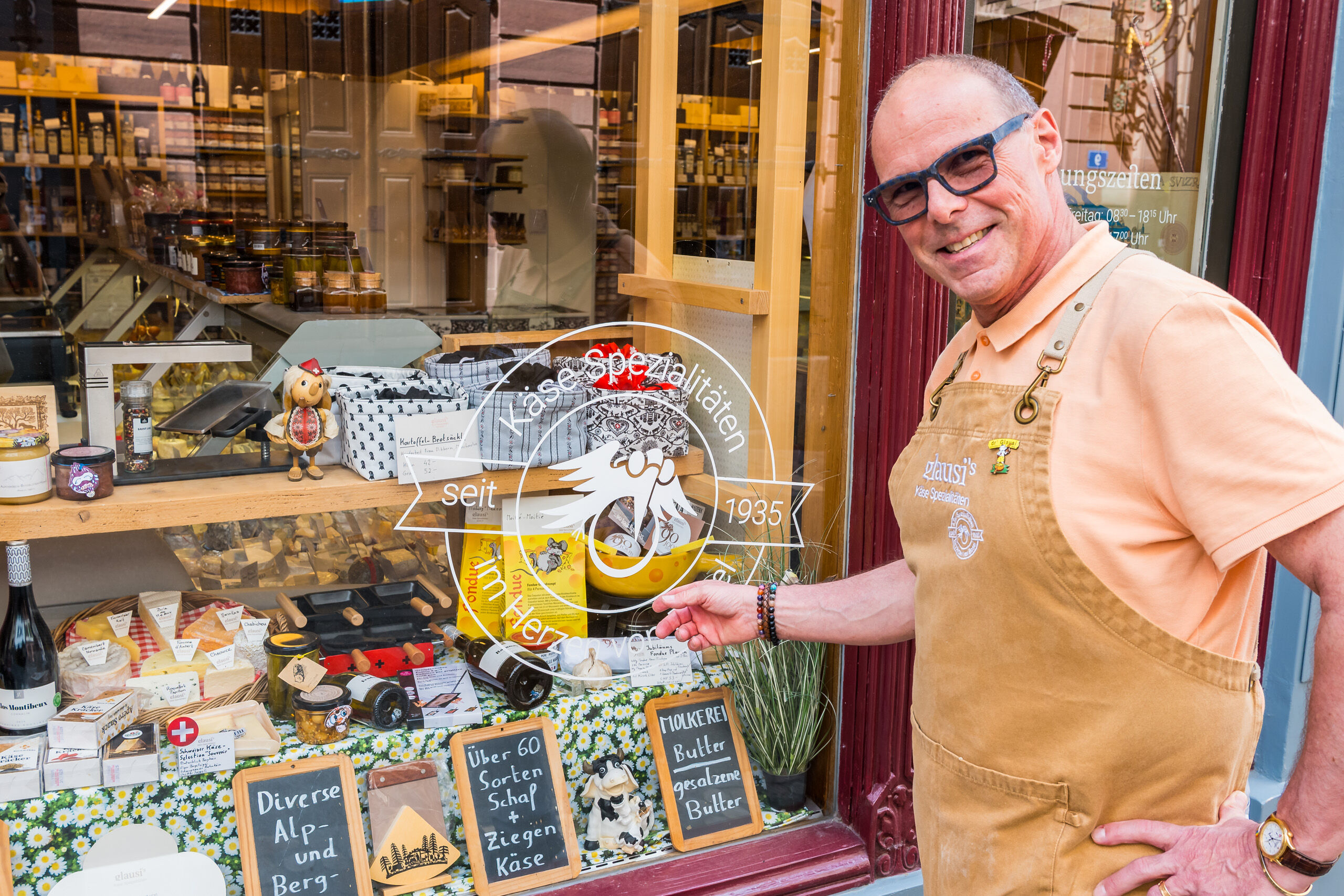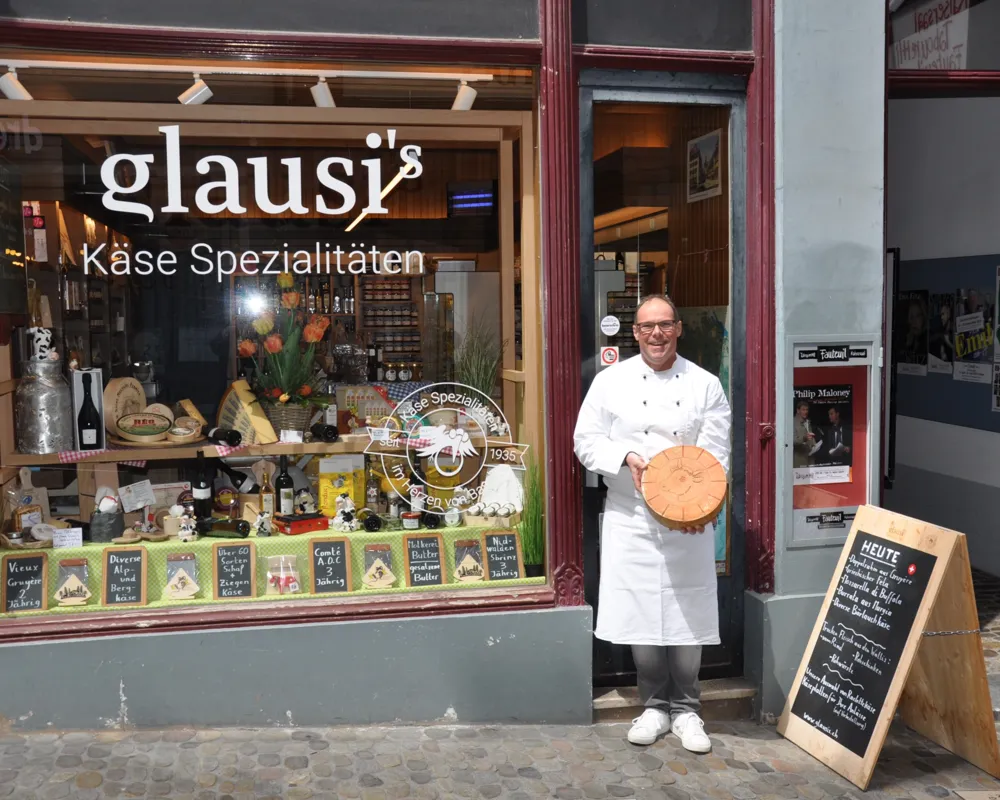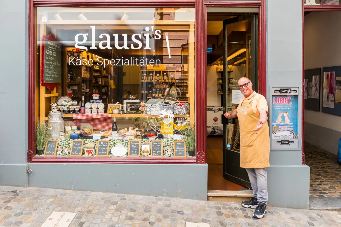 Es ist ein schmales, kleines Lokal, das sich am Spalenberg zwischen einen Tee- und einen Weihnachtsladen schmiegt. Der goldene Schriftzug auf dunkelgrünem Hintergrund, der über dem Schaufenster prangt, verrät, was drinnen auf die Kundschaft wartet: Käsespezialitäten – und das schon seit 1935. Glausi’s ist ein ursprünglicher Familienbetrieb mit einer neunzigjährigen Geschichte, der einen Hauch Vergangenheit in sich trägt und trotzdem mit der Zeit geht. Jean-Pierre Sauty, der den Laden seit sieben Jahren führt, verkauft auch gerne einmal Käse von jungen Start Ups, die etwas Neues probieren. In der Vitrine haben die Neulinge für ihn genauso einen Platz verdient wie die traditionelleren Käsereien.