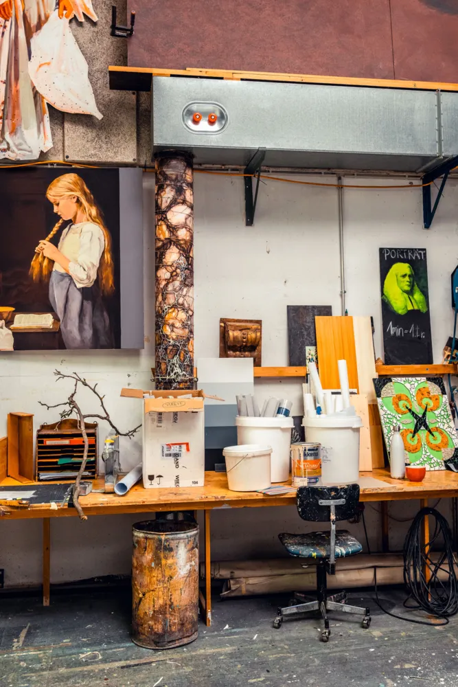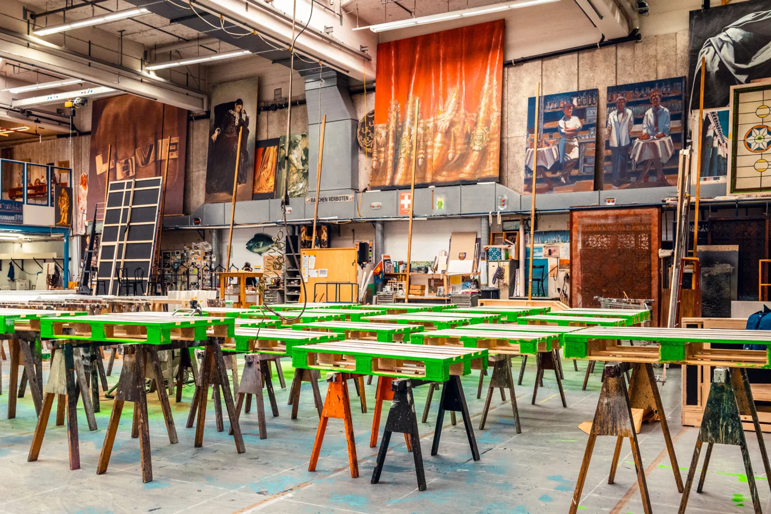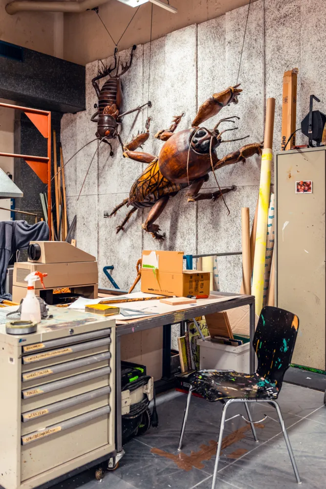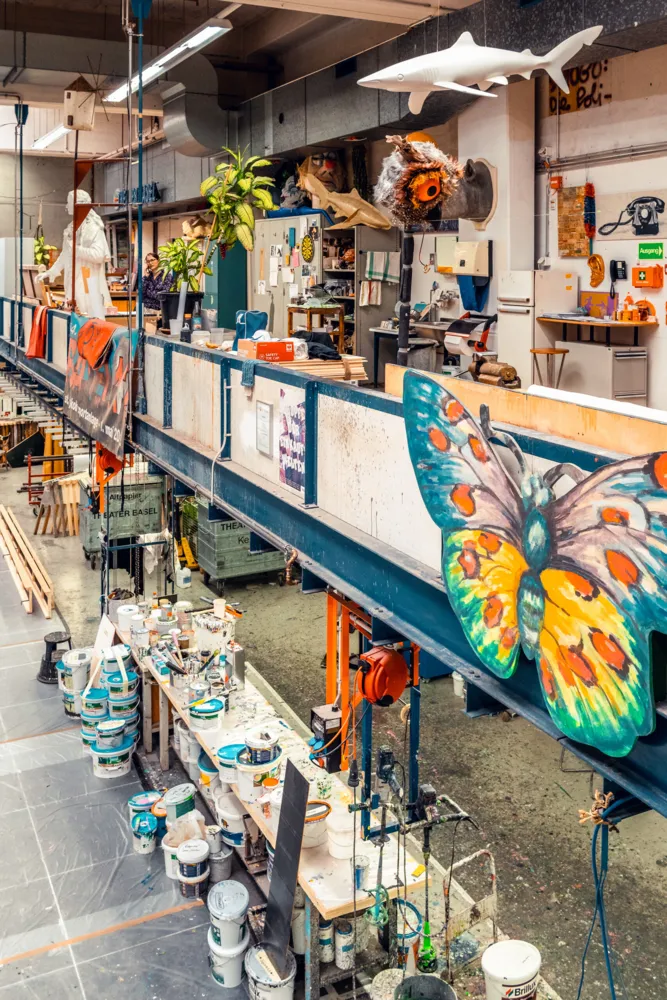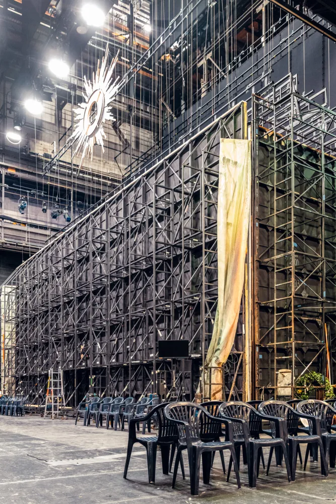 Mit dem monströsen Lift geht es runter in die Katakomben. Es wird laut. Sägekreischen, Schleifmaschinengeheul, Gehämmer. Wir sind in den Werkstätten. Konstrukteure, Bühnenbildner, Plastiker, Schreiner, Schlosser – sie alle arbeiten hier an den Bühnenbildern. Rund 25 neue gibt es pro Spielzeit. «Jeweils am Morgen wird das Bühnenbild vom letzten Abend abgebaut und das Probe-Bühnenbild montiert. Am Nachmittag nach den Proben wird alles wieder versorgt und die Kulisse für den Abend aufgestellt. Äusserst personalintensiv das Ganze – aber toll fürs Publikum!», meint Anja. Im Malsaal, der direkt unter den Glas-Pyramiden liegt, weist sie mich auf die gespannten Netze an der Decke hin. «Wegen den Kindern, die oben gerne auf den Pyramiden herumklettern, regnet es hier unten immer wieder Steinchen und Mörtel …» Die Wand hängt voller Gemälde: Rembrandt, Anker, van Gogh? Nein, Abschlussarbeiten der Lernenden. Und überall Plastiken: Ein goldenes Ohr, ein Drachenkopf, Kakerlaken, ein weisser Hai. Ein Nashorn hat eine überdimensionale Orange aufgespiesst. Staffeleien, Tische, Stühle und Böden sind übersäht mit Farbklecksen.