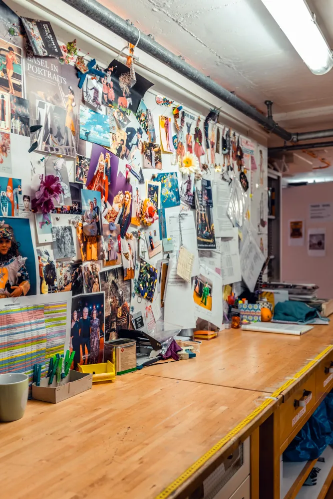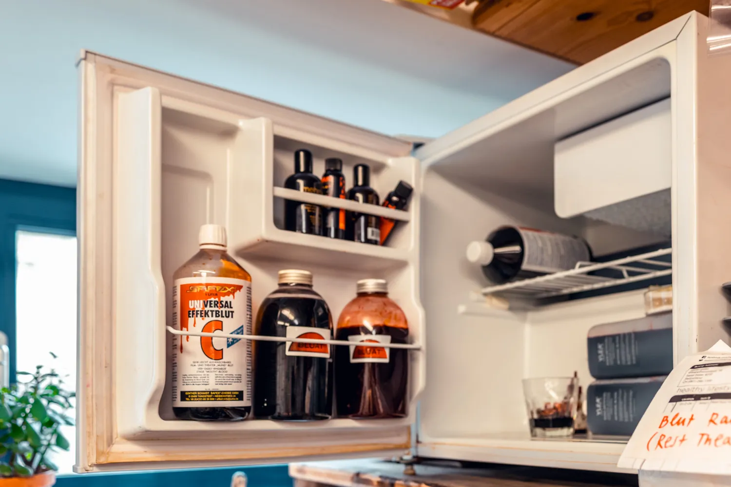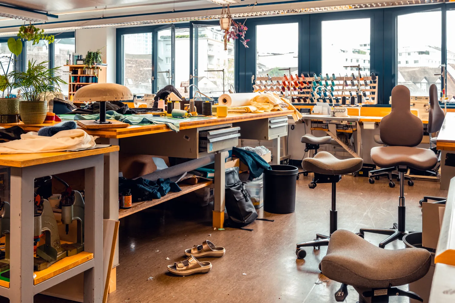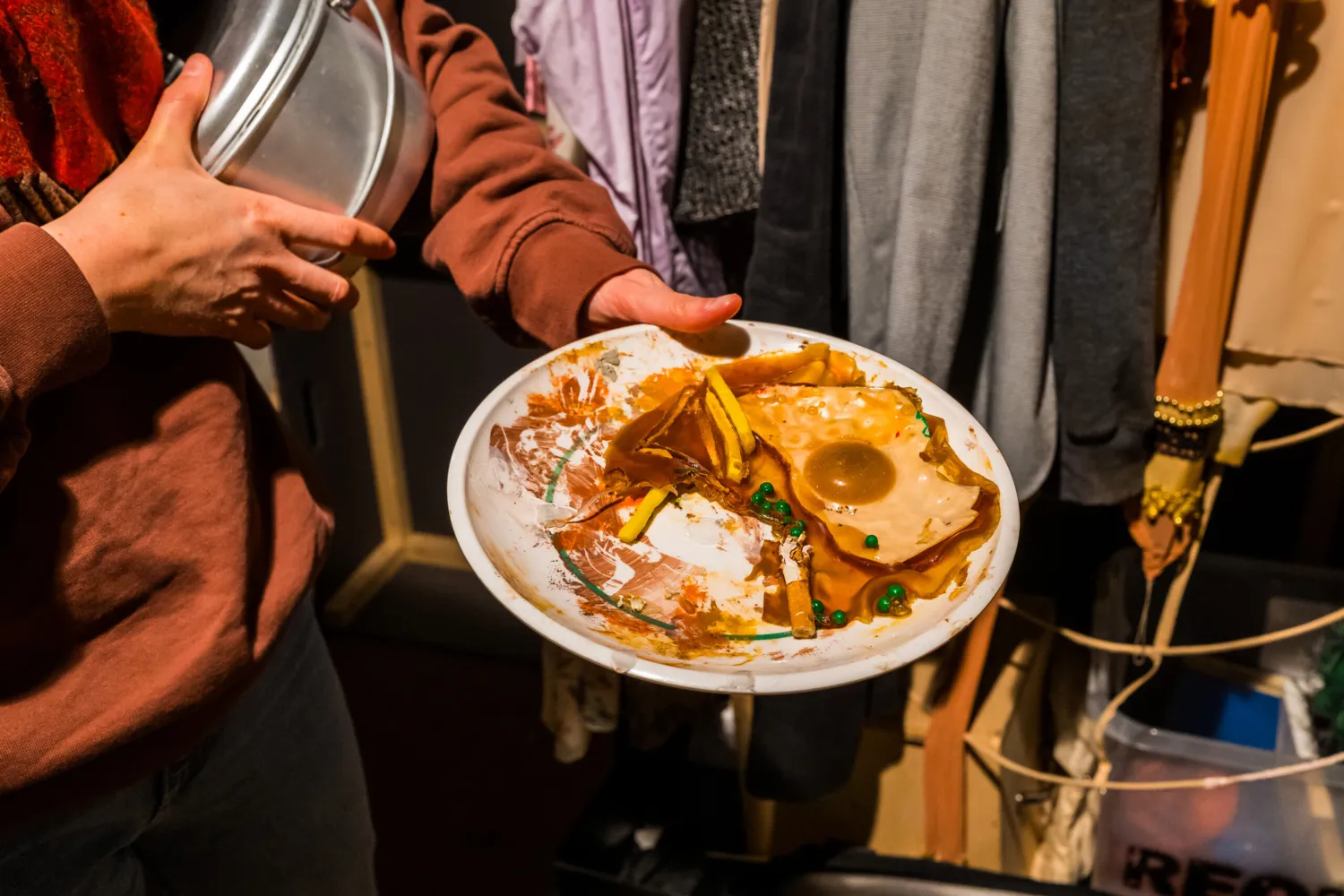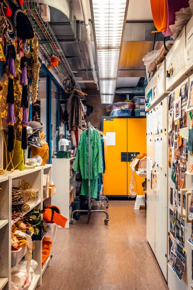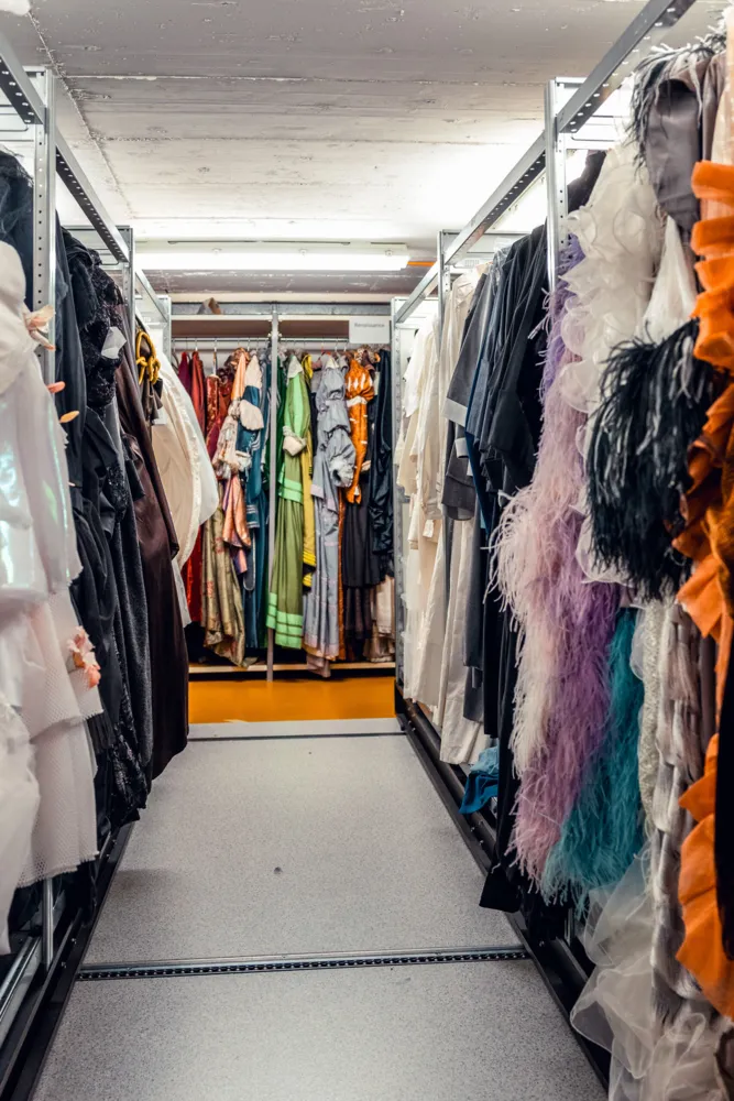 Wir machen uns wieder auf den Weg nach oben. Vorbei an Mitarbeitenden, die im Gang einen Tanzboden ausrollen. Anja zeigt mir Kunstschnee, auch «Hollywood-Schnee» genannt. In Tat und Wahrheit sind es Plastikfötzeli, die aussehen, als hätte man einen billigen Einweg-Plastiksack zerfleddert: «Wenn es im Theater schneit, beginnt das Publikum zu frieren, obwohl sich an der Temperatur nichts verändert», erzählt Anja. «Und genau das ist doch der Mehrwert vom Theater: Du befindest dich hier in einer Welt zwischen Fiktion und Realität. Kaum etwas ist hier echt. Aber alles sieht echt aus.» Das schmutzige Kleid, das Erbrochene auf dem Hemd – alles künstlich auf den Stoff appliziert. Die Leiche im Keller – aus Silikon. Das Spiegelei auf dem Teller – Papiermaché. «Universal Effektblut» lagert im Kühlschrank des Requisiten-Büros. Es riecht etwas gewöhnungsbedürftig nach Pfefferminz-Sirup und kann getrunken werden. Im Kostümfundus lagern tausende von Kleidern aus allen Epochen, in allen Farben, zu allen Themen. Hochzeitskleider soweit das Auge reicht. Was es noch nicht gibt, wird von Kostümbildnerinnen entworfen, im Schneideratelier genäht. Die engen Gänge sind voll mit Material, die Wände voller Ideen, nichts, was man hier nicht findet, das hier nicht entstehen kann.