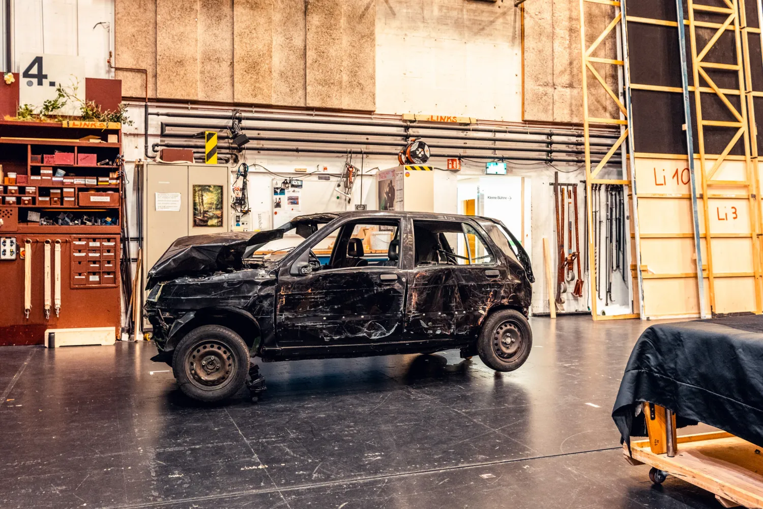 Überraschend riesig präsentiert sich die Grosse Bühne von hinten. «Sie ist genau doppelt so hoch und noch einmal so tief wie aus dem Zuschauerraum ersichtlich, damit Bühnenbilder und Vorhänge hochgezogen und im Boden versenkt werden können», flüstert Anja. Gerade findet eine Lichtprobe statt, Stille ist geboten. Für jede Produktion müssen 412 Scheinwerfer neu justiert werden. An der Wand steht in grossen Lettern: Nichts anstellen. Metallteile der aktuellen Ballettproduktion verdecken Teile des Schriftzugs. Wir kommen an einem Unfallauto (eine Requisite) vorbei und steigen über ein paar Metallrohre zu einer schmalen Türe im Dunkeln: Das Vorhanglager. Aufgerollte Stoffe soweit das Auge reicht. Nummeriert und angeschrieben mit «Samt-Soffitten», «Portalschleier» oder «Operafolien». «Um einen neuen Vorhang aufzuhängen, braucht es jeweils 14 Mitarbeitende», weiss Anja. Und dann erblicke ich ihn: Den grössten Lift, den ich je gesehen habe. 8.8 Meter hoch. Mit ihm werden nachgebaute Häuser, Flugzeuge oder Eisenbahnwaggons transportiert. Sogar eine Giraffe hätte hier noch Luft nach oben.