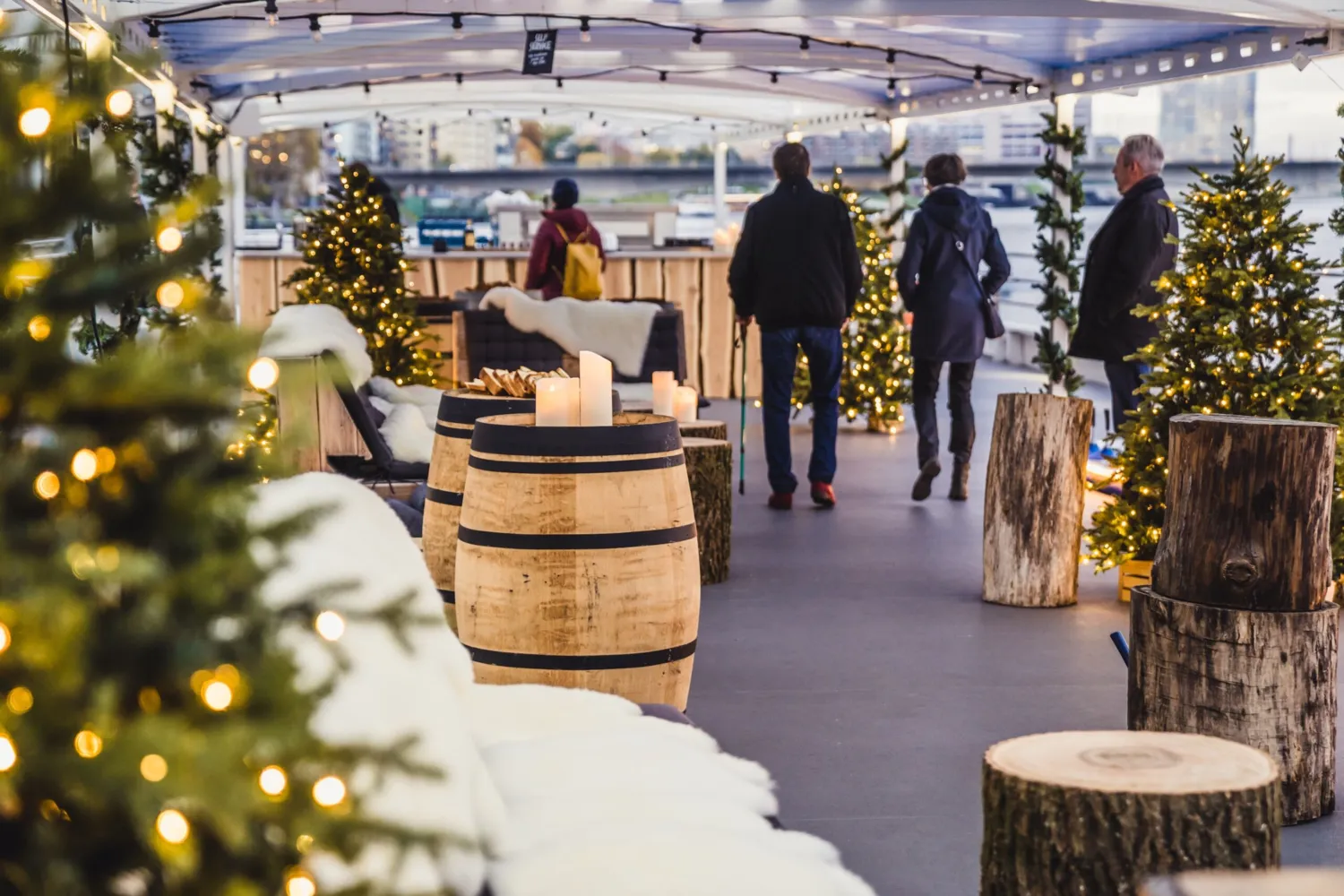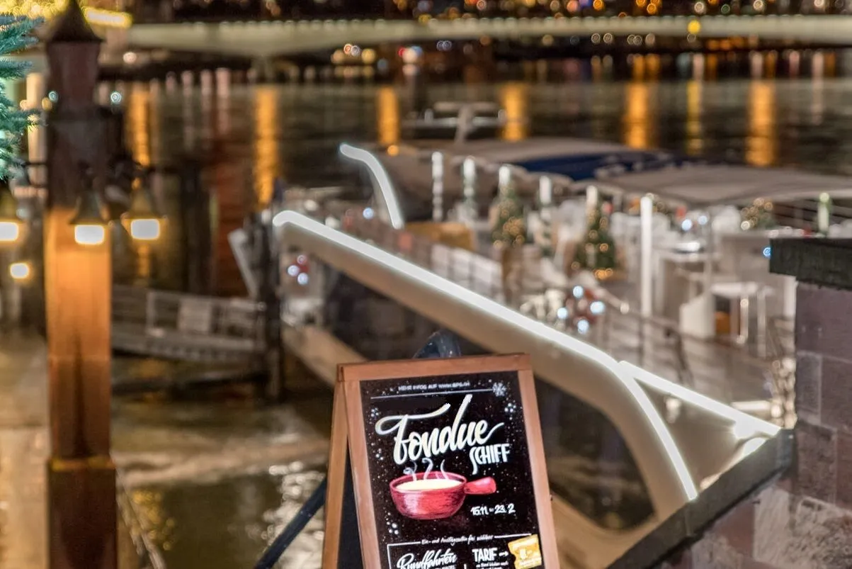Vom 7. November bis 20. Dezember jeweils Dienstag- bis Samstagabend und vom 9. Januar 2025 bis 1. März 2025 jeweils Donnerstag- bis Samstagabend haltet der Rhystärn stündlich an der Schifflände und lädt ein zur winterlichen Genussfahrt. Das Restaurant serviert neben der regulären Karte auch Fondue Chinoise und ein Käsefondue-Genuss-Menü mit einer rezenten Hausmischung vom Milchüsli beider Basel und Beschle Brot.