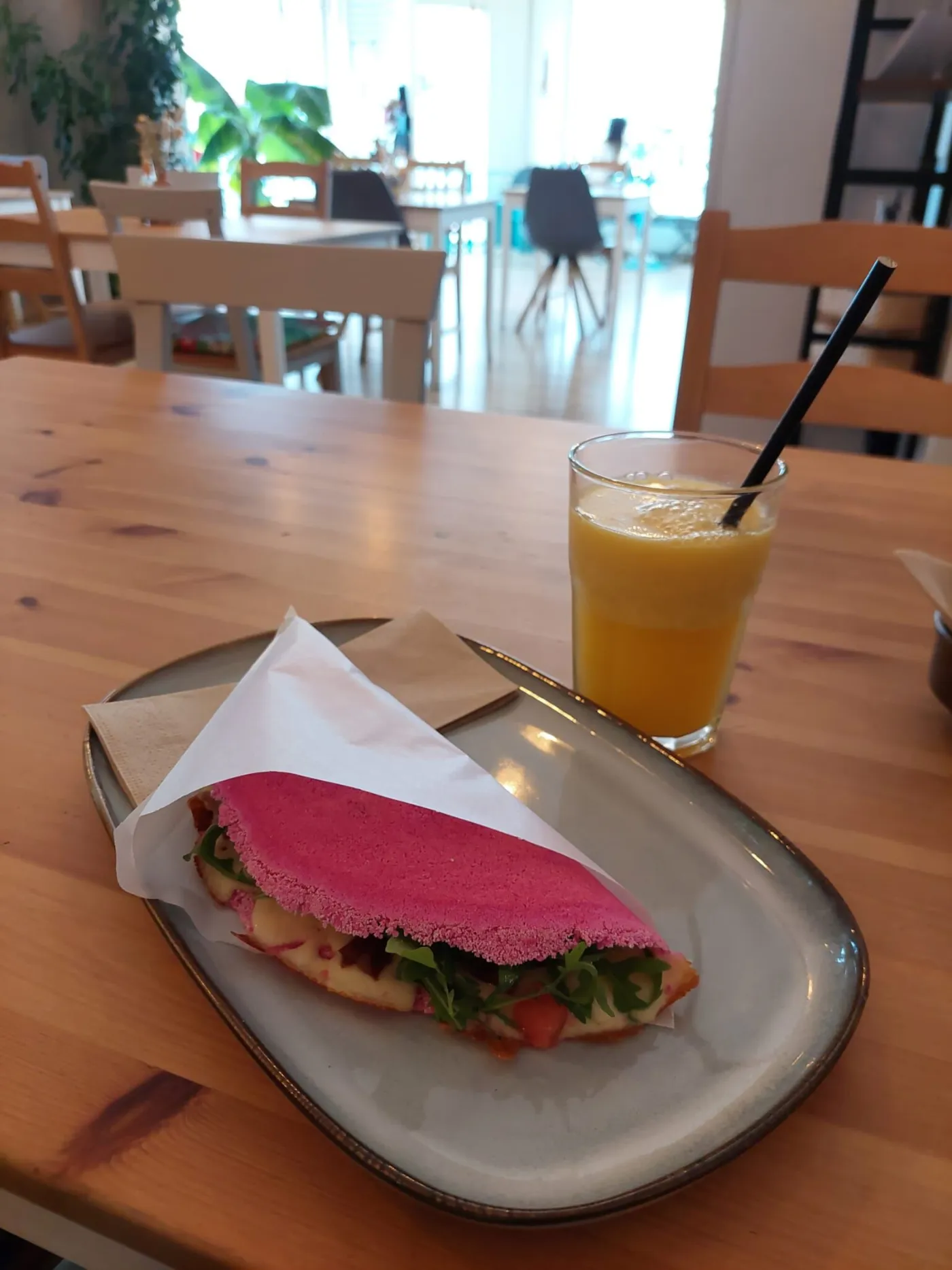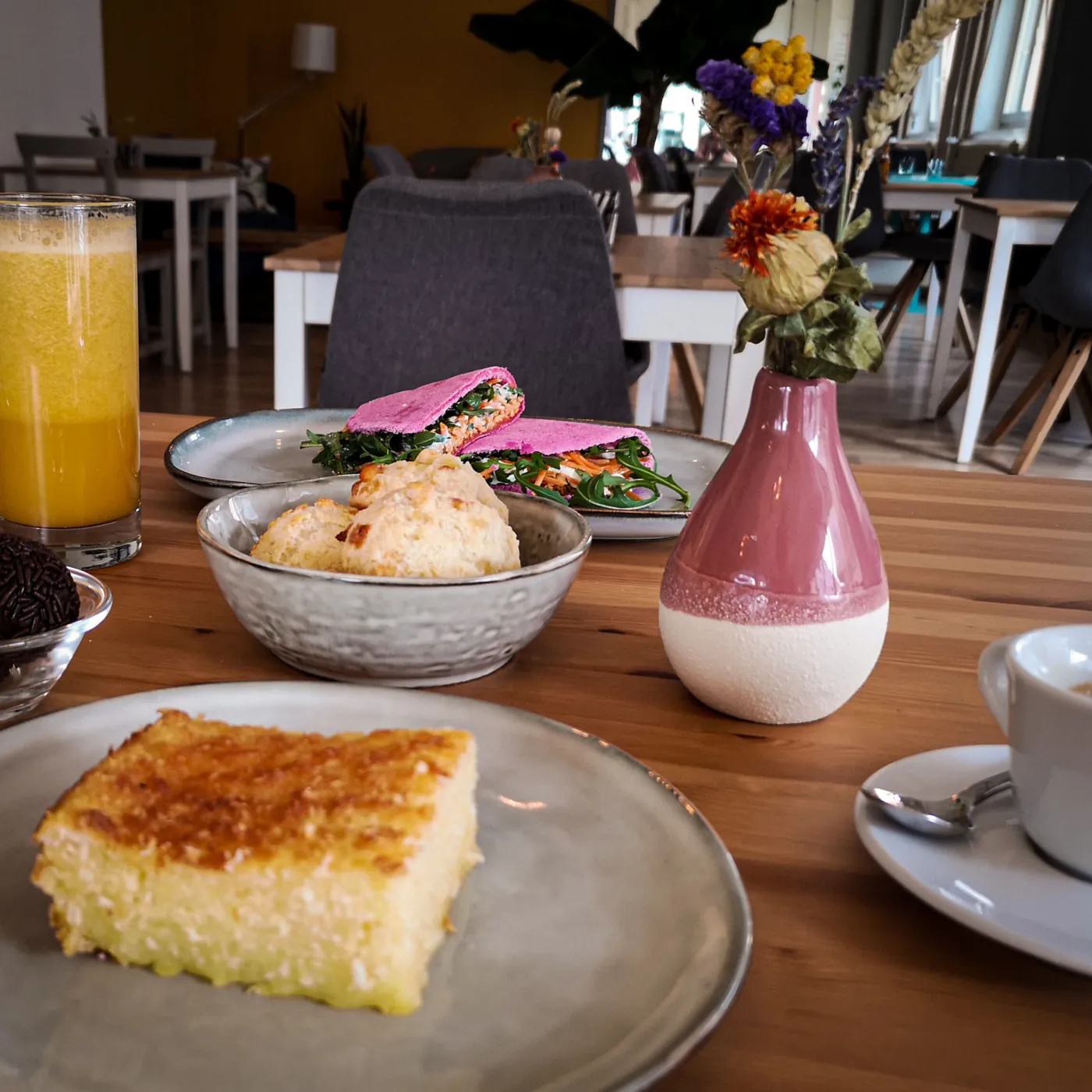 Gemeinsam mit ihrem Partner Guilherme, ihrem Schwager und ihrer Schwester führt sie seither das helle Restaurant im schönen Eckhaus. Mit einem kleinen Aussenbereich, gelben Wänden und vielen Pflanzen lädt der Ort zum Verweilen ein und bietet selbst bei regnerischem Wetter eine kleine Sommeroase. Auf der Speisekarte sind der Star die Tapiocas, die es in süss und salzig gibt, wobei der Belag den Geschmack bestimmt. Der Teig an sich ist relativ neutral, selbst bei der pinkfarbenen Variante, die mit roter Beete gefärbt ist, wiegt die knallige Farbe stärker als der Geschmack. Gefüllt mit Käse und Gemüse oder Fleisch sind die Tapiocas ein perfektes Mittagessen und erinnern an eine italienische Piadina.