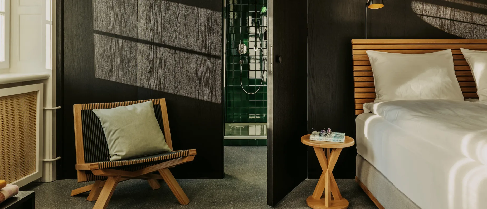 «Tatsächlich sind wir sehr kreativ mit dem vorgegebenen Budget umgegangen», verrät Ascan Mergenthaler. «Manchmal haben wir uns für wertvolle Materialien entschieden und gesagt: das leisten wir uns jetzt. Dann wiederum gibt es Bereiche, wo wir mit einfachen Standards arbeiteten. Ein gutes Beispiel ist die Waschtisch-Armatur. Das ist eine Standard-Gastro-Armatur. Aber durch die sehr schöne, von hinten lackierte Glasfläche dahinter wirkt das Ganze wertig. Die Kombination macht’s! Die Holzverkleidung der Nasszellen ist wiederum sehr aufwändig.» Grundsätzlich war es Architekten und Bauherren wichtig, mit dem Hotel etwas zu schaffen, das die nächsten paar Jahrzehnte Bestand hat. Das geht nur mit wertigen Materialien, die gut altern. Daher auch das Credo der Architekten: Ihre Gebäude und Innenräume sollen mit den Jahren schöner werden, allenfalls eine Patina erhalten.