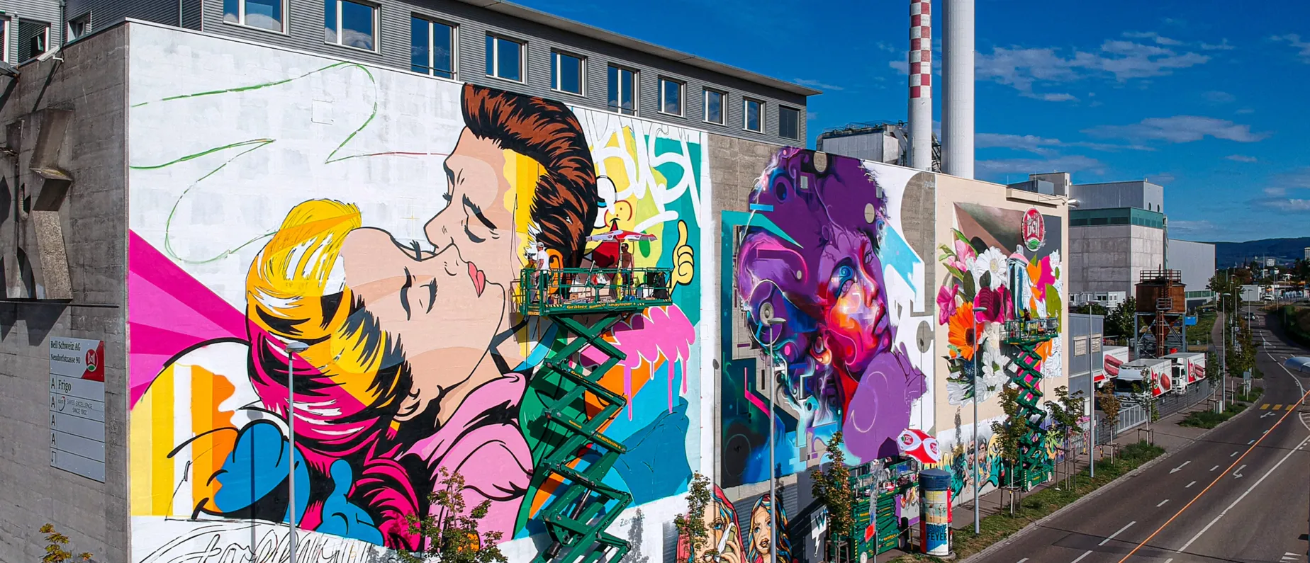 Mit «Change of Colours» findet beim Bell-Areal der grösste Urban-Art-Event der Schweiz statt. Hoch oben auf den Hebebühnen zeigen internationale Streetart-Grössen wie Mr. Cenz (UK), Chromeo und Bane (CH) und Bustart (CH) was sie aus einer grauen ca. 800m2 Wandfläche alles zaubern können. Jeder der drei bringt dabei seine eigene Stärke zum Ausdruck. Der Streetartist Mr. Cenz ist international für seine einzigartigen, ausdrucksstarken Frauenporträts bekannt, Chromeo und Bane stehen für traumhaften Welten voller Magie und Botschaften mit Tiefgang und Bustarts Stil ist von Cartoons und Pop Art geprägt.