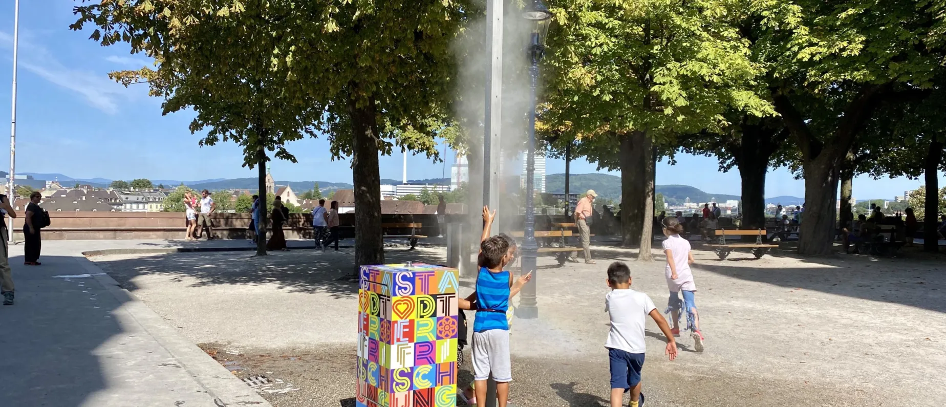 Über kleine Zerstäuberdüsen kommt auf Knopfdruck für rund 30 Sekunden feiner kühlender Nebel aus der Säule. Das Wasser dafür bezieht die Nebeldusche von einem angeschlossenen Hydranten – der Wasserverbrauch ist dabei sehr bescheiden. So leistet Flâneur einen kleinen Beitrag zur lokalen Erfrischung in Zeiten, in denen es zum Flanieren eigentlich zu heiss ist. Jeweils von 11 bis 22 Uhr sind die kühlenden Frischespender eingeschalten. Gönn dir auf deinem Weg eine kleine Abkühlung, tanze mit deinen Kindern um die Nebelsäule herum und geniess den Zauber der Stadt – auch an Hitzetagen wie diesen.
