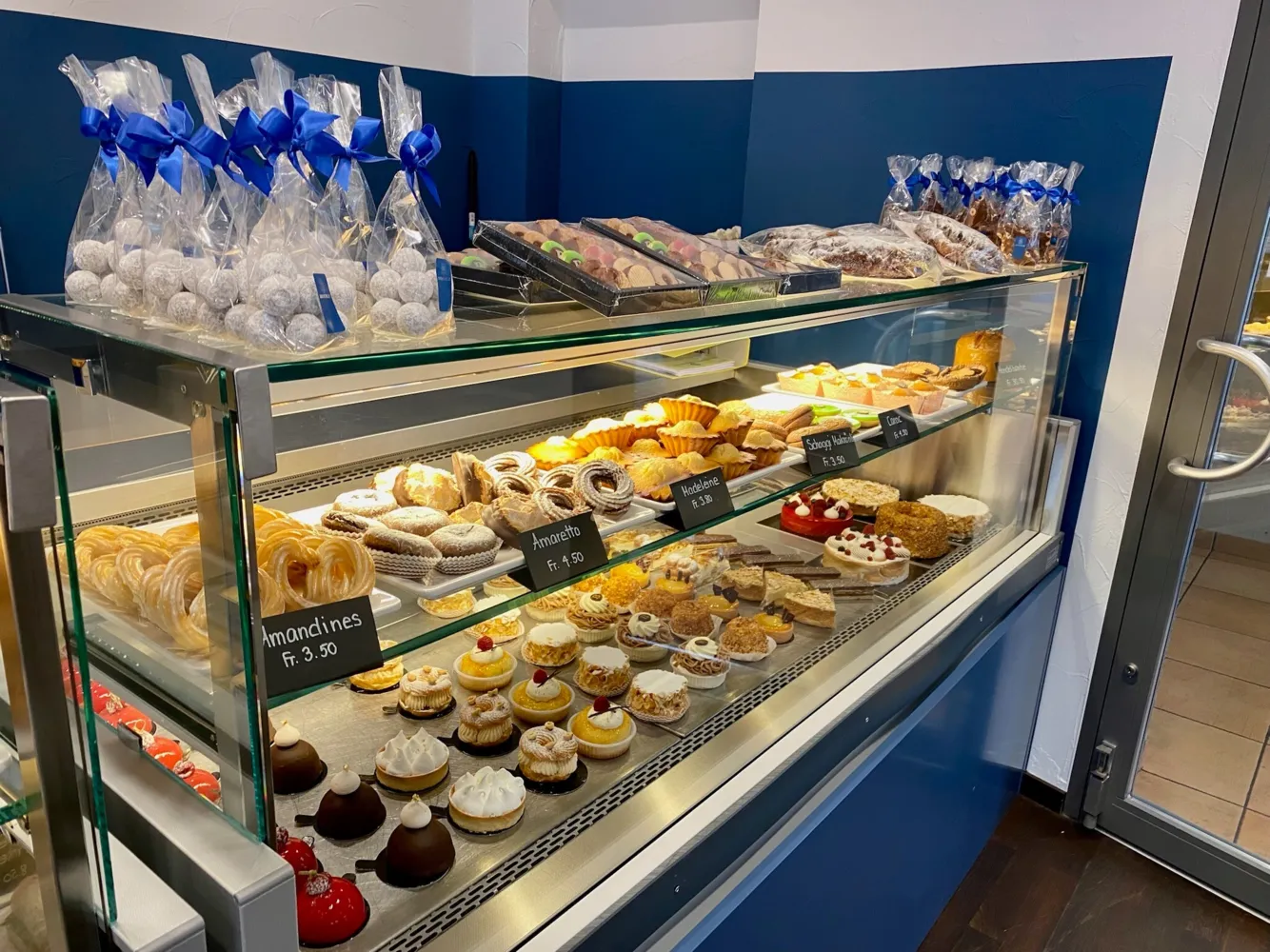 Alle guten Dinge sind drei! Bereits im Kleinbasel und in der Aeschenvorstadt anzutreffen, freut sich nun auch die Altstadt über einen neuen Genussort mit feinsten Pâtesserie- und Schokoladenspezialitäten. Bereits schon von aussen – durch die grossen Fensterfronten – zu erkennen: Eine blaue Vitrine bestückt mit vielen süssen und salzigen Versuchungen, die nur darauf warten, vernascht zu werden. Frischgebackene Brote, bunte Sandwiches, handgemachtes Feingepäck, Torten und Wähen – gelandet bist du nicht im Feinschmecker-Himmel, sondern in der neueröffneten Beschle-Filiale an der Schneidergasse 21. Dein Mandelgipfel, Schoggiweggli, Linzertörtli oder Brioche gibt es nicht nur To-Go, sondern auch für das kleine Päuschen zwischendurch – Sitzgelegenheiten, inklusive bequemem Sofa, gibt es genug!