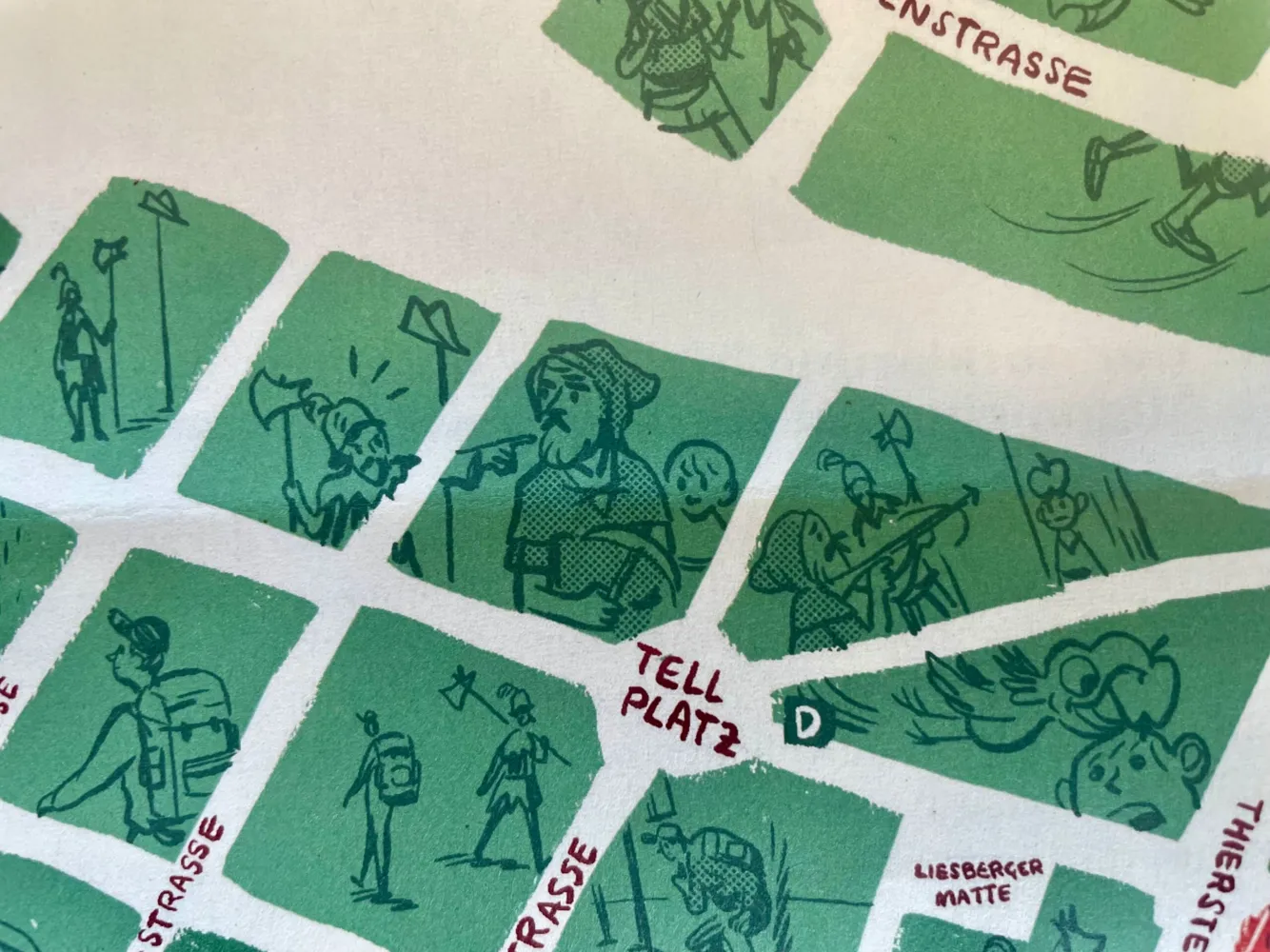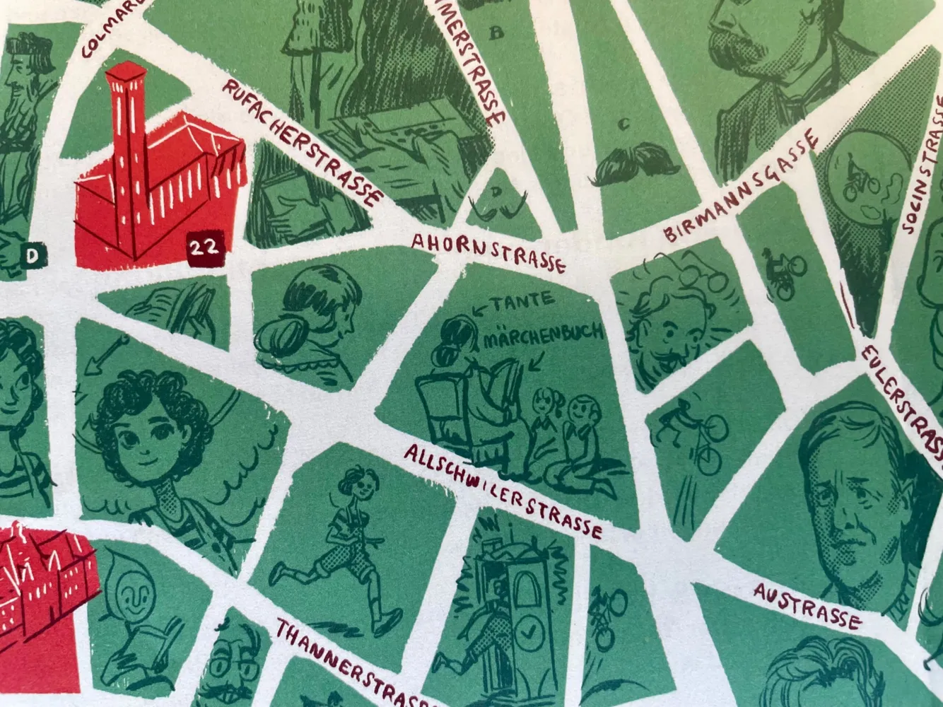 Einen besonderen Charme und Witz üben die gezeichneten Autorinnen und Autoren, Romanfiguren, sowie sonstigen literarischen Gestalten aus, die dir anstelle der Häuserblöcke entgegenblicken und vom Basler Grafiker Raphael Gschwind gestaltet wurden. Was hat Wilhelm Tell im Gundeli verloren? Welcher Zusammenhang besteht zwischen Hermann Hesse und der Rheingasse? Aus welchem Märchenbuch liest Märchentante Trudi Gerster im Gotthelf-Quartier vor? Und was sucht eigentlich Batman am Steinenring neben der Pauluskirche? Der neue Buchstadtplan lädt zum Rätselraten ein – Hinweise zur Auflösung findest du auf buchraumbasel.ch