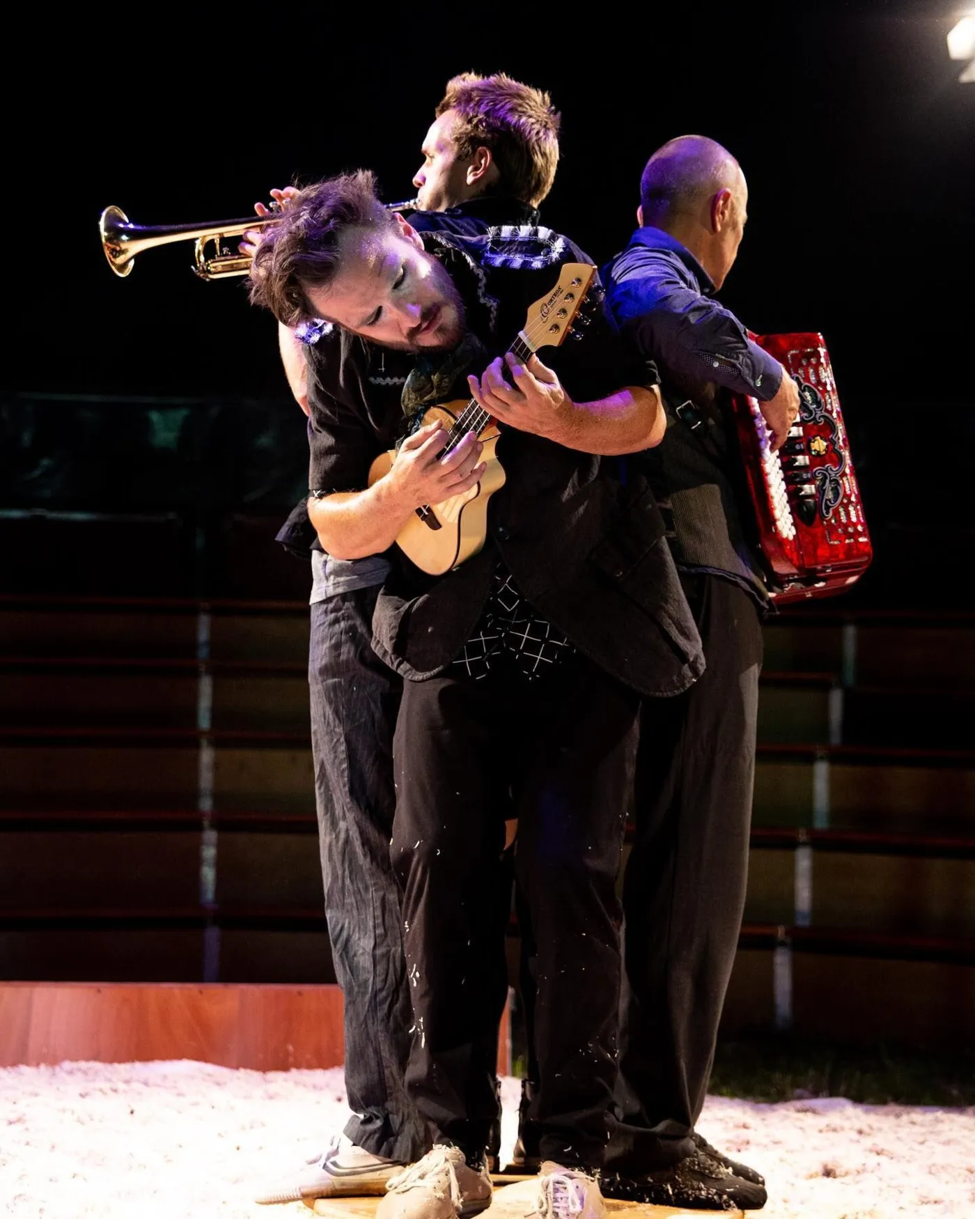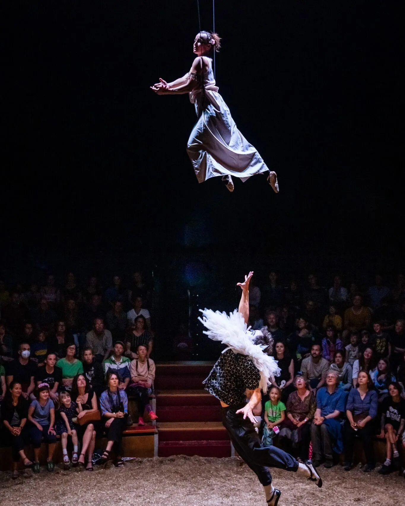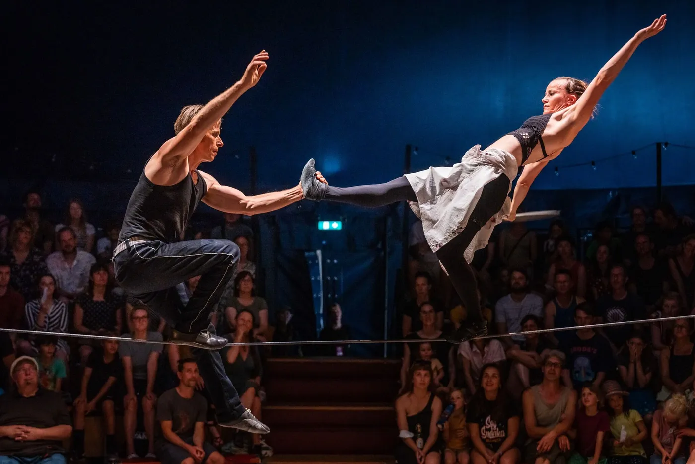 Die Compagnie Roikkuva besteht aus vier Künstlerinnen und Künstlern, die alles selber machen. Sie balancieren auf Seilen, machen Saltos, werfen Keulen, schleppen Requisiten, spielten Instrumente und vieles mehr. Hier wird nichts versteckt. Keine Cowns lenken das Publikum ab, während die Kulisse umgebaut wird. Es gibt keine Raubtiere und keine Pferde. Obwohl … Jedenfalls machen die vier alles allein, den ganzen Zirkus, und das mal ruhig, mal wild, mal verträumt und oft etwas verschroben.