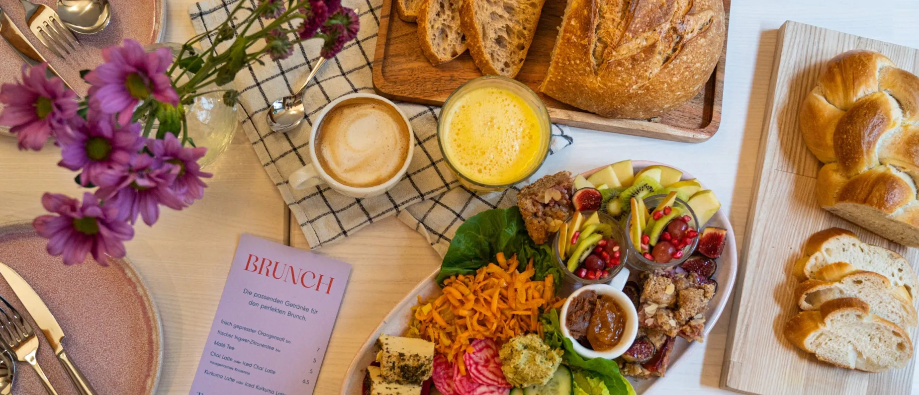 Empfohlen wurde mir der Brunch: eine Platte mit Kürbisdip, einem etwas faden Sojajoghurt, knackigem Salat, Rande, Fenchel und Gurke, Kimchi, ultraleckerem veganem Feta, ein bisschen Bergkäse, Rüeblisalat, Früchten und eme Luusmeitli (Pendant zum Spitzbüebli).