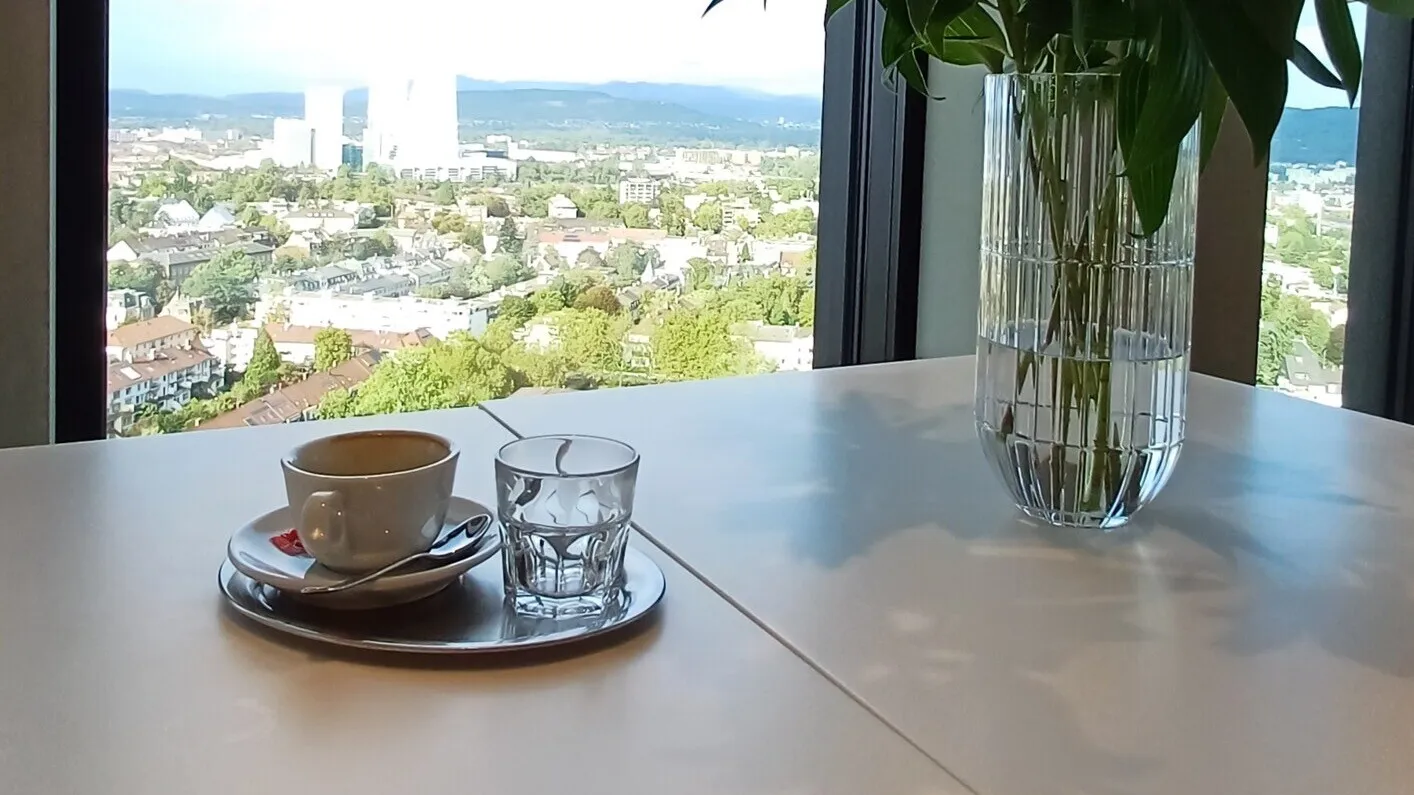 Allein die Fahrt mit dem Hochgeschwindigkeitsfahrstuhl ist ein Erlebnis, auch wenn die Handhabung anfangs gewöhnungsbedürftig ist. In Windeseile ist man dann im 21. Stock, biegt einmal nach rechts und bleibt erstaunt stehen – zumindest beim ersten Mal. Denn der Blick durch die Riesenfenster lässt einen innehalten, während das Auge versucht, die Ausmasse und die Weite zu verarbeiten. Rechts im Blick der Schwarzwald, links die Vogesen. Unter einem Miniaturautos, die Richtung Autobahn oder Stadt fahren, Miniaturzüge, die den Bahnhof verlassen oder ansteuern. Bei der Grösse der Fenster braucht es eigentlich gar keinen Fensterplatz, um den Ausblick zu geniessen, aber natürlich ist man da noch näher dran.