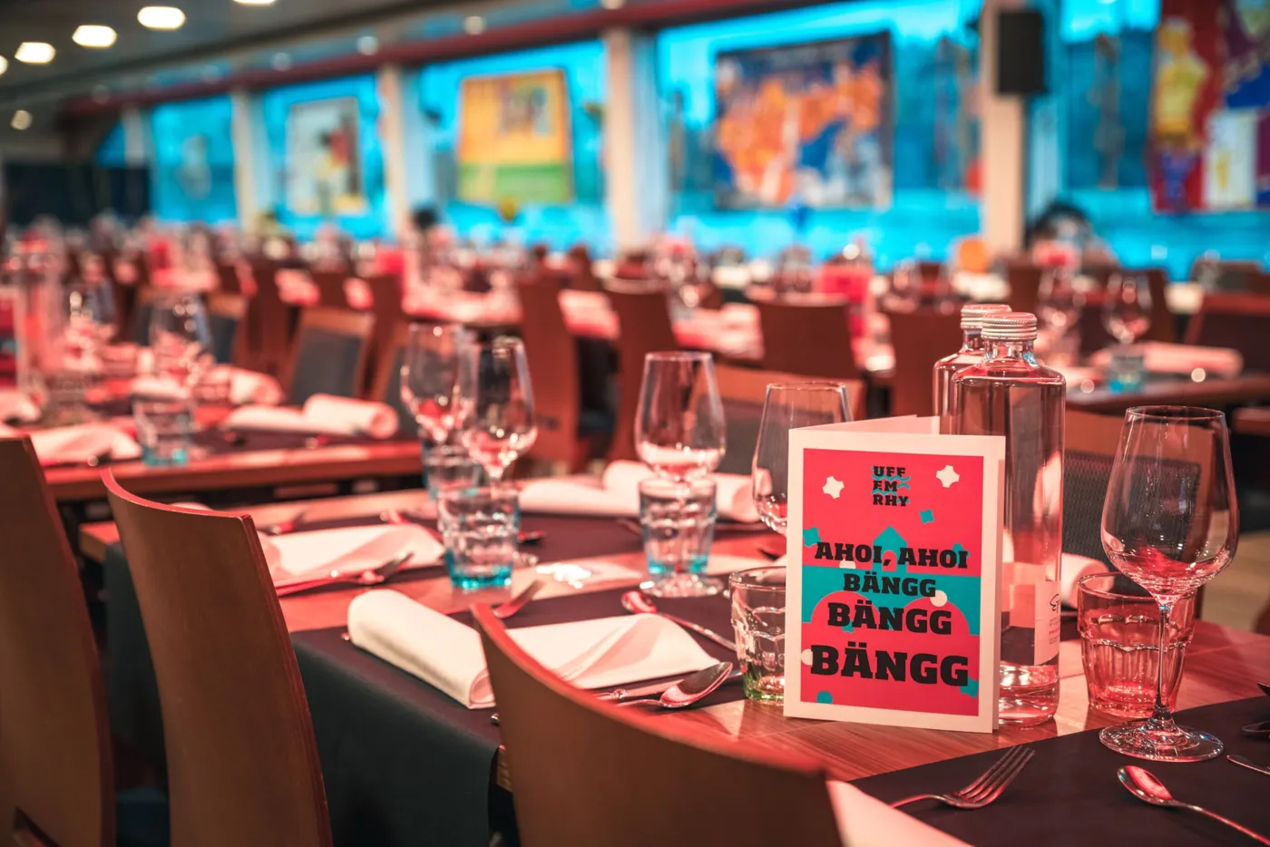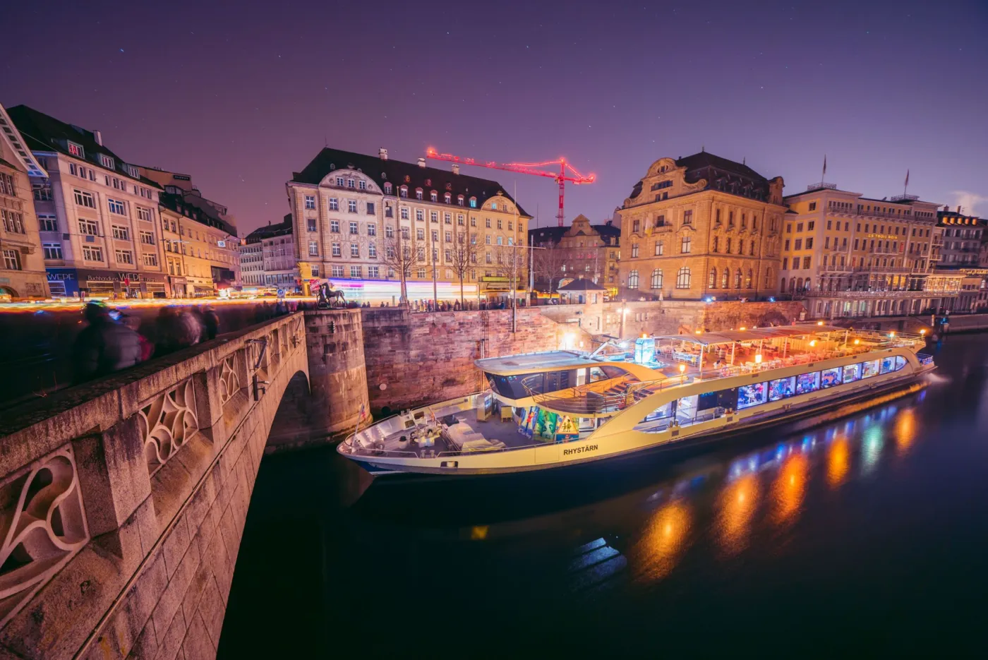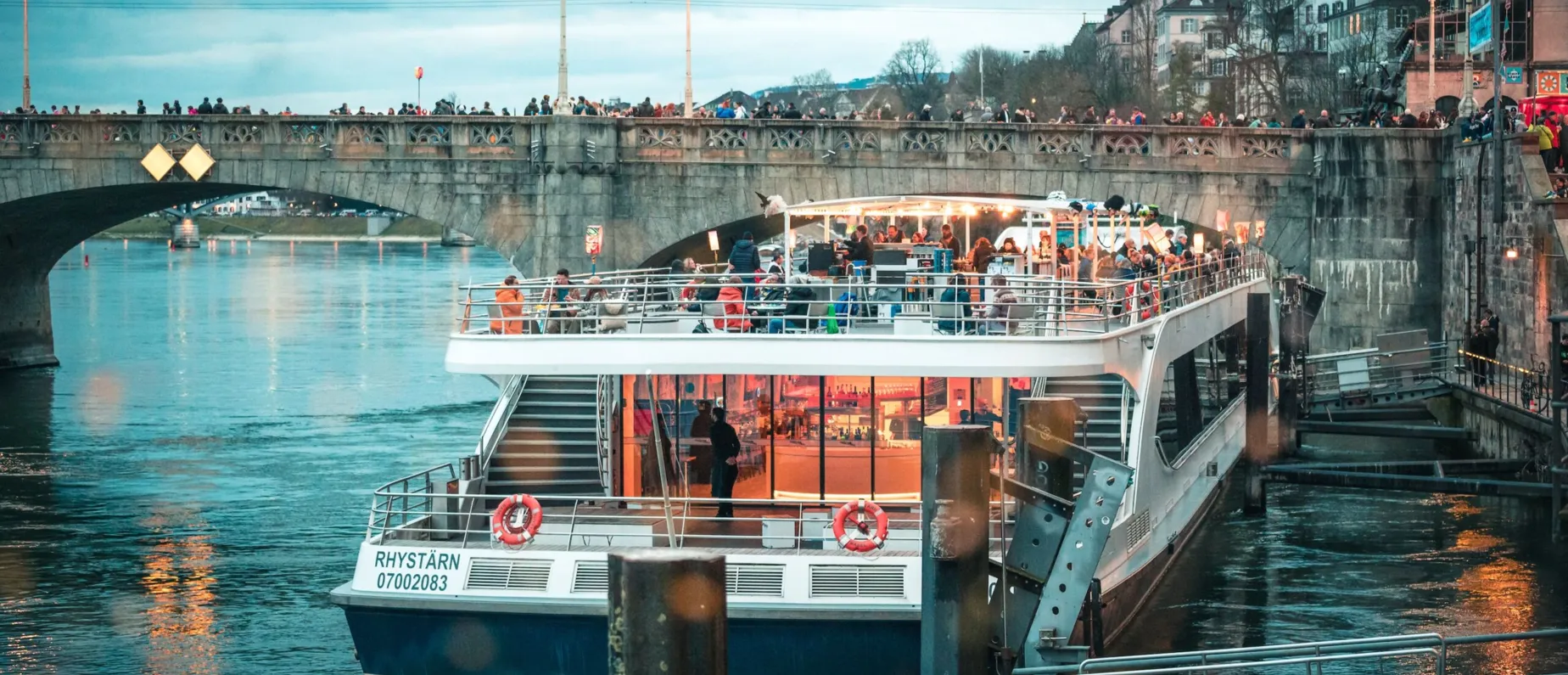 Ein Spitzbueb zur Vorspis, d‘ Gryysel als Hauptgang und der Doggter FMH zum Dessert. Ja, die besten Schnitzelbängg der Stadt triffst du nicht nur in den Fasnachtsbeizen und Cliquekeller «an Land» an, sondern ebenfalls uff em Rhy – auf der schwimmenden Fasnachtsinsel Rhystärn. Denn wenn die Cliquen, Guggen und Waggis durch die Strassen ziehen, es Räppli regnet und es auch in den engsten Altstadt-Gässlein pfeift und trommelt, dann herrscht auch auf dem Rhein Hochbetrieb. Bereits ab Sonntagmittag, 22. Februar bis und mit Fasnachtsmittwoch, 25. Februar wird der Rhystärn an der Schifflände zum Treffpunkt für alle, die die Basler Fasnacht mitten im Geschehen – auf der Achse zwischen Klein und Grossbasel – erleben möchten. Mit Lieblingsmenschen, Guggenkolleginnen und -kollegen, Clique-Gspänli oder neuen Fasnachtsbekanntschaften.