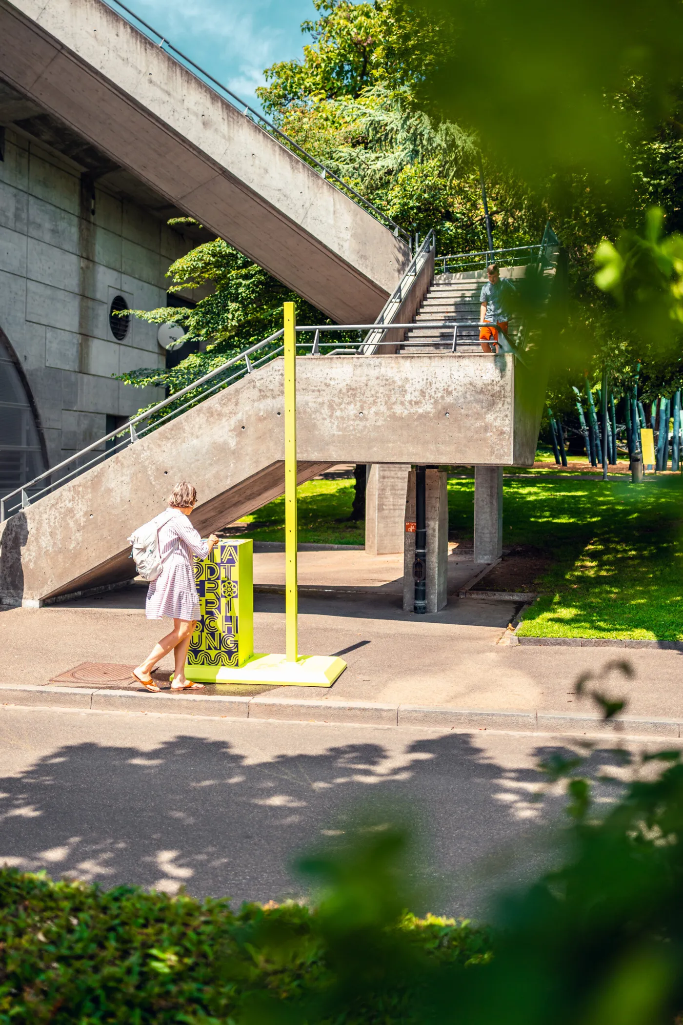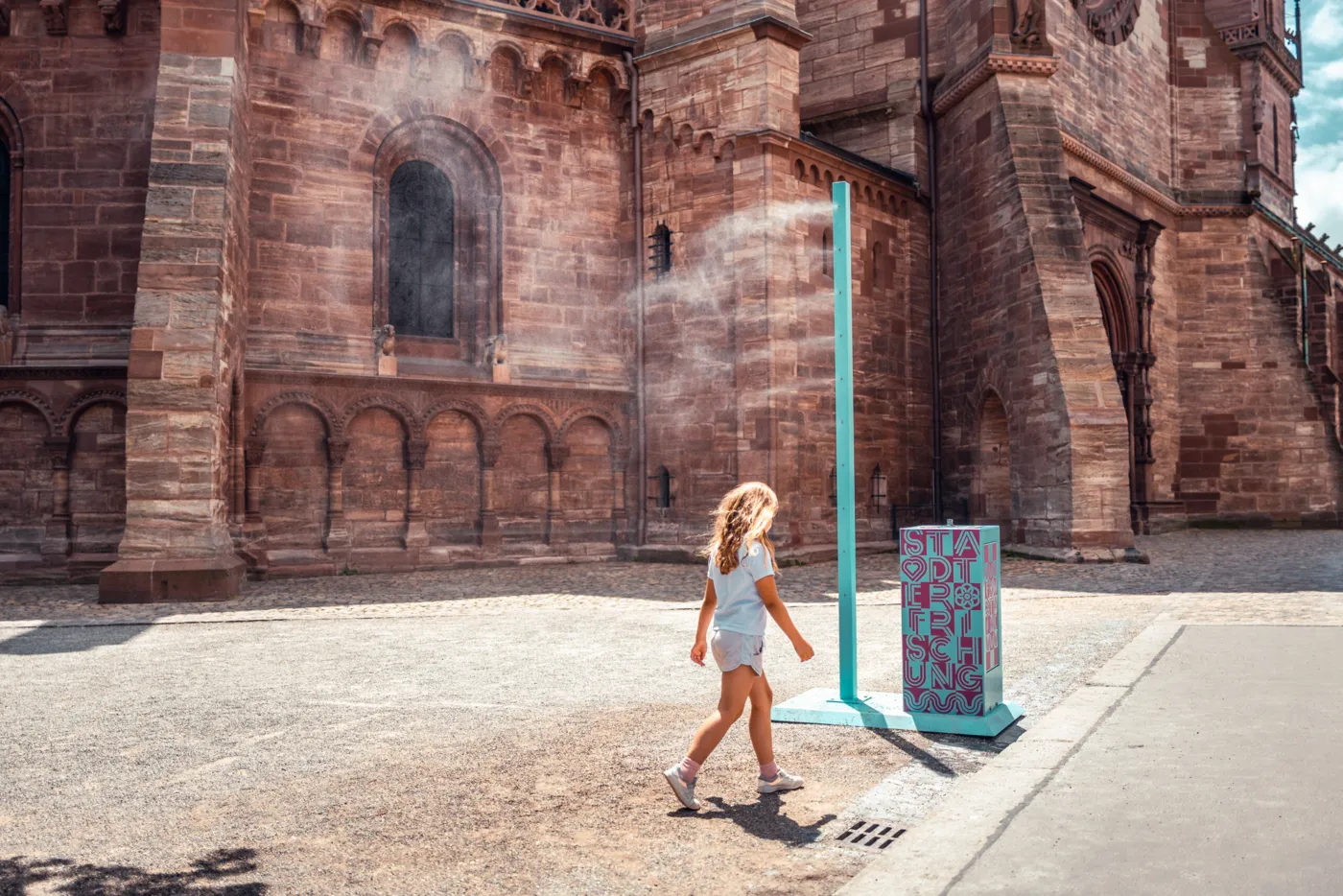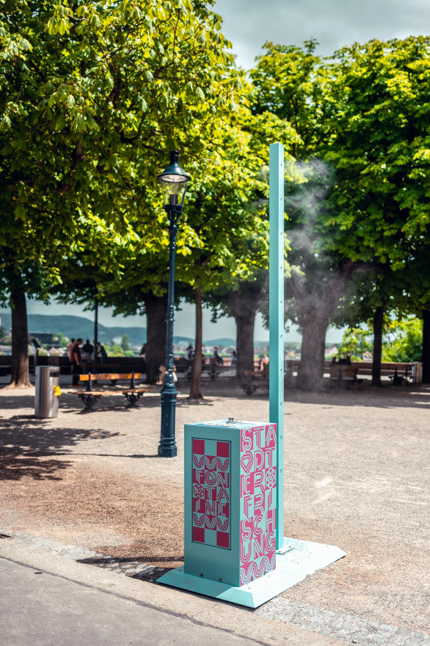 Acht Sprühnebler sorgen bis September für Abkühlung in der sommerlichen Stadt. Drückst du auf den Knopf der «Fontaine», kommt über kleine Zerstäuberdüsen für rund 30 Sekunden ein feiner Nebel aus der Säule. Das Wasser dafür bezieht die Nebeldusche jeweils von einem angeschlossenen Hydranten – mit äusserst geringem Wasserverbrauch. Die kühlen Frischespender sind jeweils von 11 bis 22 Uhr eingeschaltet.