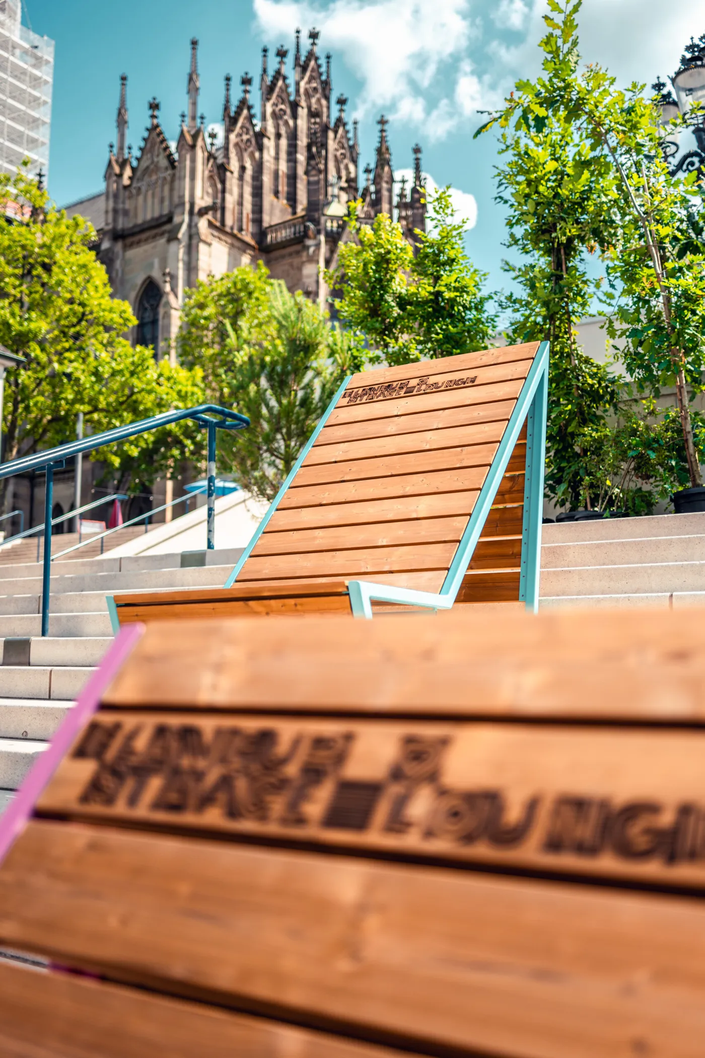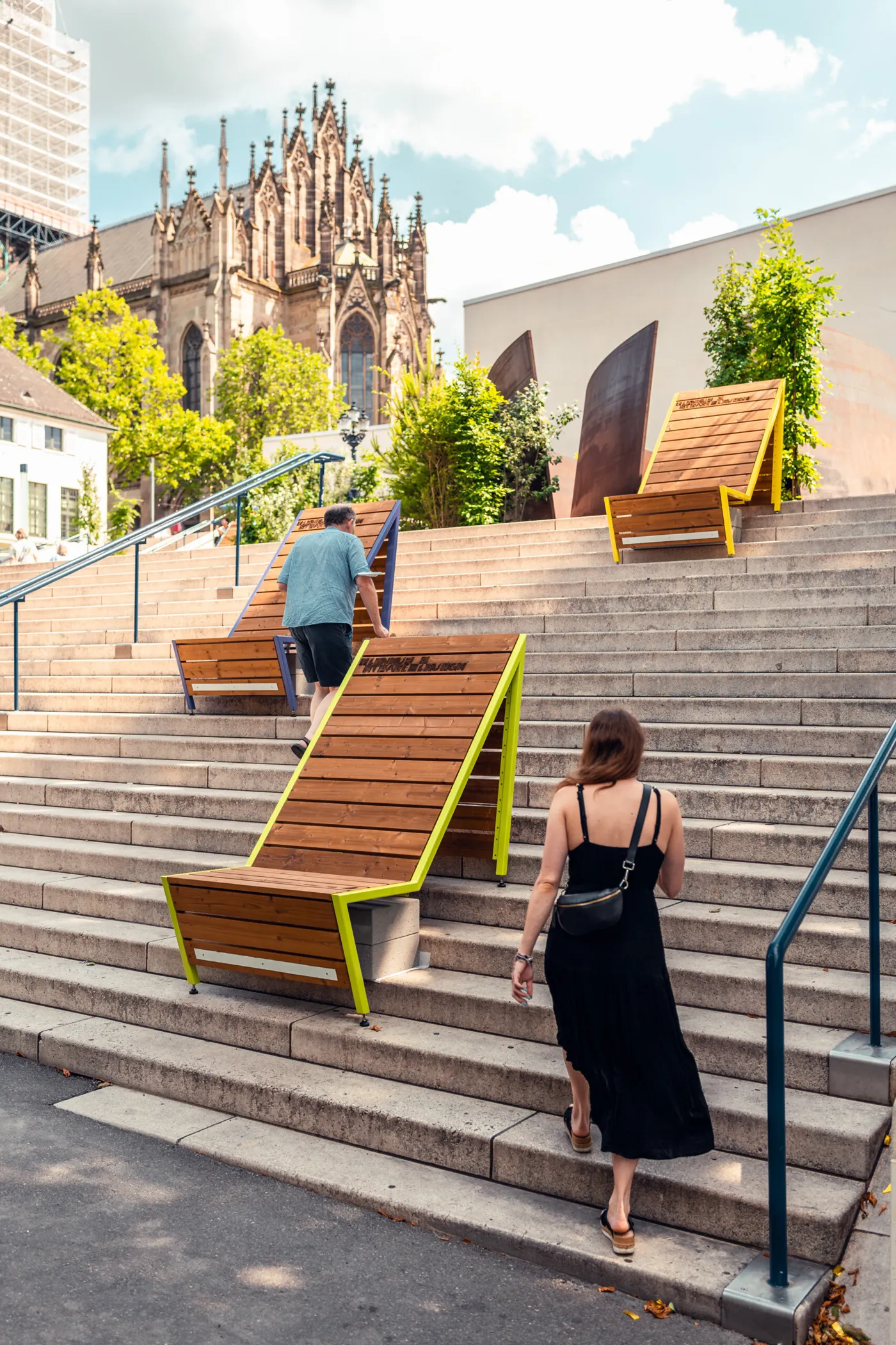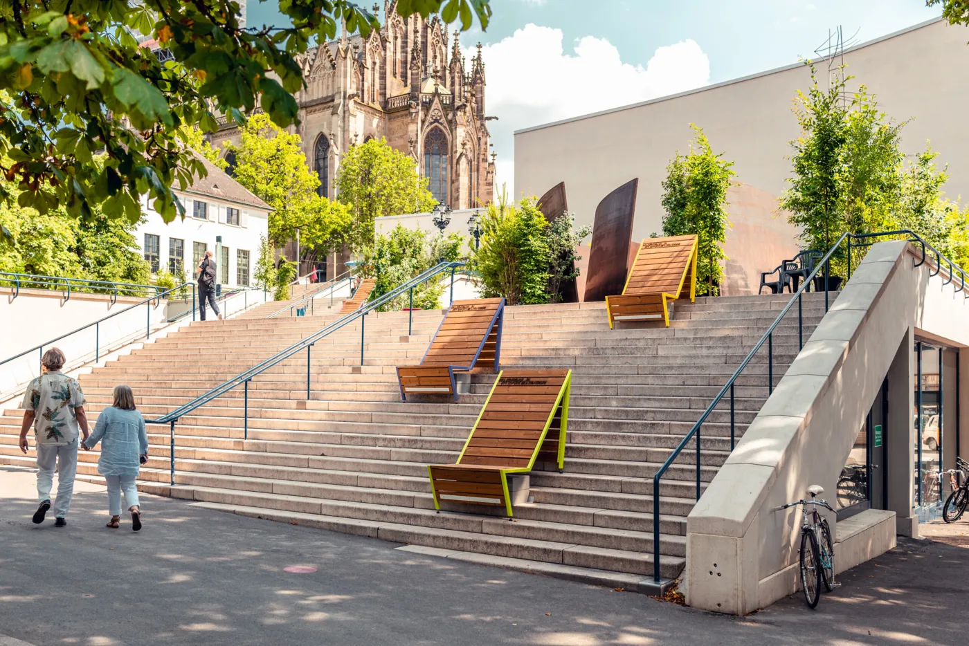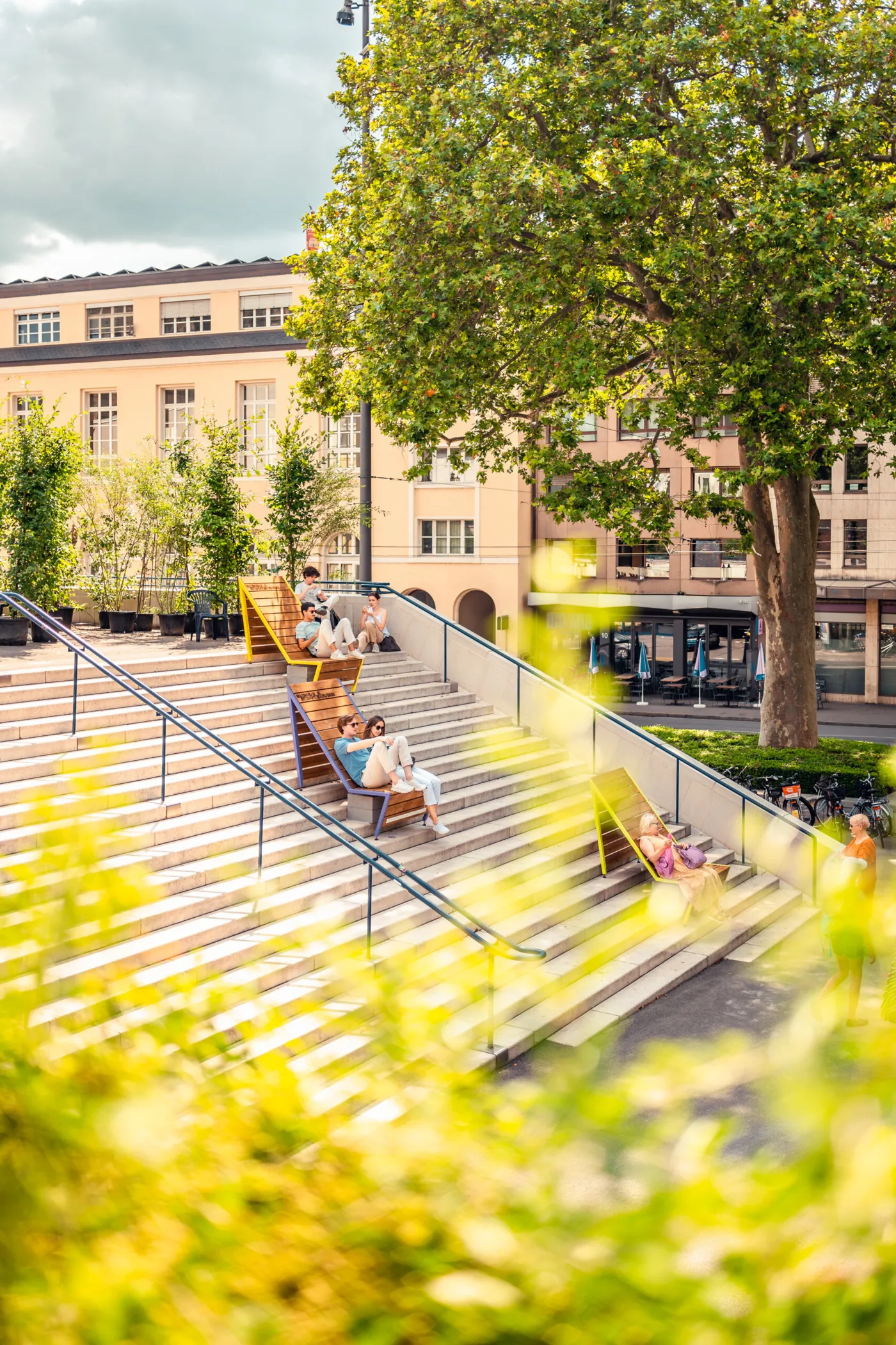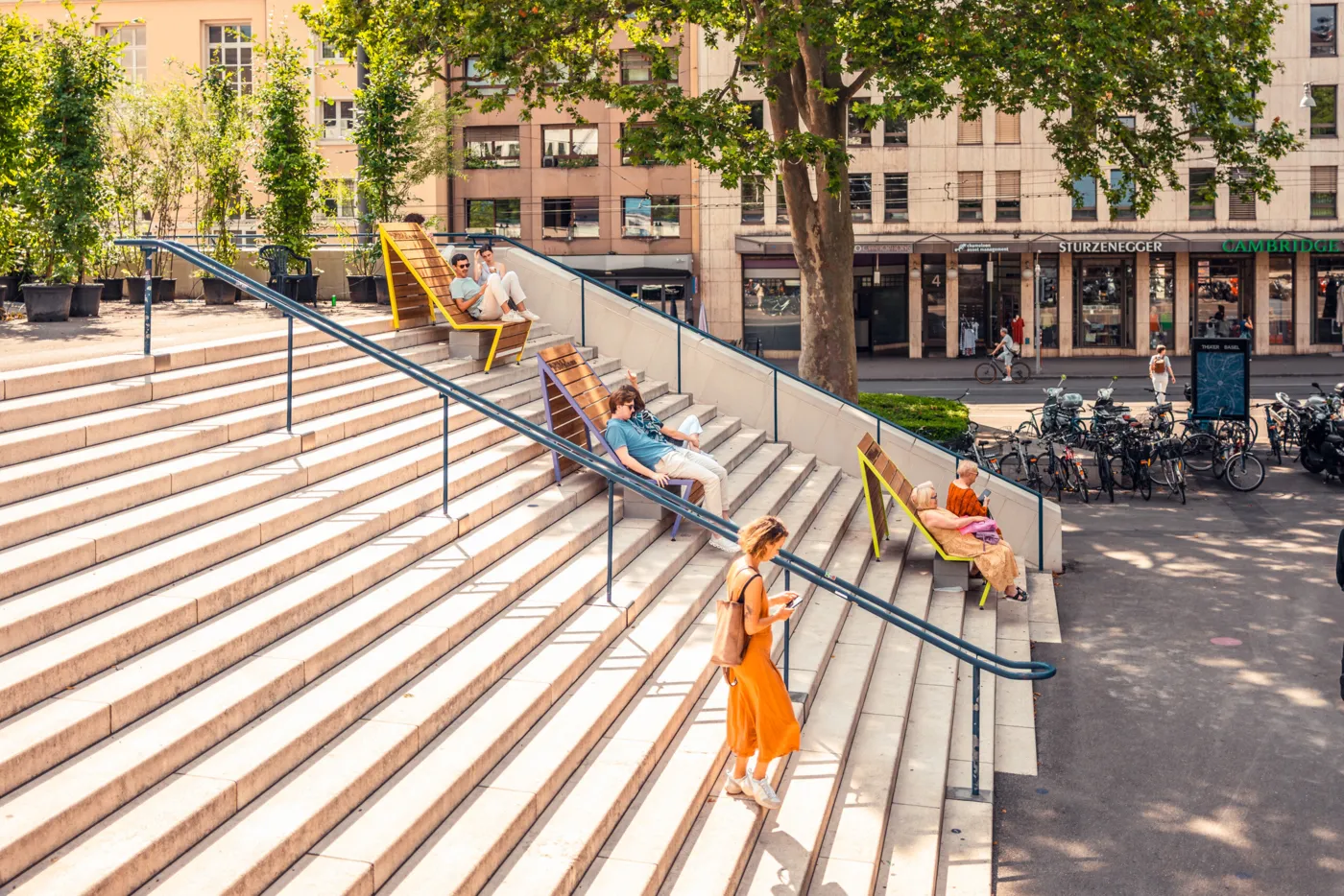 «Stääge Lounges» nennen sich die Sitzgelegenheiten, die bis im Oktober rund ums Theater Basel montiert sind. Sie wollen dich animieren, beim Rauf- oder Runterrennen kurz auszusteigen und ein paar Minuten Pause zu machen.