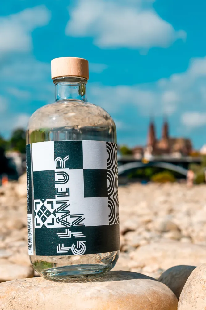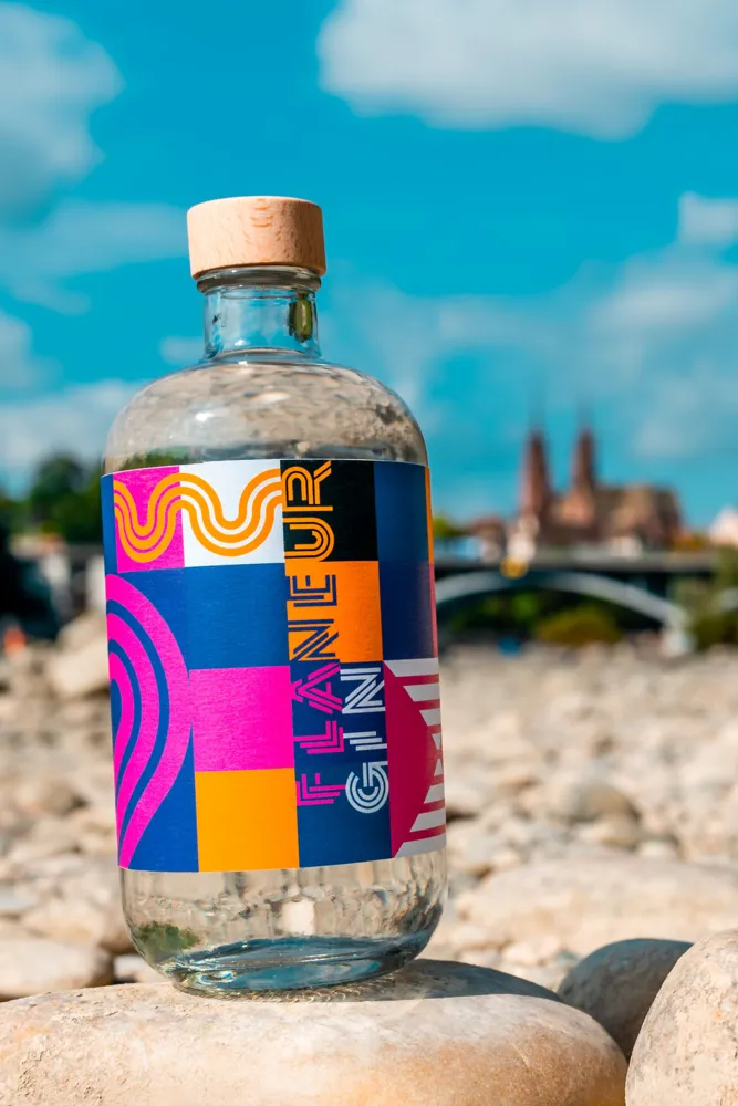 Flâneur verkörpert die Vielfalt Basels und die Freude an der eigenen Stadt. Das Gin Lab Basel hat das Festival in eine Flasche gefüllt und den Flâneur Dry Gin kreiert. Er besticht durch Aromen von Wacholderbeeren, Orange, Grapefruit und rosa Pfeffer.