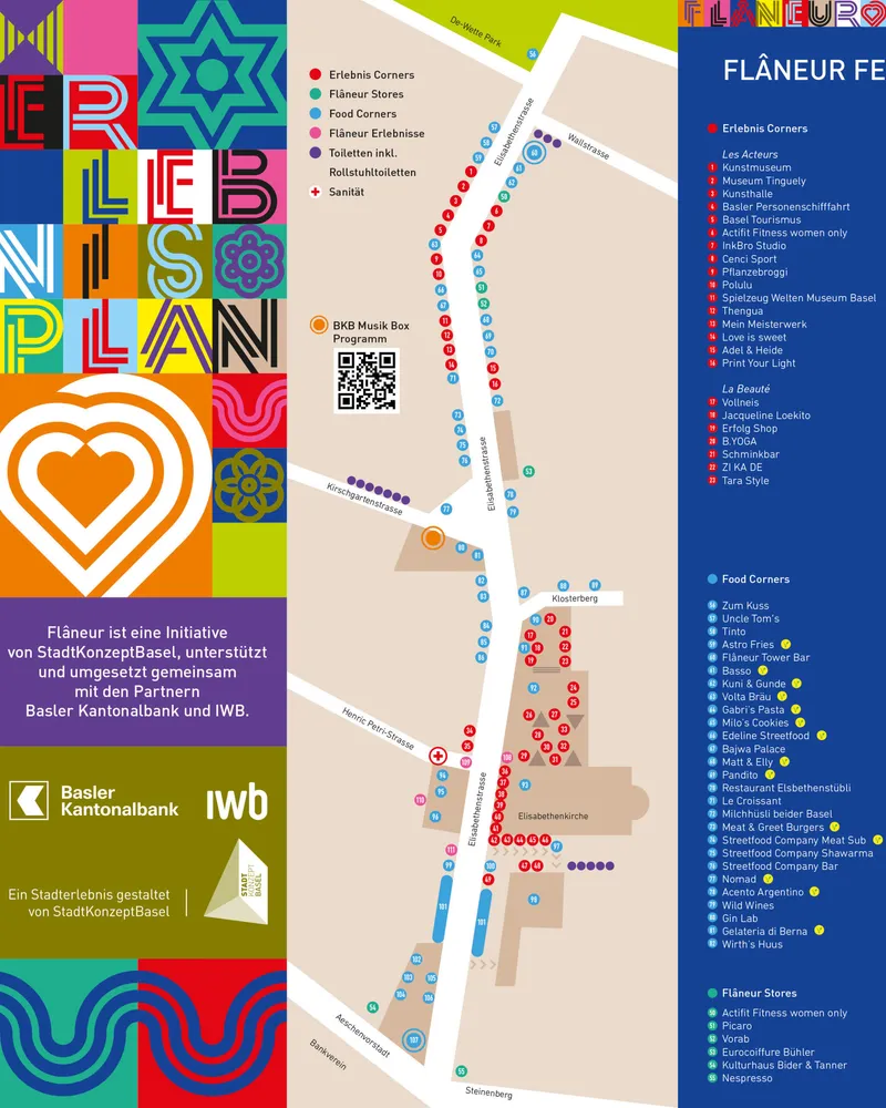 Am 12. und 13. September verwandelt das Flâneur Festival die Elisabethenstrasse zum letzten Mal in ein Erlebnisreich – mit über 120 Partnern, vier Erlebniswelten, 40 FoodCorners und der «BKB Musik Box». Das ganze Programm in der Übersicht.