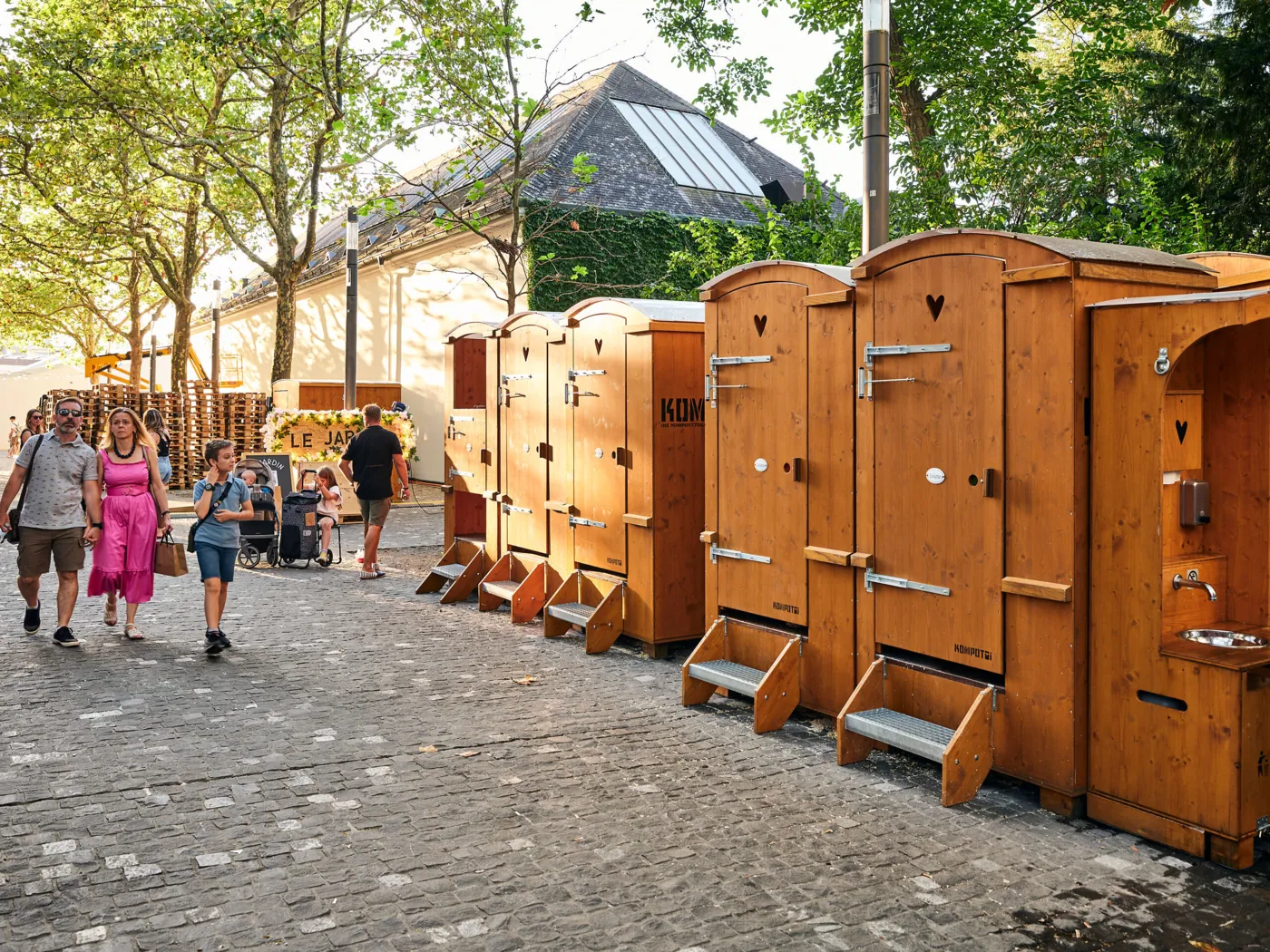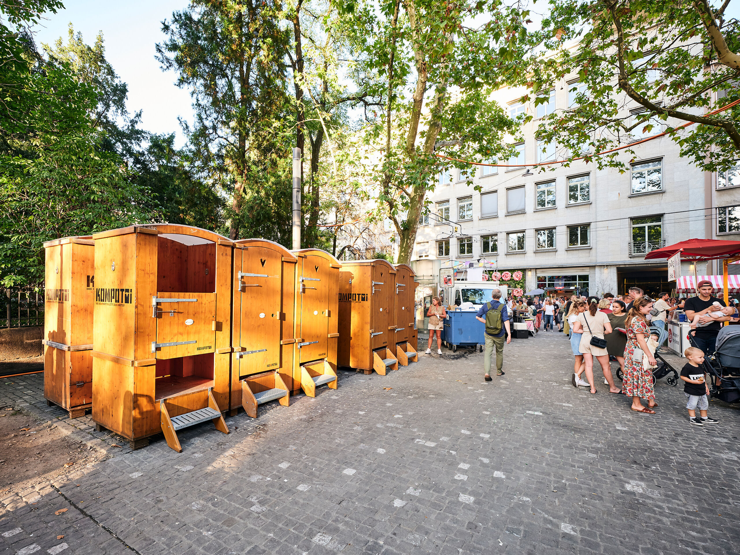 Und dann wären da noch die Klos – oder besser gesagt: die Kompotois. Diese mobilen Kompost-Toiletten verwandeln, was rein geht, in fruchtbare Erde. Ganz ohne Chemie, dafür mit sanfter Kreislaufwirtschaft. Und ja: es stinkt nicht.