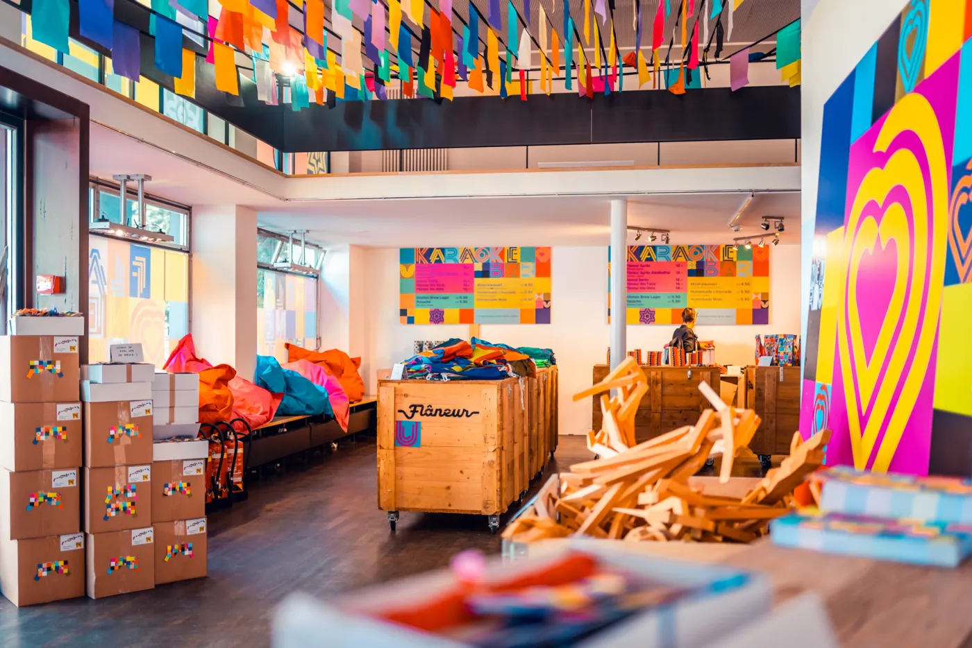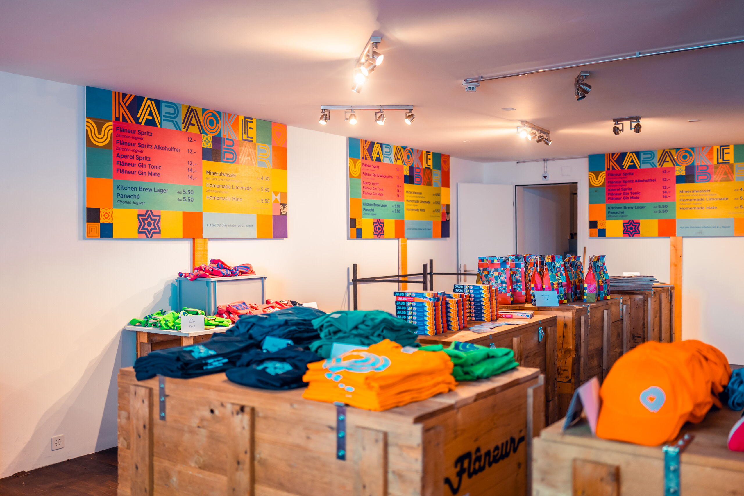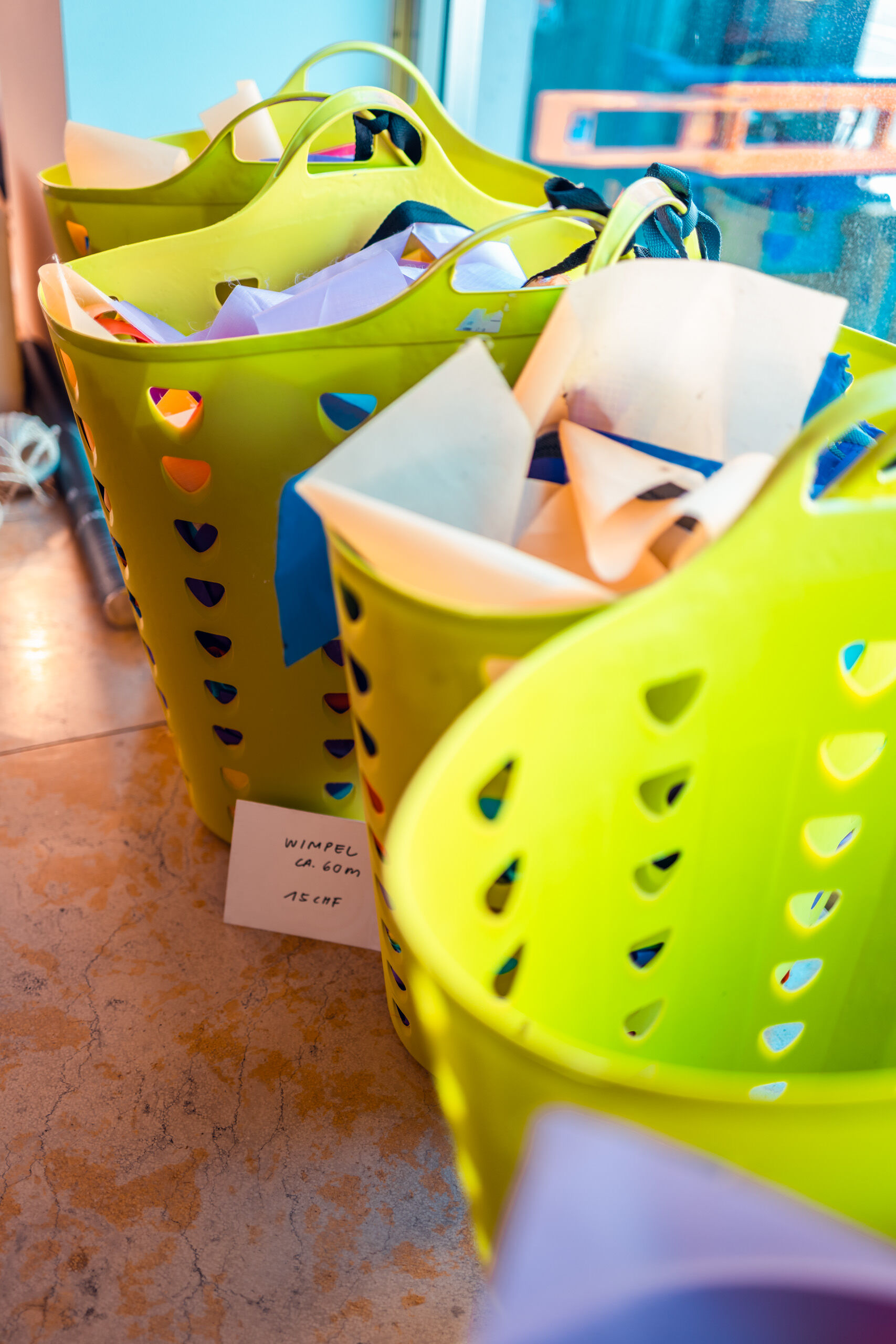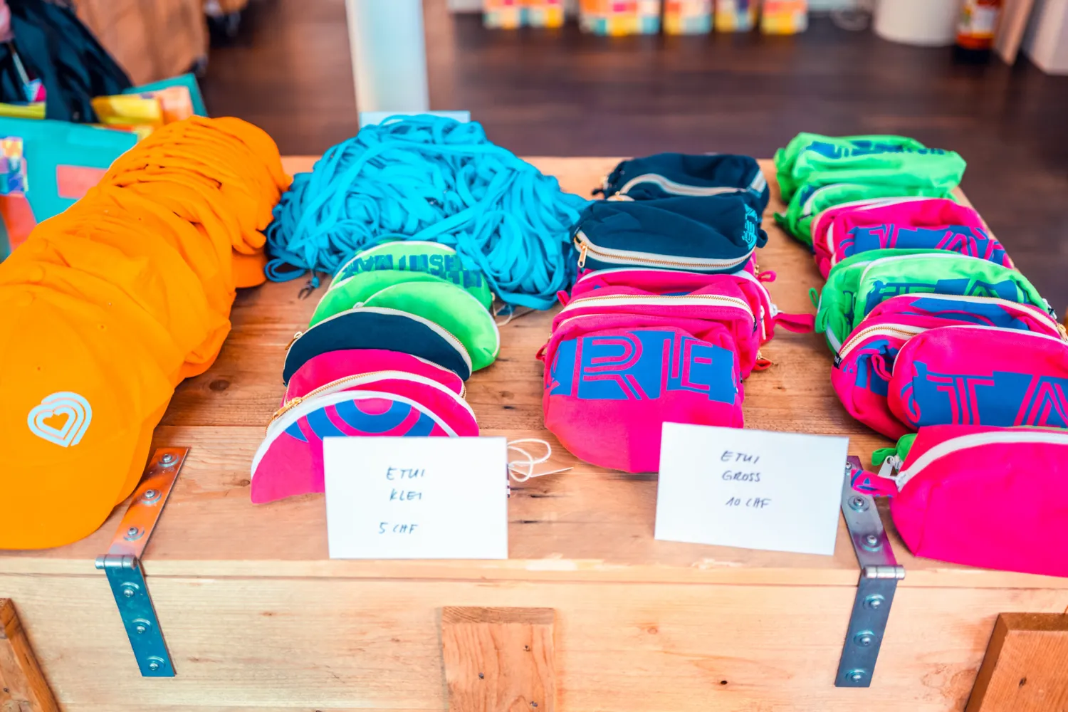 Zwischen bunten Fahnen, liebevoll gestaltetem Dekomaterial, Fundstücken aus den ErlebnisCornern und dem beliebten Kartenspiel «JäJo» wartet ein Stück Flâneur auf dich – zum Erinnern, Basteln, Upcyclen oder einfach zum Mitnehmen. Auch dabei: Shirts, Plakate, Puzzles, Blachenstücke, Spanngurte, Dachfolien und mehr.