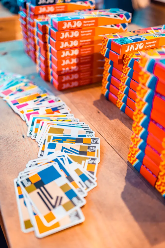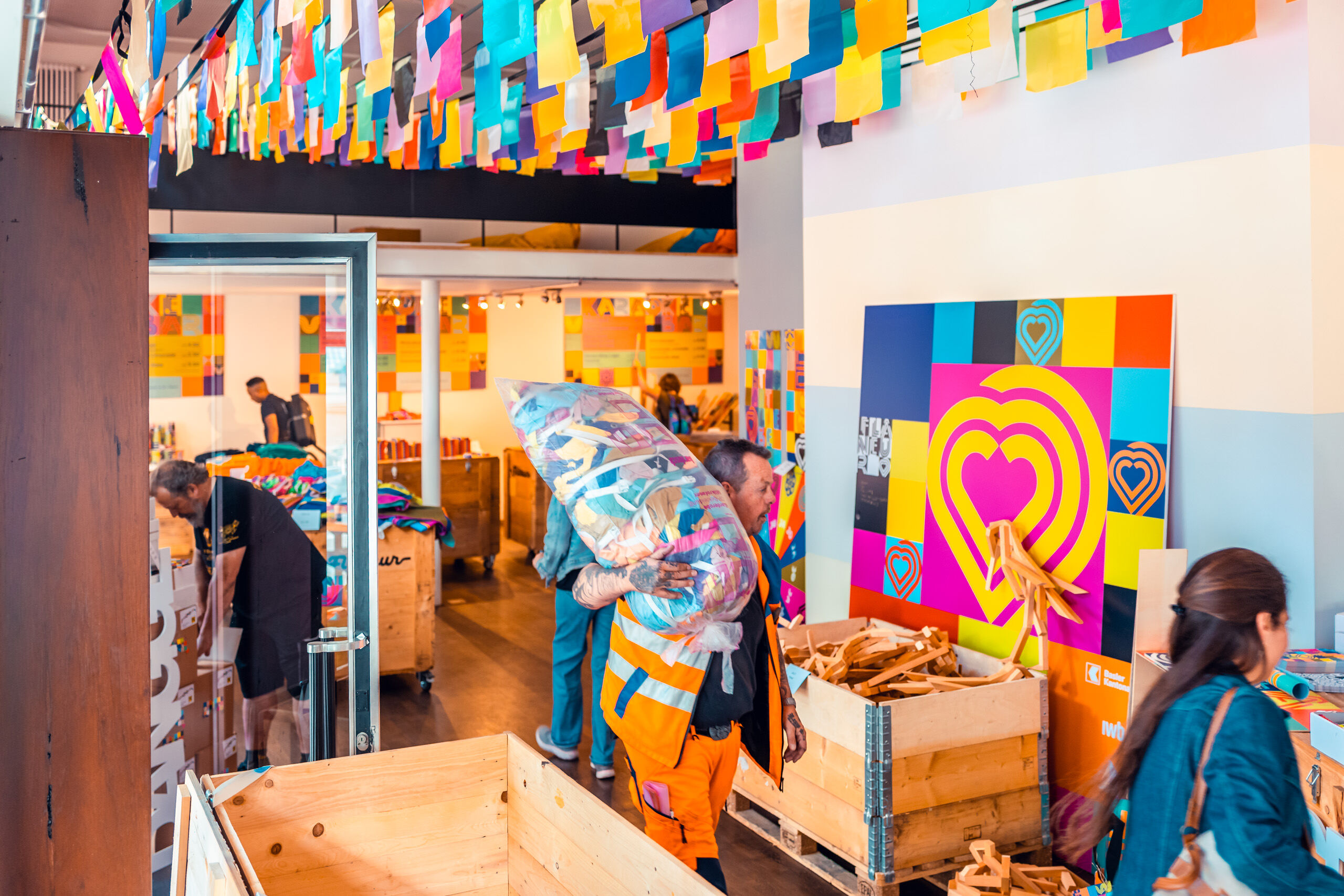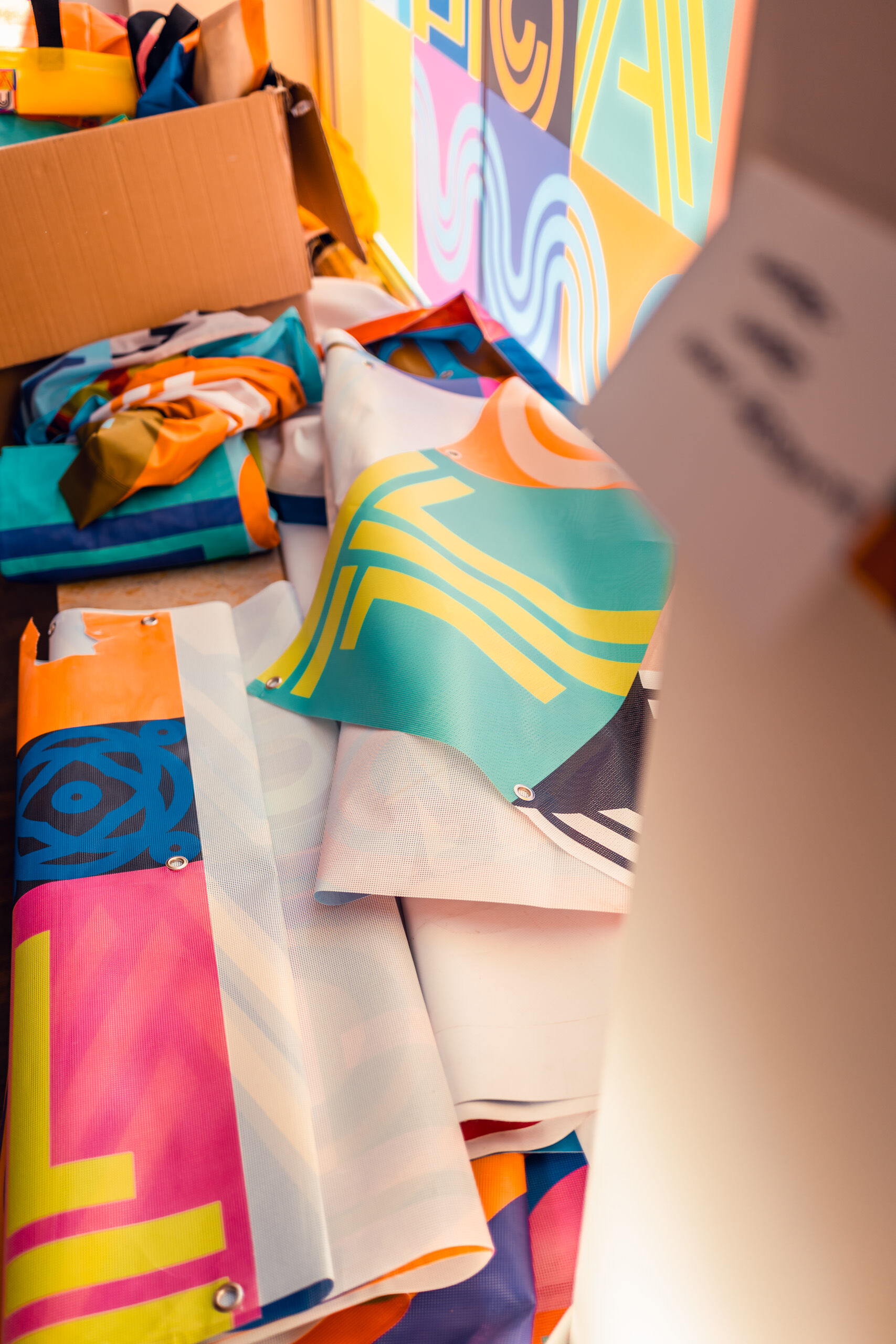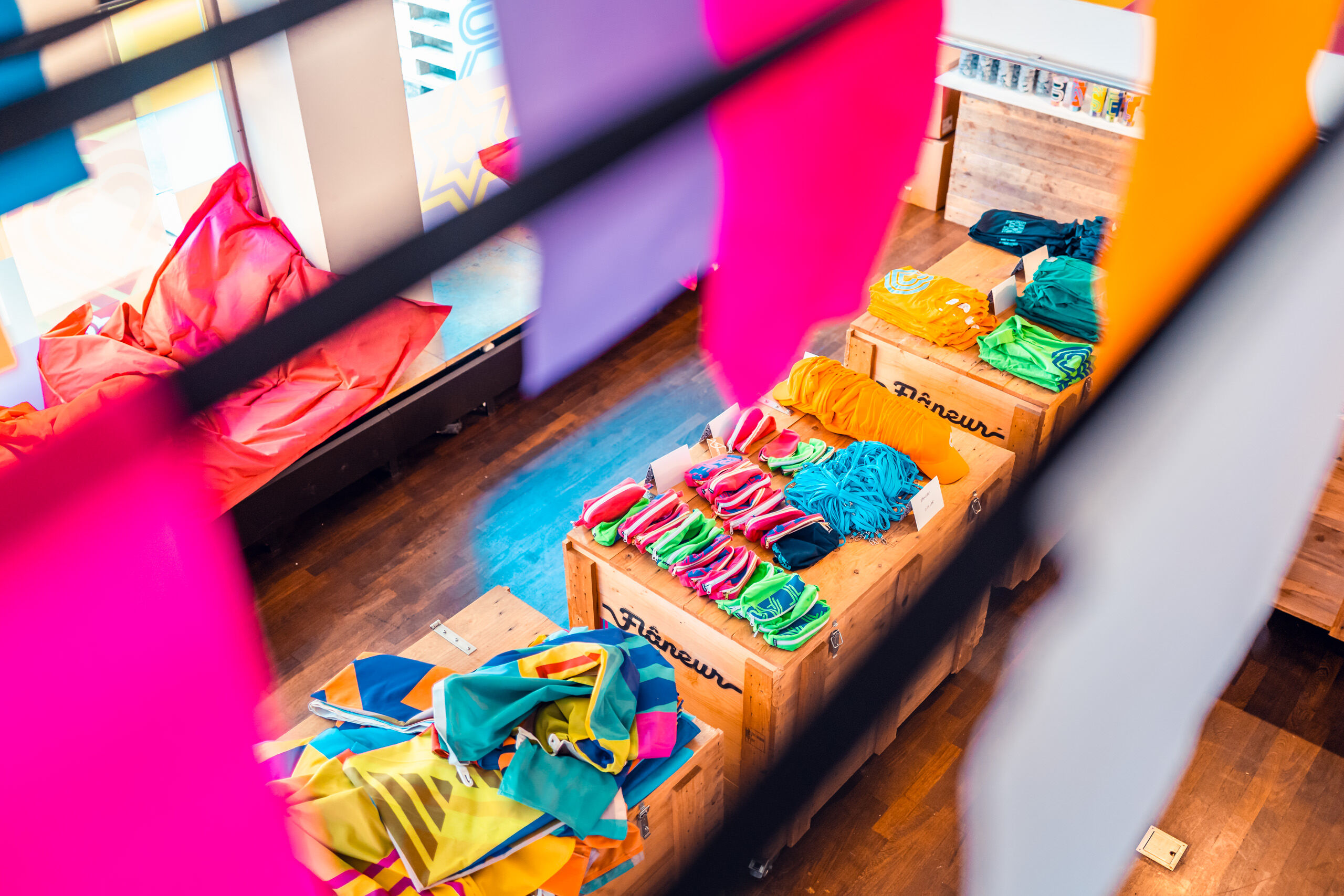 Zwischen bunten Fahnen, liebevoll gestaltetem Dekomaterial, Fundstücken aus den ErlebnisCornern und dem beliebten Kartenspiel «JäJo» wartet ein Stück Flâneur auf dich – zum Erinnern, Basteln, Upcyclen oder einfach zum Mitnehmen. Auch dabei: Shirts, Plakate, Puzzles, Blachenstücke, Spanngurte, Dachfolien und mehr.
