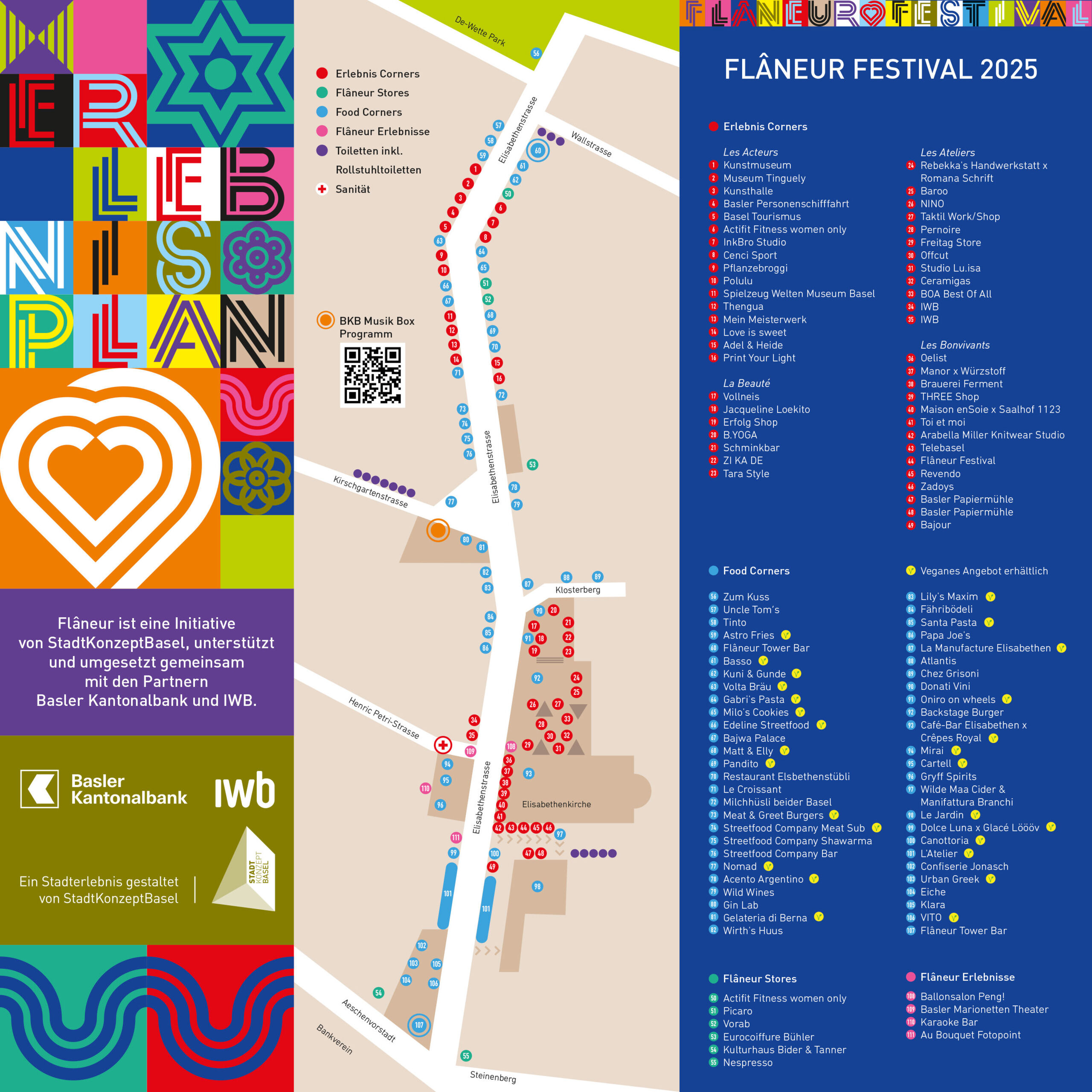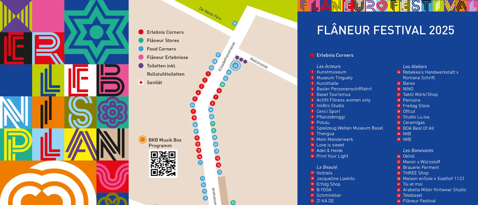 Das Festival startet jeweils ab 16.00 Uhr – perfekt für Familien. Mit Marionettentheater, interaktiven Angeboten und vielen Mitmachformaten wird die Elisabethenstrasse zum Entdeckungsraum für Gross und Klein. Der Erlebnisplan bietet eine Übersicht über alle Corner, Partner und Erlebnisse – kompakt und als Stadtkarte nutzbar. 👉 Erlebnisplan herunterladen (PDF).