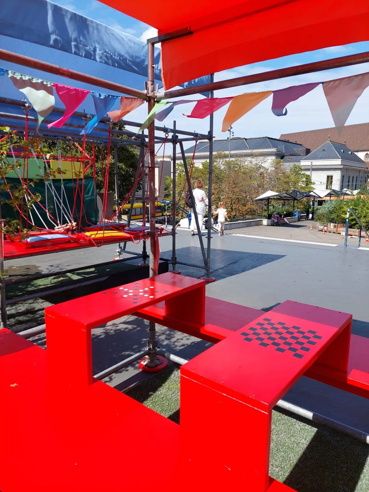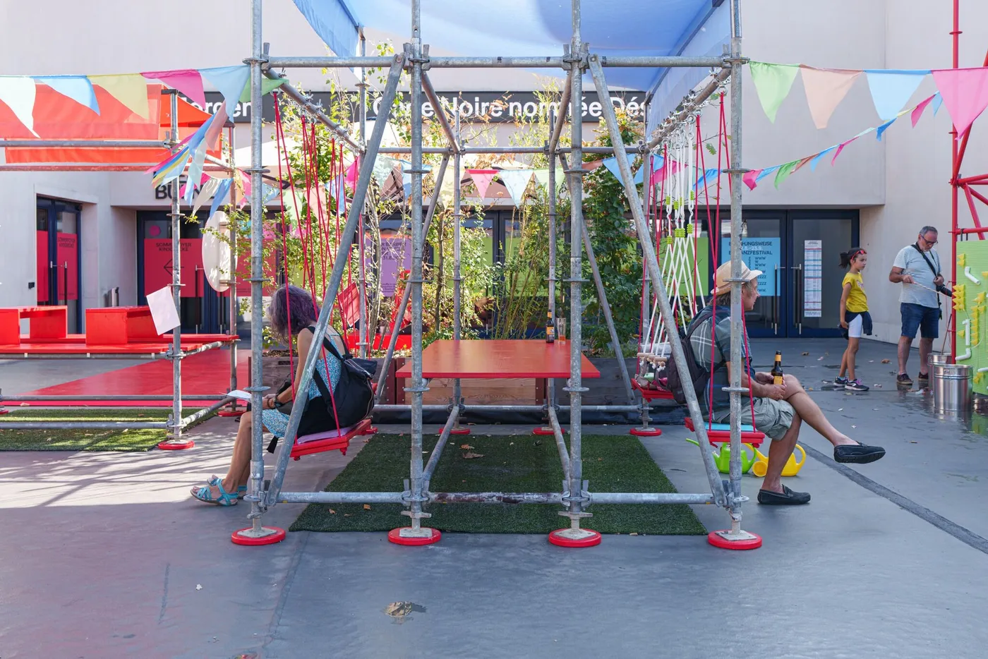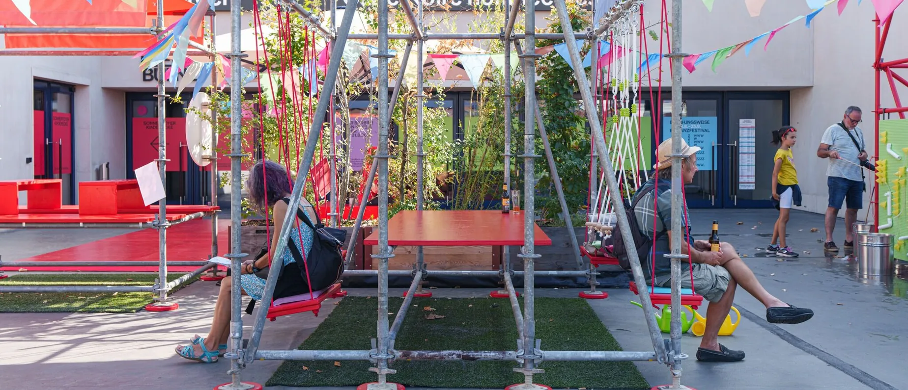 Mit bunten Pavillons und vielerlei Sitzgelegenheiten zeigt das Sommerfoyer, dass der geteilte Ort für Arbeit, Freizeit und alles zwischendrin auch Draussen wunderbar funktioniert. Für die fleissigen Bienchen unter uns gibt es Tische, die sich perfekt als open air Arbeitsplätze eignen, aber auch die Jungen (und Junggebliebenen) kommen bei Planschbecken und Boule Bahn auf ihre Kosten. Wenn es dann doch mal zu heiss wird, kannst du dir in der alten Billettkasse eine Glace oder etwas zu Trinken kaufen. Und dich dann in die Hängematte legen und die Seele baumeln lassen.