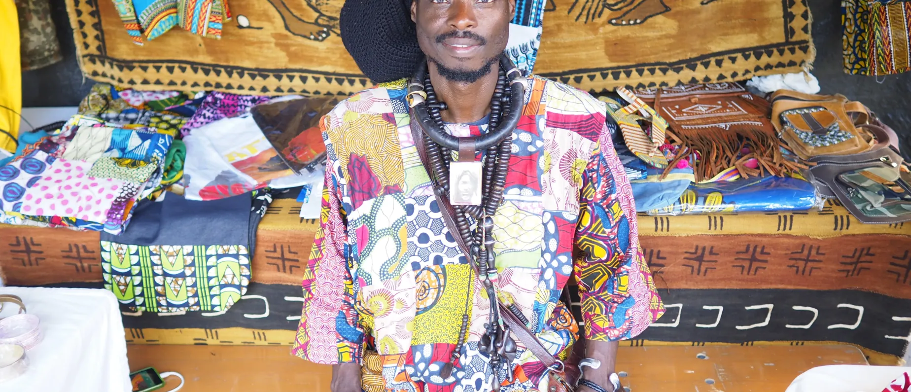 Eine Erinnerung, die bleibt! Zwischen den Pyramiden des Theater Basels, inmitten des lebendigen Treibens des jährlichen Klosterbergfestes erspähen wir Fallou an seinem Stand. Zu sagen, dass er auffällt, ist eine gröbere Untertreibung. Er leuchtet regelrecht hervor! Grund dafür sind vor allen Dingen seine wunderschönen, farbenfrohen und typisch senegalesischen Stoffe, aus welchen seine Kleider gefertigt sind. Kombiniert mit viel Schmuck, Plunderhosen und Sneakers mixt er Tradition mit Zeitgenössischem.
