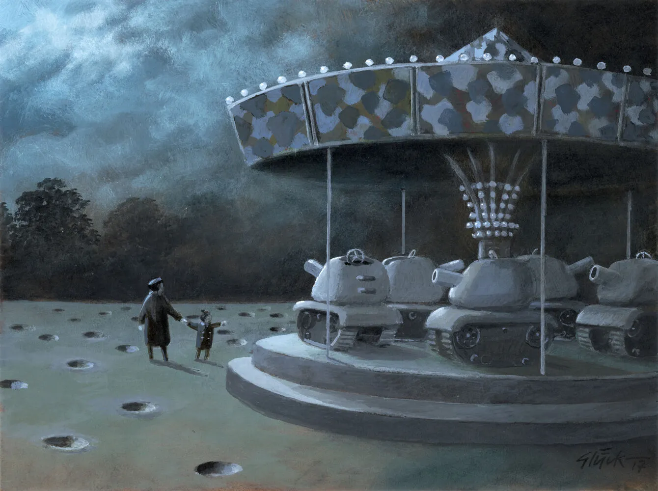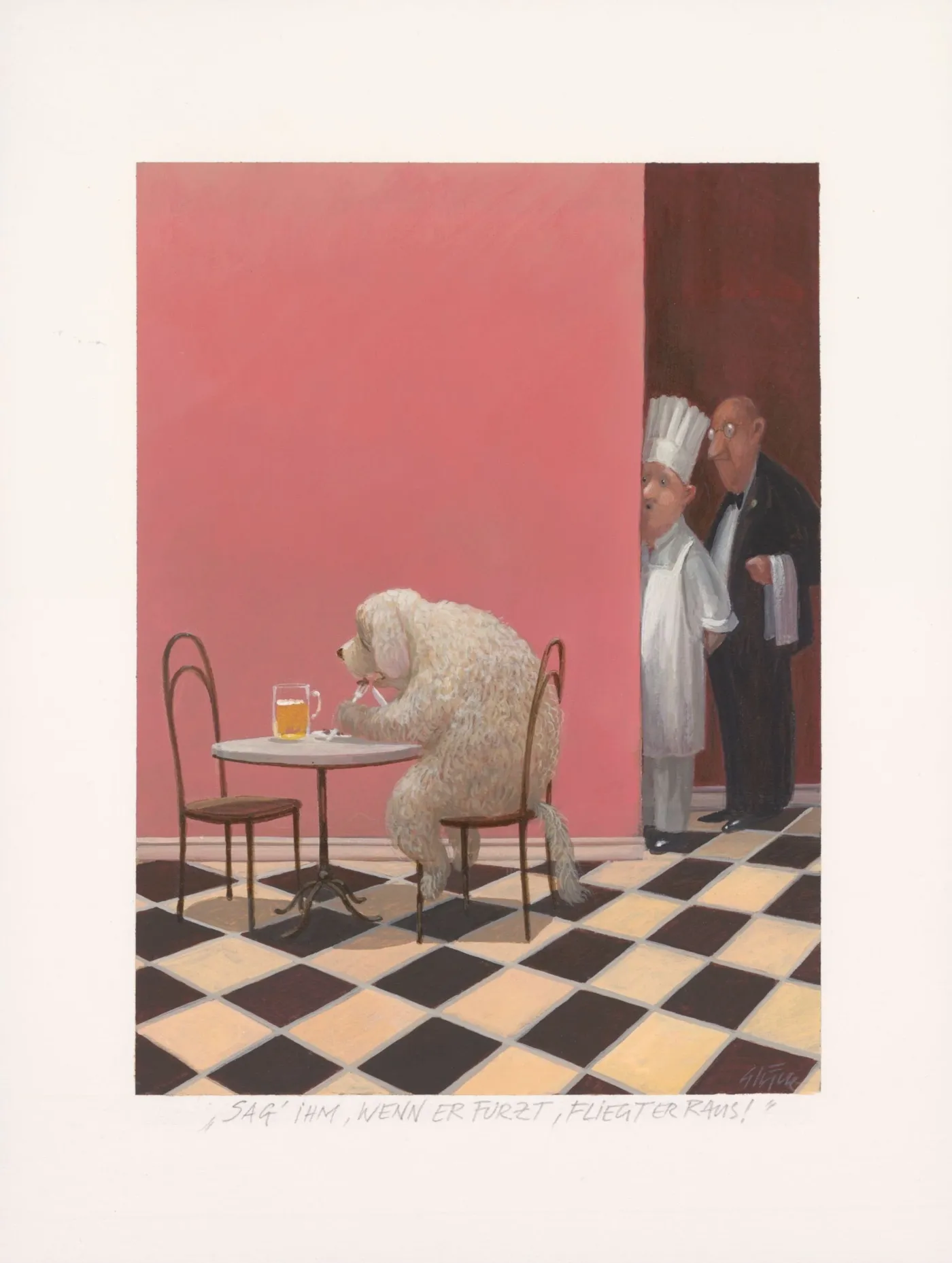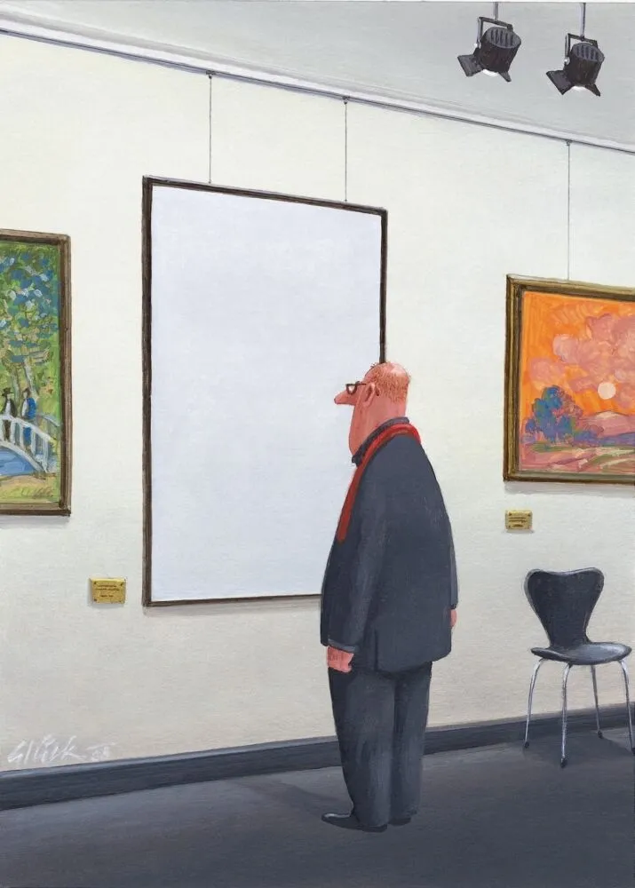 Ob du bereits vor dieser Ausstellung mit Gerhard Glücks Kunst vertraut warst oder nicht – die grosse Spannbreite an grossen und kleinen Konflikten, Menschlichem und Zwischenmenschlichem macht die Faszination für den Künstler aus. Sein feiner Humor, die pointierte und reduzierte Heransgehensweise an ein Thema, das viele Ungesagte, das in seinen Kunstparodien mitschwingt, zeichnet die Genialität Glücks aus – und hat ihm als Cartoonist für verschiedene Medien auch schon zahlreiche Auszeichnungen eingebracht. So wurde Glück 2000 und 2005 mit dem Deutschen Karikaturenpreis in Gold geehrt und 2017 mit dem Göttinger Elch für sein Lebenswerk gewürdigt. Seit 1991 ist er ständiger Mitarbeiter von «NZZ Folio», der Zeitschrift der Neuen Zürcher Zeitung, und seit 1994 des Satiremagazins «Eulenspiegel». Weiterhin publiziert Glück in der Wochenzeitung «Die Zeit» und im Magazin «Cicero».