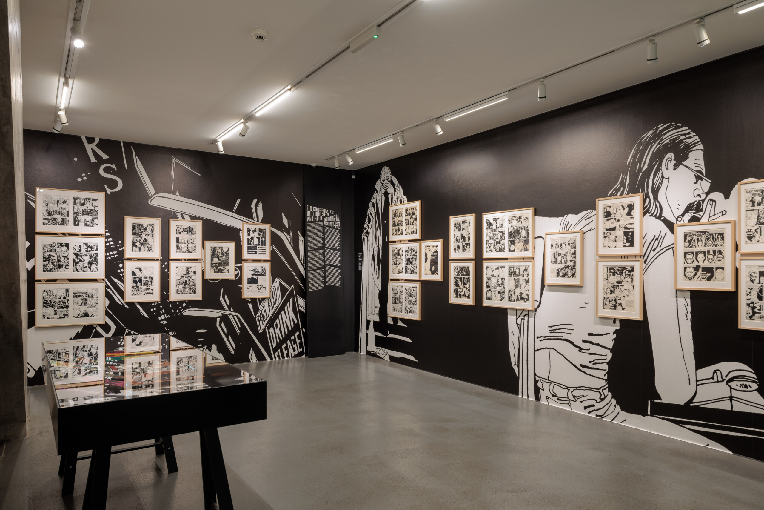 Gleich zu Beginn der Ausstellung befinden wir uns inmitten hart gezeichneter, kontrastreicher Schwarz-Weiss-Welten. Es ist das Leben des Privatdetektivs und Ex-Polizisten Alack Sinner. Desillusioniert, melancholisch, einsam, dem Alkohol verfallen, verkörpert Sinner den Antihelden, der seine Leserschaft seit 1975 mit einem Mix aus klassischer Krimihandlung fesselt und mit scharfer Gesellschaftskritik konfrontiert. Die Serie, welche von Muñoz und seinem Landsmann, dem Autor Carlos Sampayo (*1943), geschaffen wurde und weltweit Erfolge feierte, befasst sich mit Rassismus und Korruption sowie geschichtlichen Ereignissen wie dem Vietnamkrieg oder den Anschlägen vom 11. September. Muñoz’ kompromissloser Zeichenstil und Sampayos ungeschönter Erzählstil sind dabei von der düsteren Zeit Anfang der 1970er Jahre geprägt, als ihre Heimat Argentinien unter Militärdiktaturen litt und viele Menschen – mitunter die beiden Künstler – dazu bewegte, das Land zu verlassen und nach Spanien zu emigrieren.