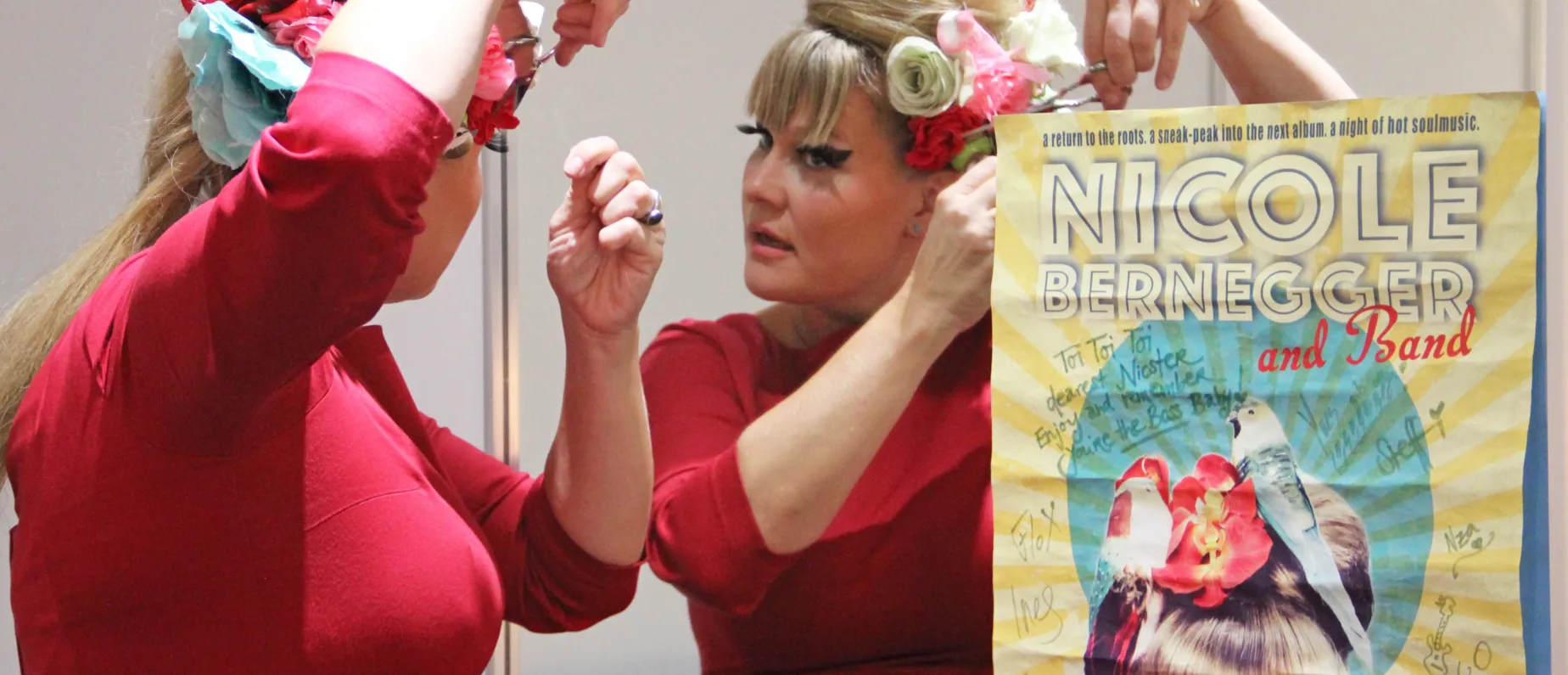 19.55 Uhr – Backingvocals und Instrumentalisten betreten die Bühne. Applaus. Beatrice Stirnimann macht die zuvor mit Nicole besprochene Ansage. Nicole steht in ihrem roten Kleid im Dunkeln hinter der Bühne. Ihre Augen sind geschlossen. Sekunden vor dem grossen Auftritt scheint sie geerdet, ruhig und maximal fokussiert.