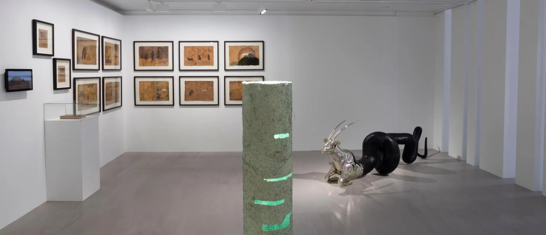 «Evaporating Suns – Zeitgenössische Mythen vom Arabischen Golf» beschäftigt sich mit dem Spannungsfeld zwischen Mythos und Realität. Insgesamt 13 junge Künstlerinnen und Künstler – alle im Alter von Mitte 20 bis 30 – setzen ihre eigens für diese Ausstellung konzipierten Arbeiten und Projekte beeindruckend in Szene. Dafür wurden die Räumlichkeiten der KBH.G in verschiedene kleinere Ausstellungsflächen unterteilt. Im einen Raum fühlst du dich wie in einem kleinen Spielcasino, im anderen Raum wird eine Videoinstallation gezeigt und im nächsten Bereich springt dir ein mythisches Fabelwesen – eine Art Steinbock mit Schlangenkörper – entgegen.