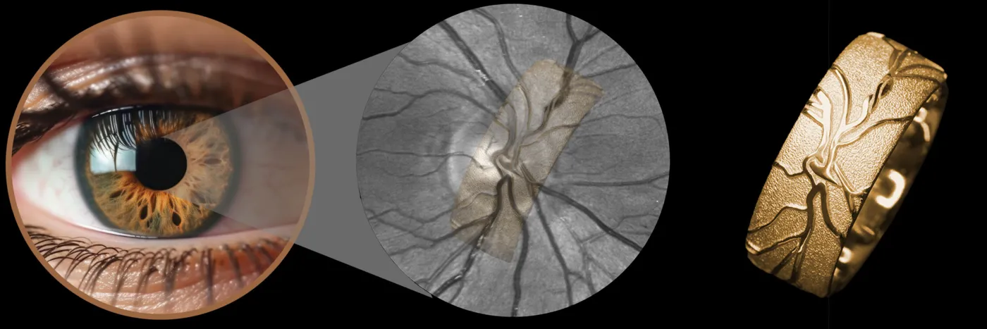 Wir haben ein weltweit einzigartiges Konzept entwickelt, um aus der persönlichen Retina-Signatur unserer Kundinnen und Kunden individuelle Schmuckstücke zu gestalten. Jedes Auge besitzt ein unverwechselbares Muster, selbst bei eineiigen Zwillingen. So entstehen einzigartige Kreationen mit persönlicher Bedeutung für die Trägerinnen und Träger.