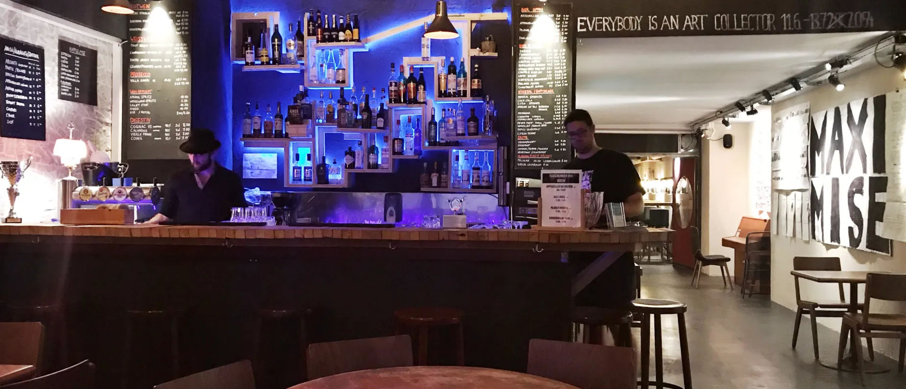 Neben netten Cocktails und einer Antipasti-Auswahl zieht insbesondere auch die Kunstausstellung unsere Blicke auf sich. Momentan werden Werke von Heinrich Nicolaus gezeigt – ein Überbleibsel der Art. Bald schon sollen die Wände im Schall und Rauch aber regelmässig von unterschiedlichsten Künstlern beschmückt werden.