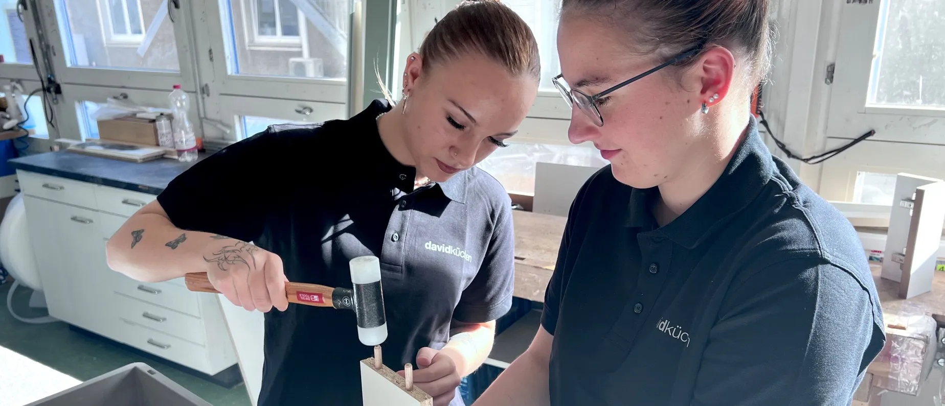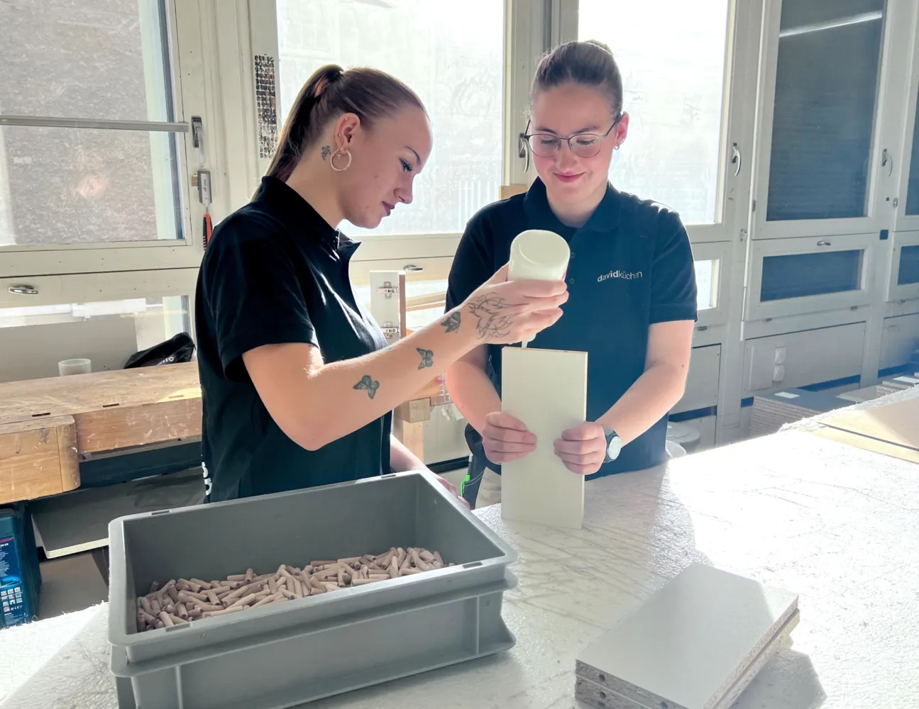 Die 18-jährige Alessia zum Beispiel arbeitet seit kurzem bei davidküchen. «Die IV hat mir geholfen, einen Praktikumsplatz zu finden», erzählt sie. «Ich wollte unbedingt zur jobfactory, weil ich das Arbeitsumfeld hier so cool fand.» Gemeinsam mit der 22-jährigen Elena arbeitet sie nun in der Werkstatt der Schreinerei. Elena geriet durch mehrere Berufsbildnerwechsel während ihrer Ausbildung zur Schreinerin in Schieflage. Nun absolviert sie das letzte Lehrjahr bei davidküchen. «Wir fühlen uns wohl hier, ernstgenommen und unterstützt», sind sich die beiden jungen Frauen einig.