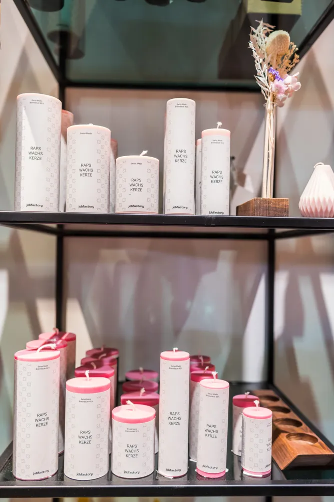 Jessica Cedro, die mit Unterbrüchen seit 2003 in der jobfactory tätig ist, hat die Verantwortung für die hier arbeitenden Jugendlichen, aber auch für die Wirtschaftlichkeit des Stores. Sie kümmert sich um das attraktive Angebot, hat das Gespür für den richtigen Mix. «Unser Fokus liegt auf Nachhaltigkeit, auf faire Arbeitsbedingungen, umweltschonende Produktion – wir verkaufen Brands, hinter denen wir stehen können. Oft findet man die im Norden Europas, wir haben jedoch auch Basler Labels, die Modemarke Atelier Marée zum Beispiel. Ebenfalls im Shop findet man die Eigenmarke hartholz und die handgemachten Raps-Wachs-Kerzen.»