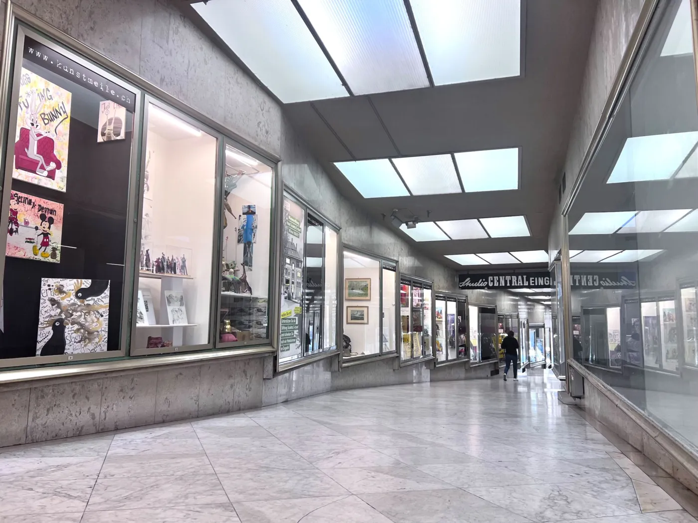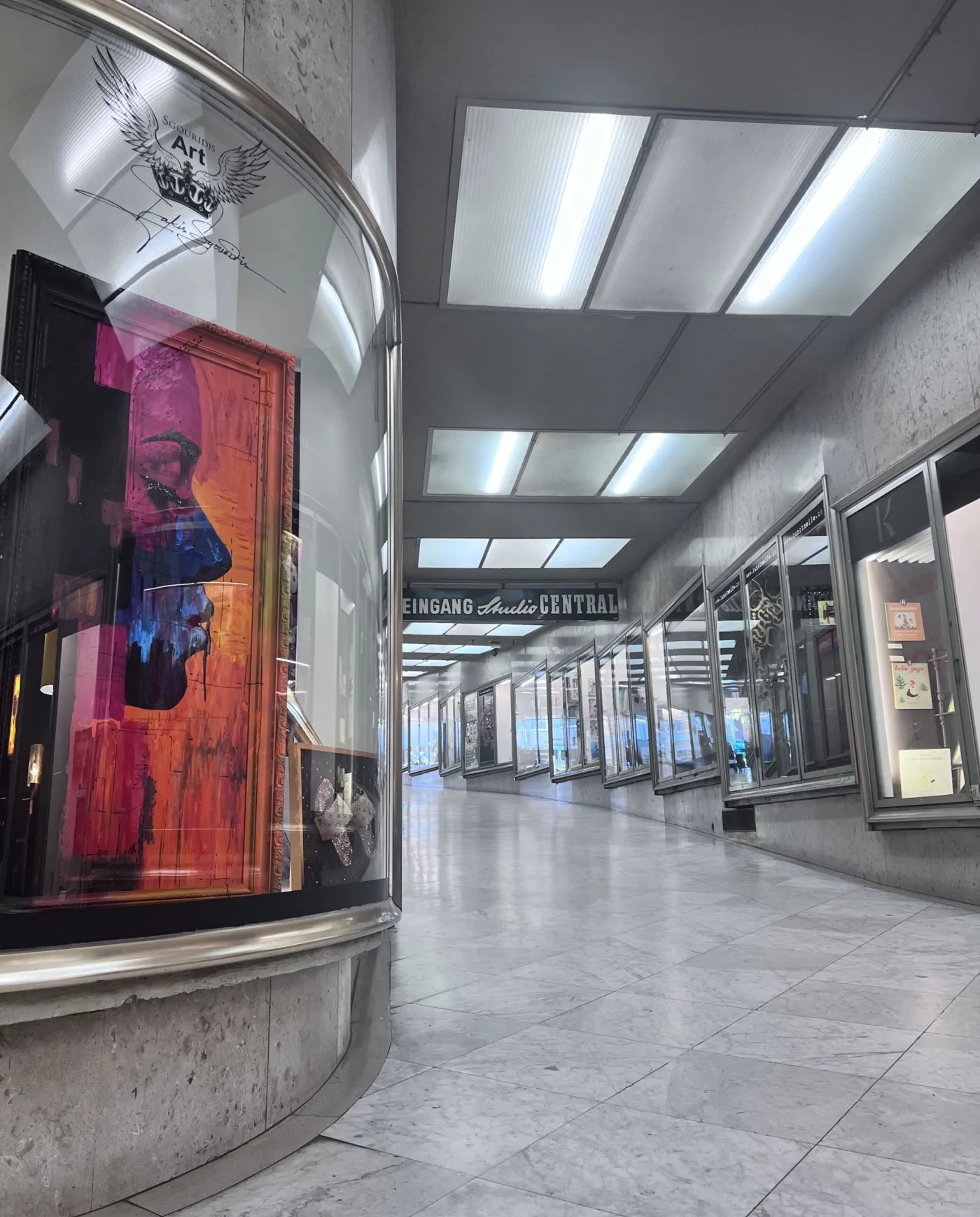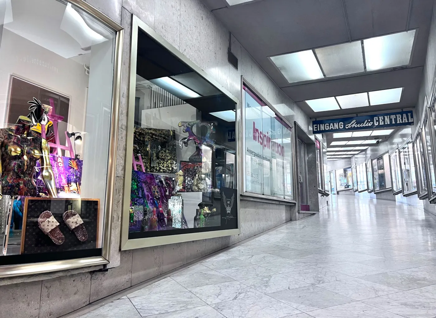Und auch die 150 Meter lange Passage, die bis heute im Originalzustand daherkommt, ist seither tötelig und leer. Enorm schade ist das, denn sie verkörpert mit ihren geschwungenen Formen, den hübschen Metallprofilen und den Farb- und Materialkontrasten den typischen Charme der 50er Jahre. Das fand auch Lakis Sgouridis, als er Ende September ein winziges Atelier in der Passage mit seiner Kunst einrichtete.