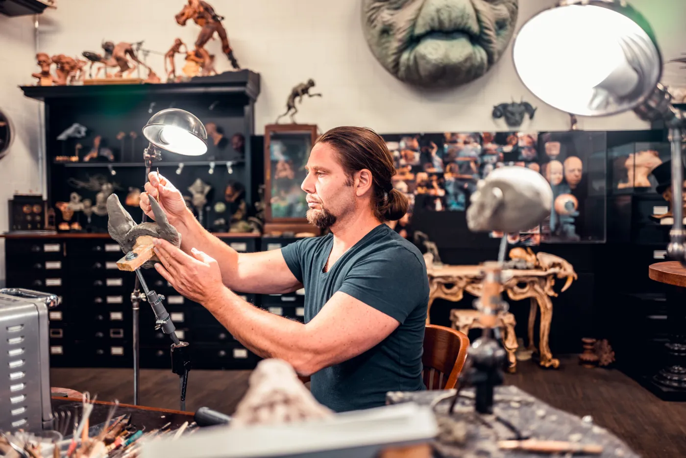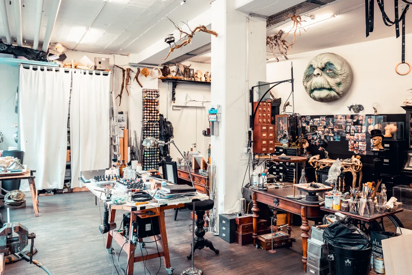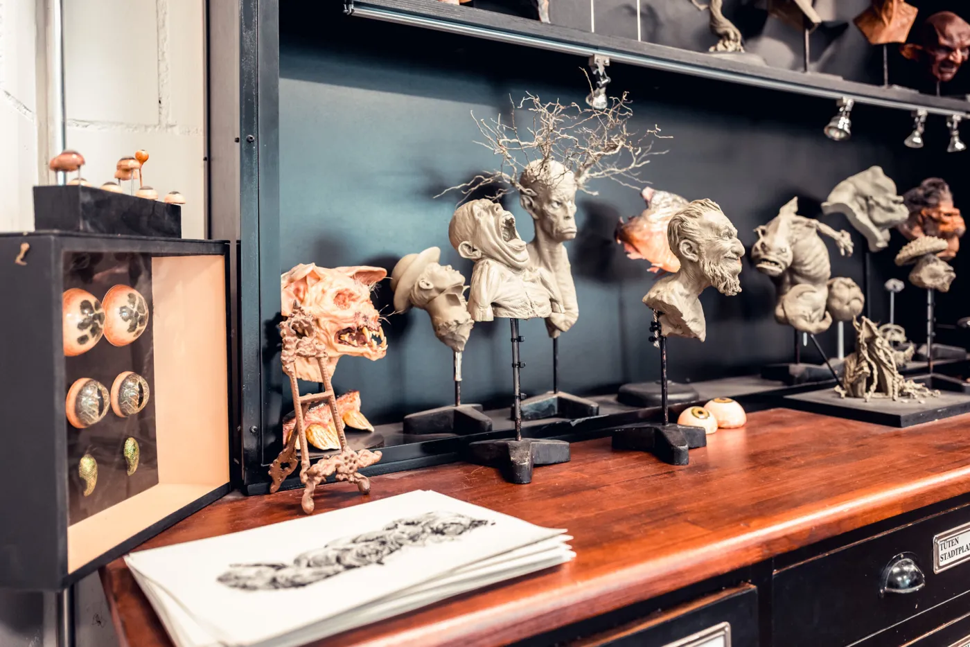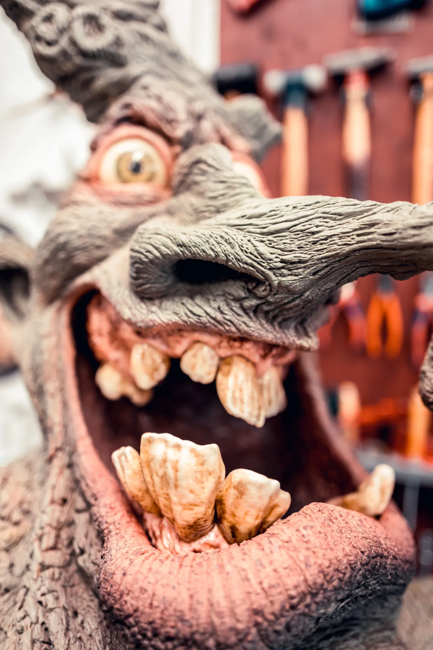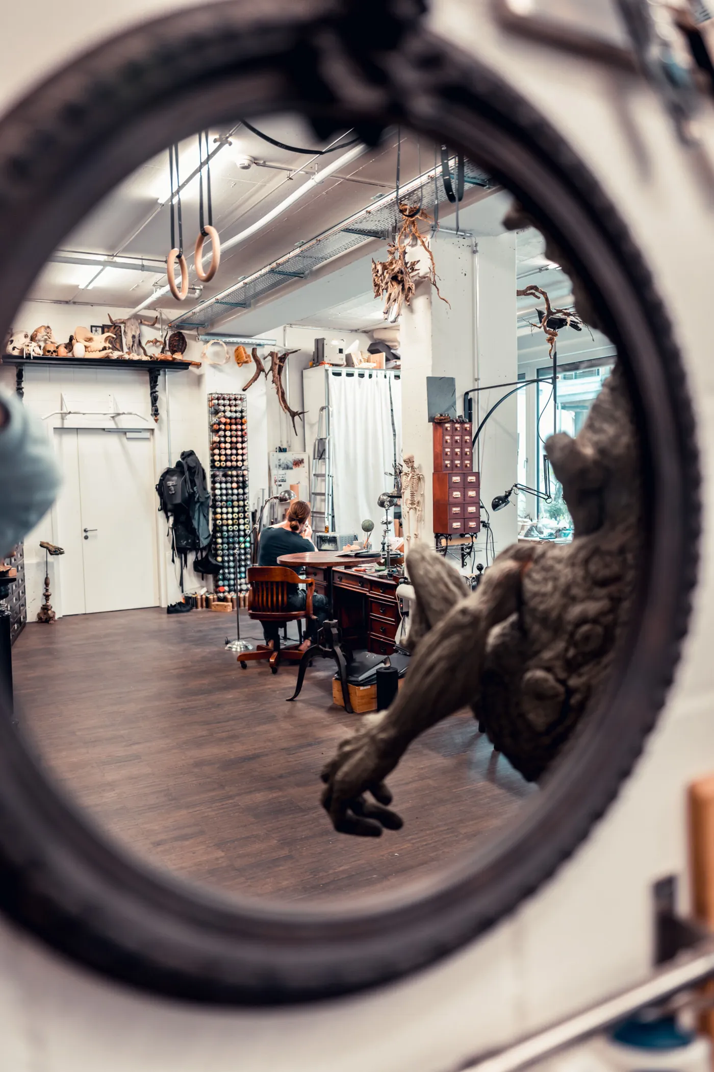 Es ist ruhig, als ich das Atelier von George Steiner betrete. Ruhig, ordentlich und sauber. Kein Radiogedudel, kein Staub, kein Geruch nach Lack oder Farbe. Der grosse, helle Raum scheint Museum, Fundgrube und Werkstatt in einem zu sein. In alten, schwarz lackierten Vitrinen, auf Regalen und Schränken stehen Köpfe, Figuren, eigenwillige Kreaturen. An der Wand hängen Masken und Fotos von Gesichtern, von plastischen Arbeiten, üblen Wunden und Kulissen. Ich entdecke Geweihe, Federn, ein Haifischgebiss. Hoch oben ein riesiges Mondgesicht. Und ein Bein.
