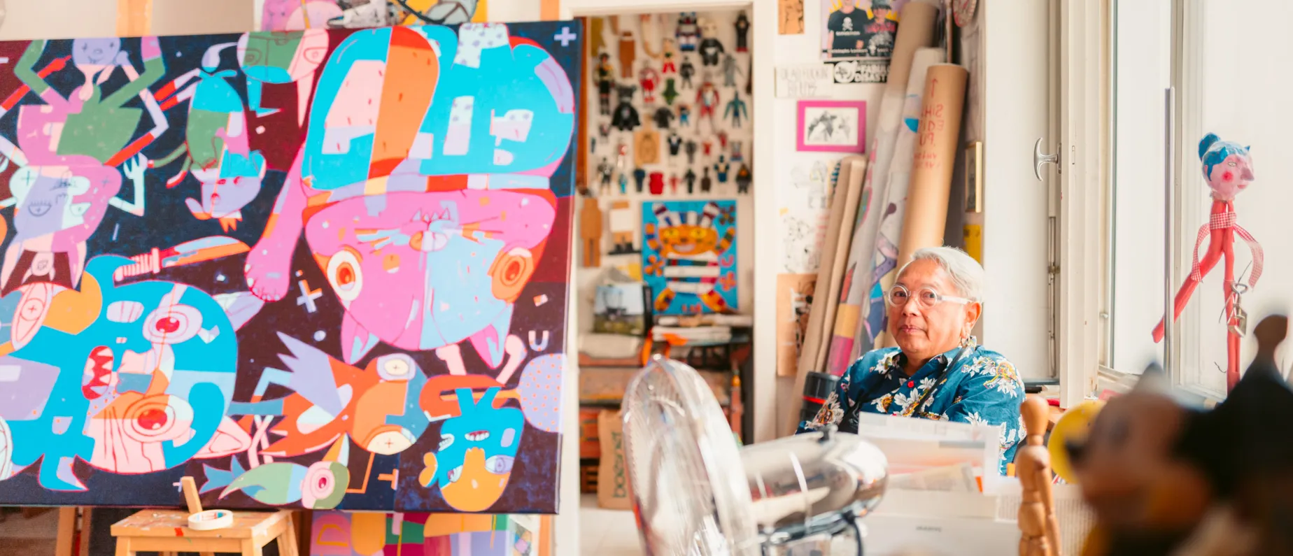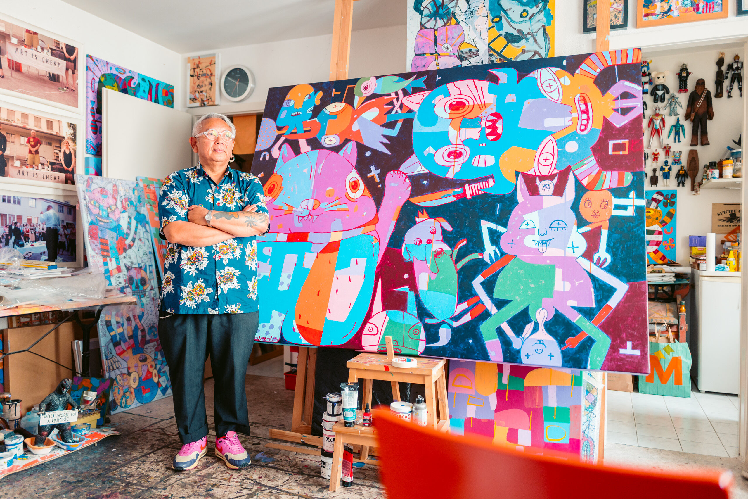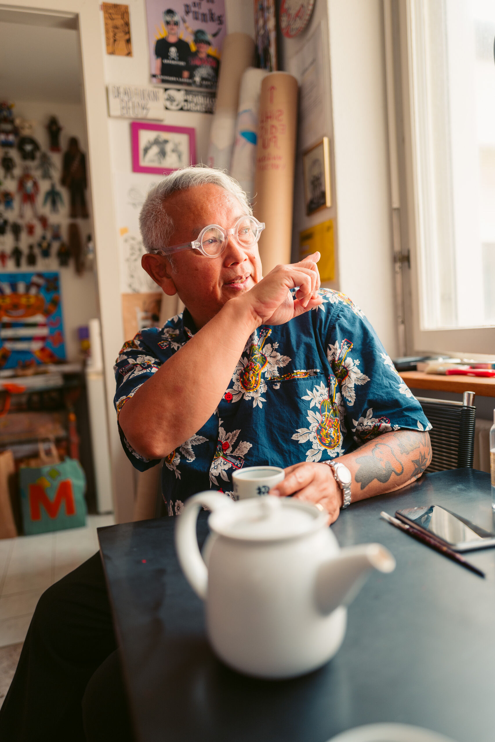 Hawaii-Shirt am Leib und runde Corbusier-Brille auf der Nase: Mit seinen gepiercten Ohren wirkt er wie ein ewig junger Paradiesvogel. Seine ruhige Art und seine Weisheit hingegen haben nicht nur eine zen-artige Auswirkung, sondern machen sie auch deutlich, dass Eddie Hara in seinen 63 Jahren schon Einiges erlebt hat. Vielleicht ist es gerade diese Mischung, die dazu führt, dass der Künstler mit seinem Schaffen insbesondere auch die junge Generation anspricht. Als wir den Basler, der ursprünglich aus Indonesien stammt, zum Interview treffen, kommt er gerade von einem grossen Job: «Ich bin erleichtert, denn soeben habe ich das Mural für den CBD-Shop ADAMS in der Steinenvorstadt zu Ende gebracht.» Womit Eddie während den vergangenen Covid-Monaten sonst noch beschäftigt war und was er gerne aus Indonesien nach Basel holen würde? Lese selbst!