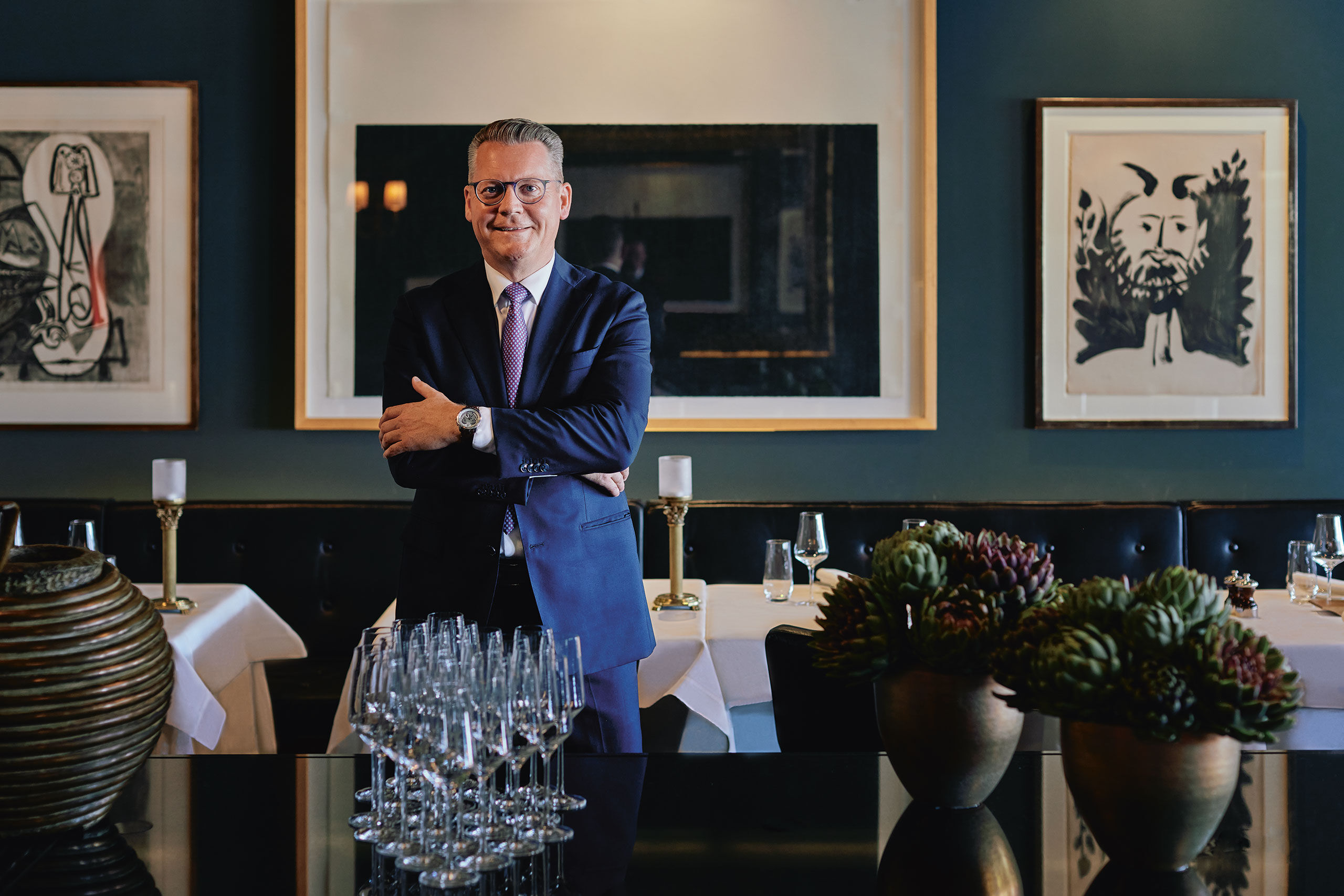 Beim Gespräch sitzen wir an einem Tisch am Entrée zur Brasserie, das Mittagsgeschäft hat noch nicht ganz begonnen. Während der ersten pandemiebedingten Schliessung wurde hier die Zeit genutzt, dem Raum ein neues Gesicht mit neuer Farbe und Kunst – wohlgemerkt aus dem Chez Donati – zu verleihen. Die petrolblauen Wände strahlen eine wunderbare Ruhe aus, während weiches Tageslicht von der grossen Fensterfront auf den Rhein hin den Raum flutet. Wie die Kunden reagierten? «Begeistert!», sagt der Maître. Die Werke an den Wänden würden regelmässig zum Gesprächsthema an den Tischen, bei vielen Gästen habe die Kunst einen hohen Stellenwert und nicht wenige besuchen gerade deswegen die Brasserie so gerne. Die Neugestaltung durch die Besitzerfamilie Straumann nahm er auch als eine persönliche Wertschätzung wahr, als Ausdruck des Vertrauens, das ihm stets von den Direktoren entgegengebracht worden war – und wird.