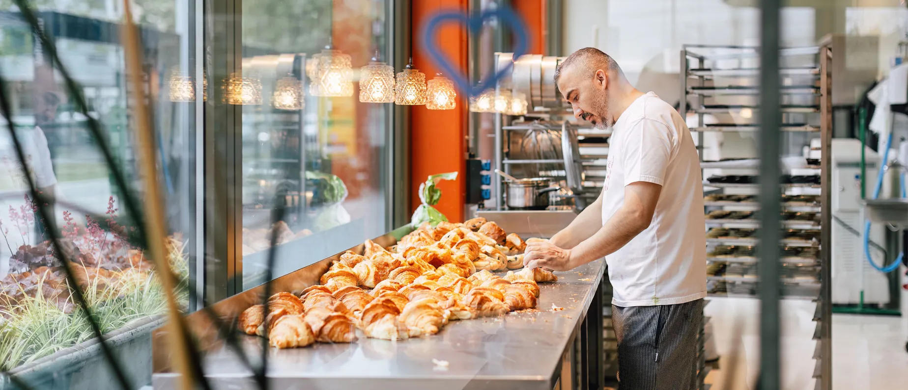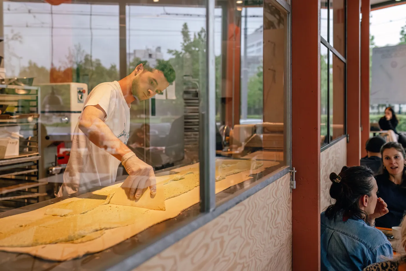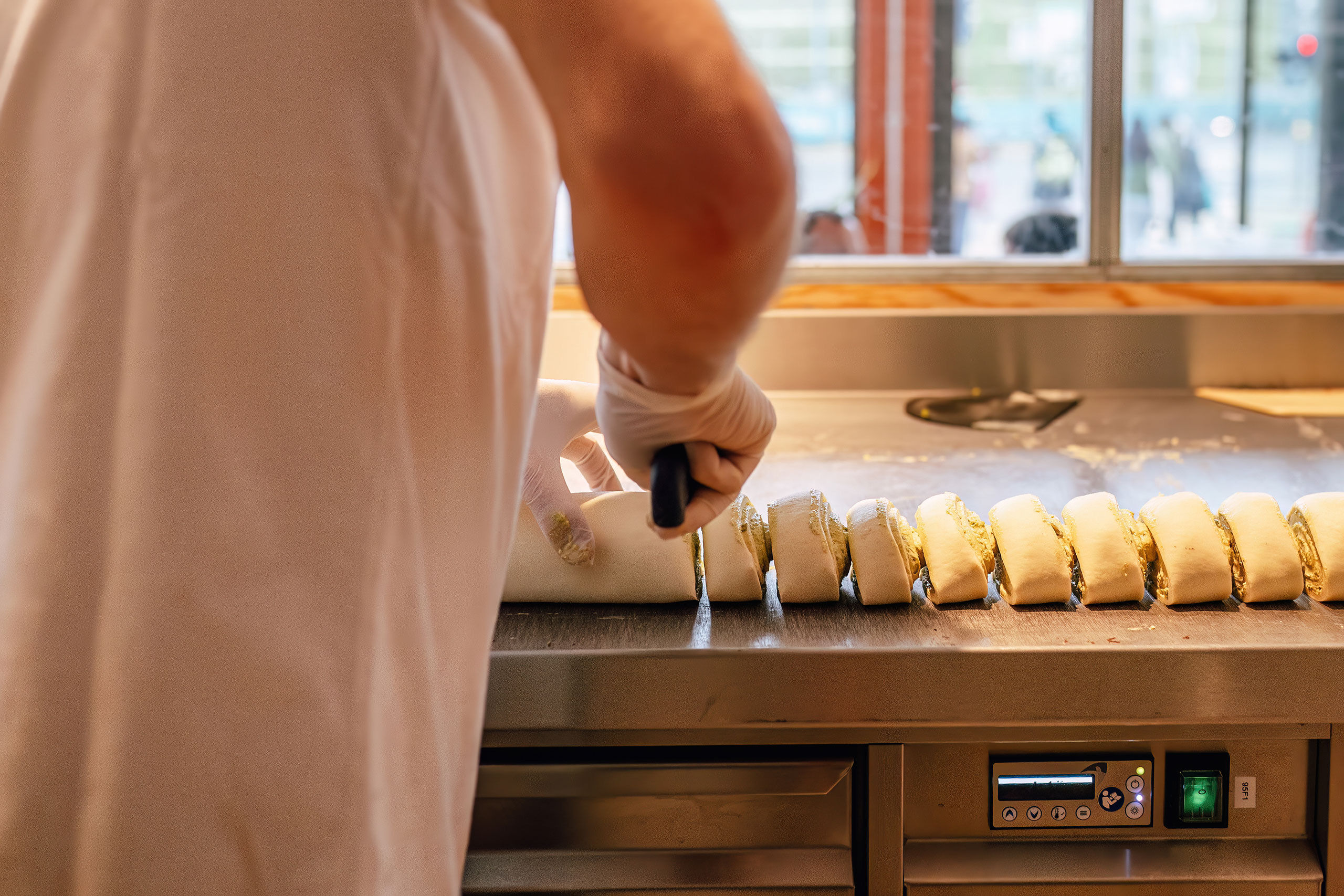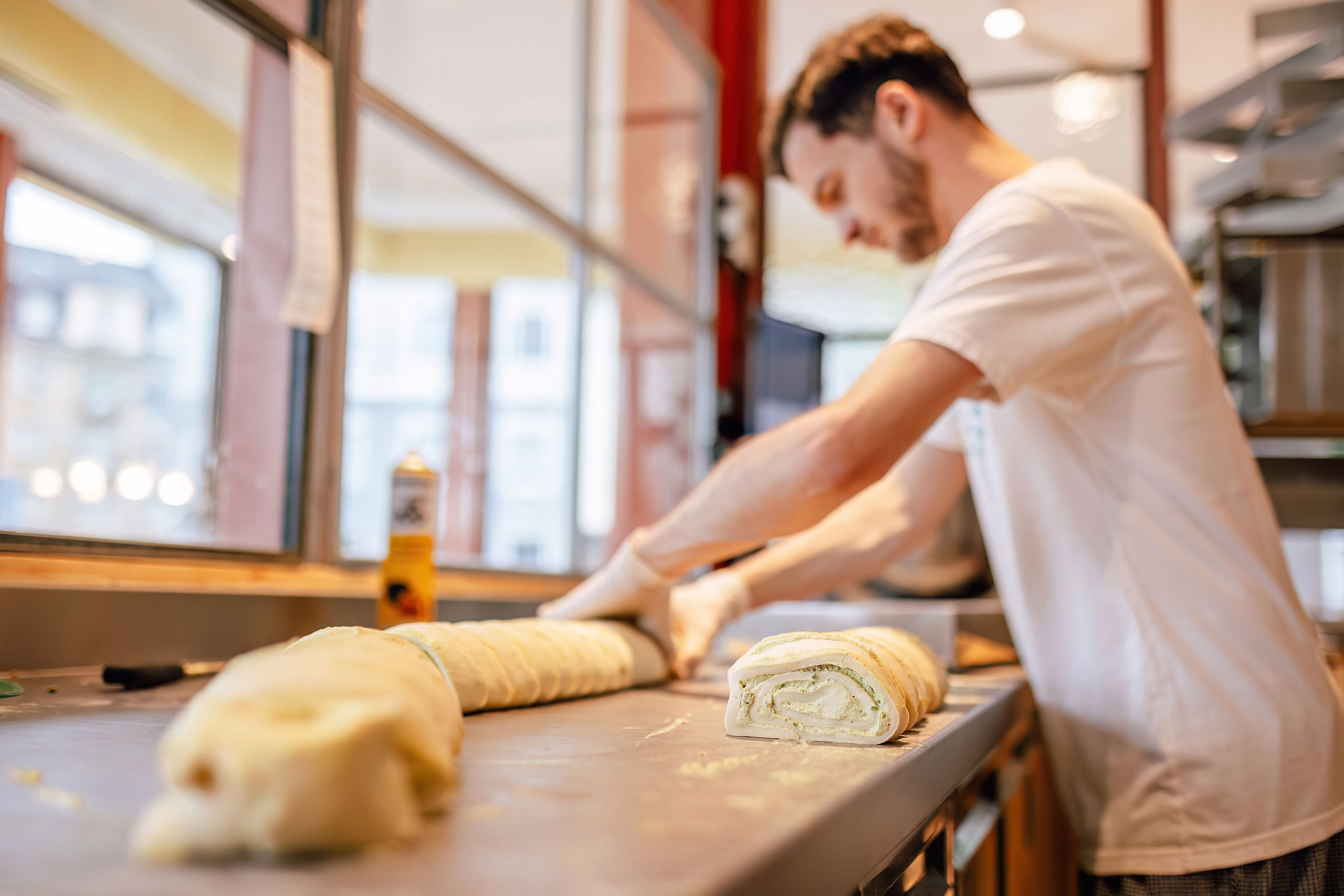 Die Fronten sind verglast, entsprechend hat Guillaume immer wieder Zuschauerinnen und Zuschauer, wenn er den Teig aus der Ausrollmaschine zieht, flink die selbst hergestellte Pistazienpaste verteilt, den Teig rollt, schneidet und die Portionen aufs Blech legt; immer und immer wieder. Die Verglasung ist in doppelter Hinsicht Absicht: Einerseits sollen die Gäste und die Vorbeiflanierenden zuschauen können, «das ist quasi unser Bildungsauftrag», wie Lukas sagt. Andererseits haben die Bäckerinnen und Bäcker damit möglichst viel Tageslicht zum Arbeiten. Den Zuschauerinnen und Zuschauern gefällt das. Die Kita von nebenan hat sich davon zu Zeichnungen inspirieren lassen, die nun im Lokal hängen.
