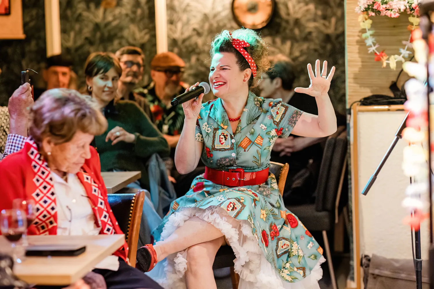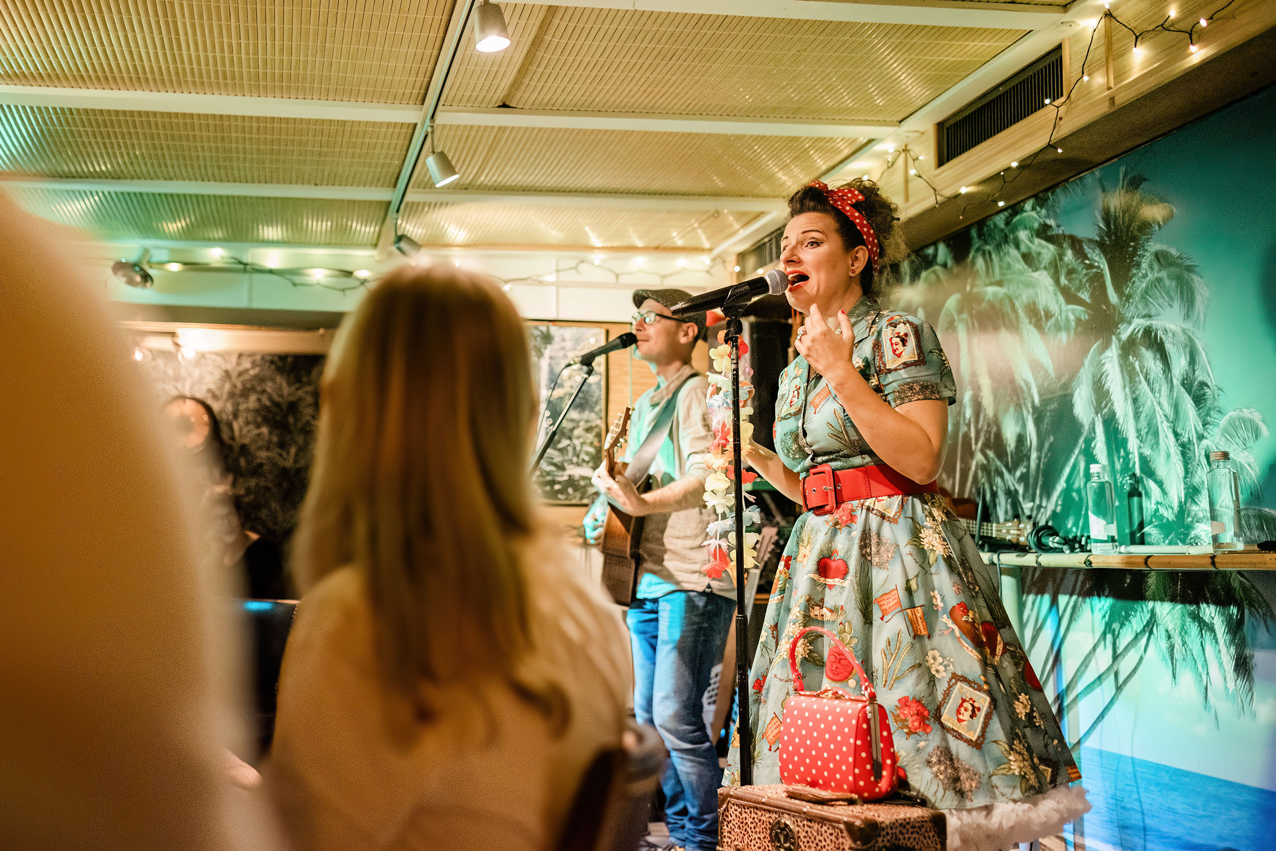 Little Chevy schüttelt sich den Petticoat zurecht. Dann lacht sie zu den Gästen im Publikum und greift zum Mikrofon. Die Basler Rockabilly-Sängerin, sonst von vier Männern ihrer Band begleitet, tritt an diesem Abend nur mit ihrem Gitarristen Markus Werner auf, «quasi mal was Neues», wie sie kurz darauf in der Begrüssung ins Publikum sagt. Das Lokal dieses Abends lädt zur Intimität ein: Little Chevy, die eigentlich Evelyne Péquignot heisst, tritt im Hula Club auf.