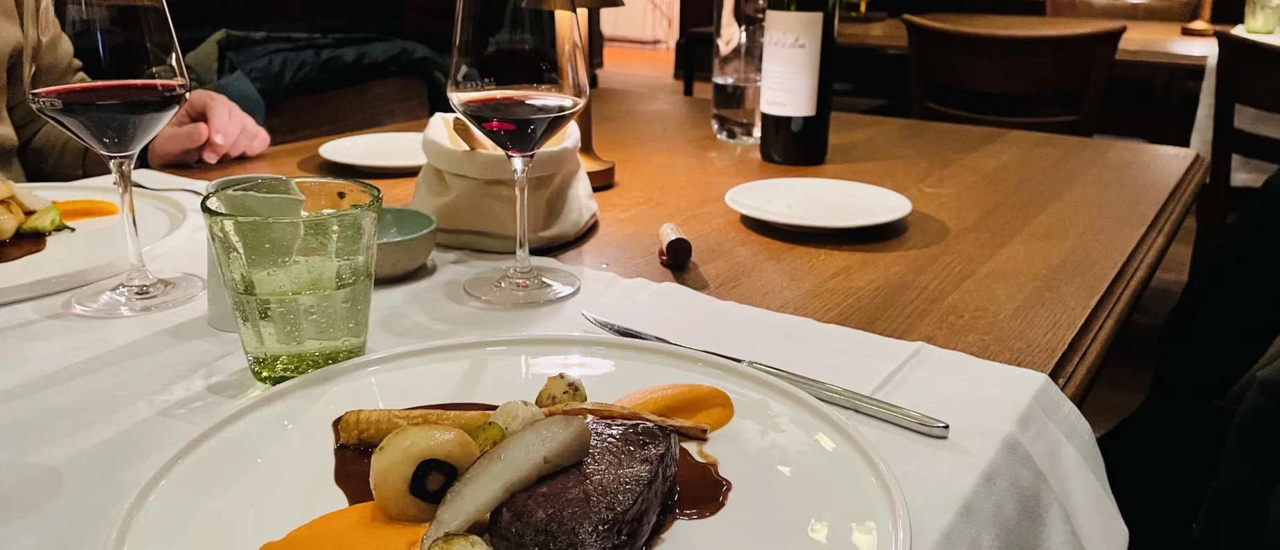 Wie bereits erwähnt wurde die Speisekarte überarbeitet, was glücklicherweise nicht bedeutet, dass das saftige Entrecôte einem veganen Tofu-Eintopf weichen musste. Nein, es bedeutet vielmehr, dass der Kontakt mit regionalen Produzenten und Lieferanten intensiviert wurde, um den Gästen ein noch regionaleres und nachhaltigeres Angebot zu bieten. Neue Akzente werden zudem mit dem 4-gängigen Degustationsmenü sowie einem frisch kreierten Business-Lunch gesetzt. Auch die Weinkarte kommt noch regionaler daher – mit einer grösseren Auswahl an auserlesenen Tropfen auf dem Dreiländereck. Für unser erstes Nachtessen in der wiedereröffneten Safran Zunft haben wir uns trotzdem für einen Sangiovese aus der Toskana entschieden – der Colli dell'Uccellina Riserva passt ausgezeichnet zum Hirschentrecôte!