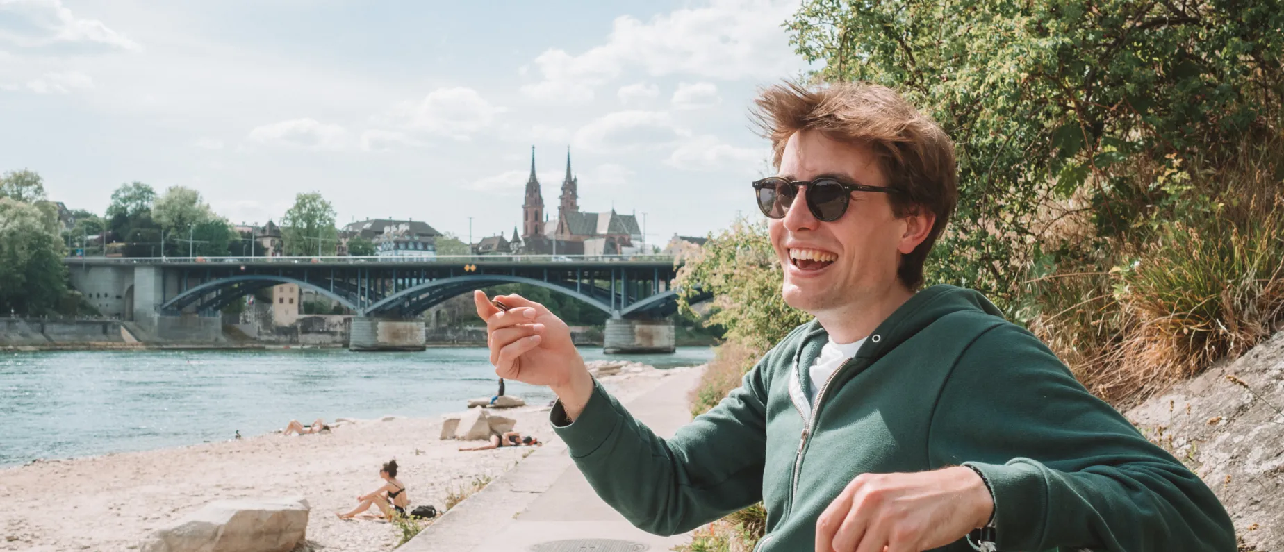 Lukas Nathrath führt uns zu jenem grünen Bänkli am Kleinbasler Rheinufer unterhalb des Schaffhauserrheinwegs, wo er nun die meiste Zeit des Tages verbringt. Stadtidylle pur. Vor uns der Rhein, den Stadtstrand zu Füssen und auf der anderen Seite die einzigartige Basler Stadtkulisse mit St. Alban-Rheinweg und Basler Münster – nicht schlecht dieser Arbeitsplatz. Wenn er es sich auf diesem Bänkli bequem mache, heisst es jeweils Handy aus und hinein in den magischen Zustand, der ihn in einer kreativen Welt verschwinden lässt. Das habe ihm übrigens Giacun Caduff beigebracht, der ihn zusammen mit dem ganzen Team vom Verein für die Förderung der Begeisterung am bewegten Bild (VFBbB) mit vollem Einsatz betreut. «An einem der ersten kreativen Meetings mit Giacun hat er mir das Handy aus der Hand genommen und gemeint, ich liesse mich zu sehr von der Aussenwelt ablenken. Zwei Tage habe ich dann mein Handy nicht angefasst – es war die produktivste Zeit meines Lebens», gesteht Lukas Nathrath und lacht.