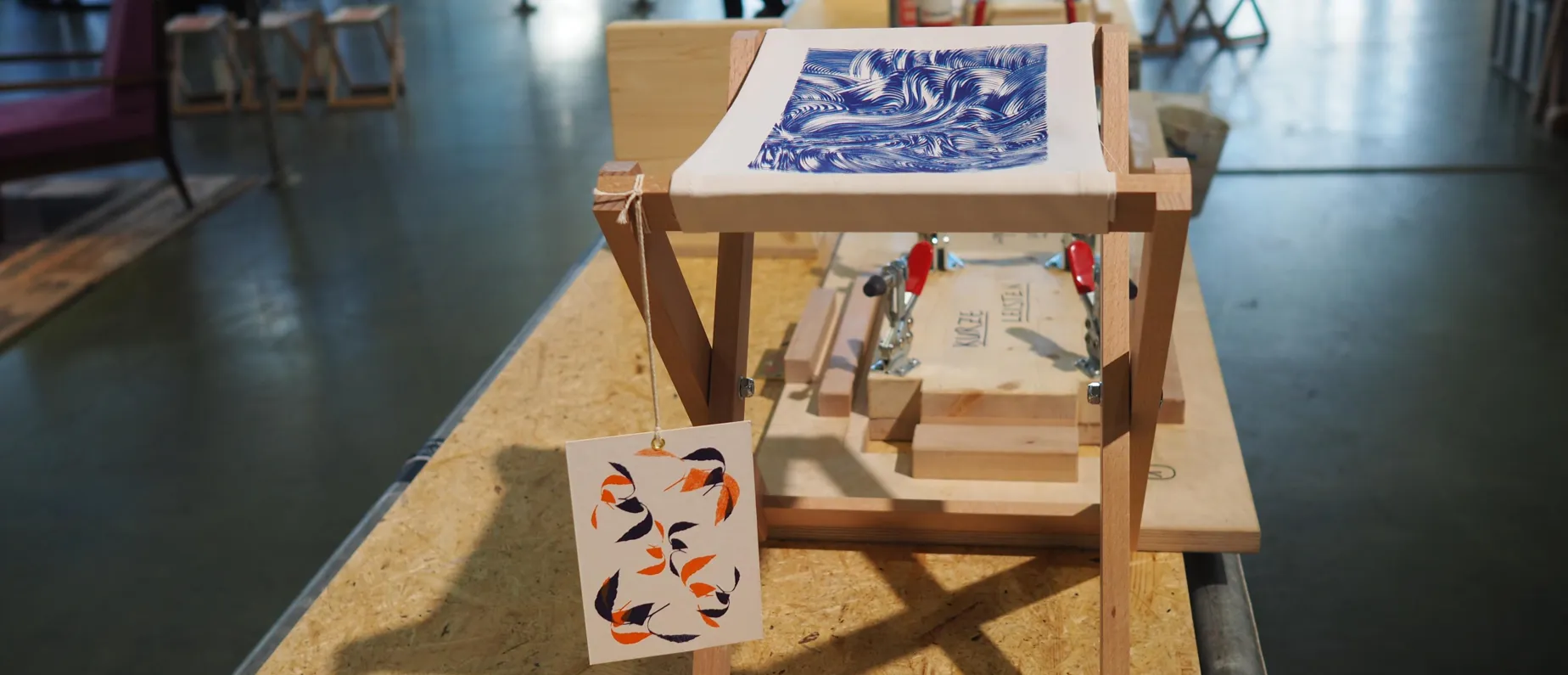 Der lange Produktionstisch verbindet einerseits die Ausstellungsflächen der beiden Unternehmen und zeigt gleichzeitig die einzelnen Fertigungsschritte auf. Zuerst wird unter fachkundiger Anleitung der Hocker zusammengeschustert und danach führt Gaspard in die Kunst des Siebdrucks ein. Verschiedene Motive stehen zur Auswahl bereit. Nur schon das Zusehen ist beeindruckend! Circa 30-40 Minuten und CHF 25.- für die Materialkosten sollte man für den selbst designten Hocker einrechnen. Wer es eilig hat, kann sich für einen Aufpreis aber auch einen vorab gestalteten mitnehmen.