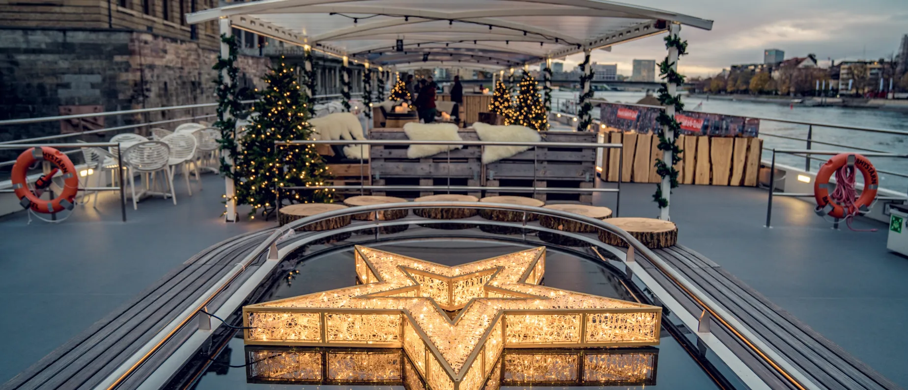 Das Thermometer kann dabei tun und lassen, was es will – auf dem Wiehnachtsstärn wird dir wollig warm ums Herz. Kuschle dich in eine gemütliche Decke, wärme deine Hände an einem Glühwein oder einem Piraten-Punsch und entdecke die Basler Weihnachtskulisse aus einem besonderen und einmaligen Blickwinkel! Geniesse einen gemütlichen Abend mit deinen liebsten Menschen auf dem Rhein und lass es dir gut gehen, denn – seien wir ehrlich – du hast es dir mehr als verdient!