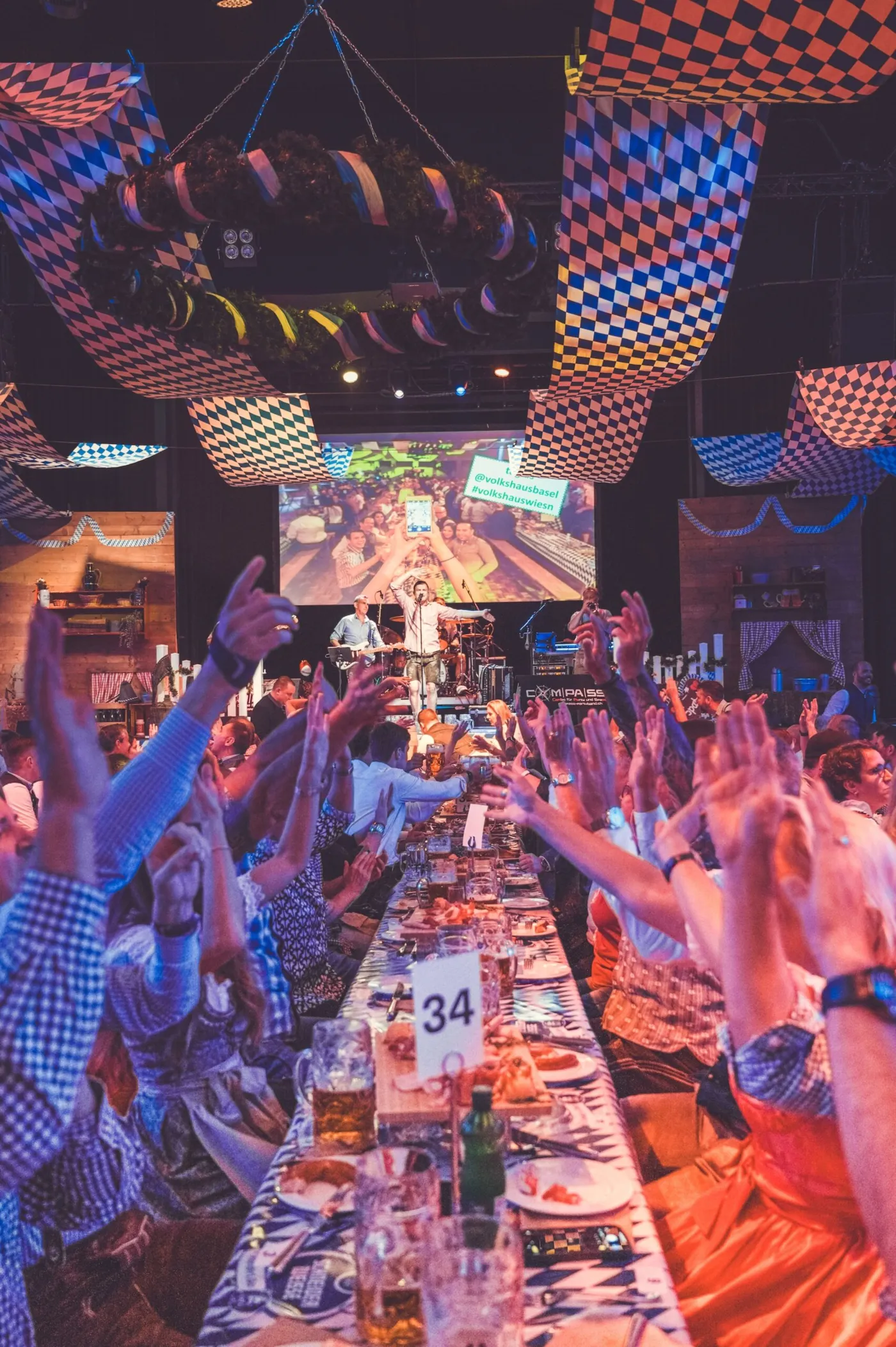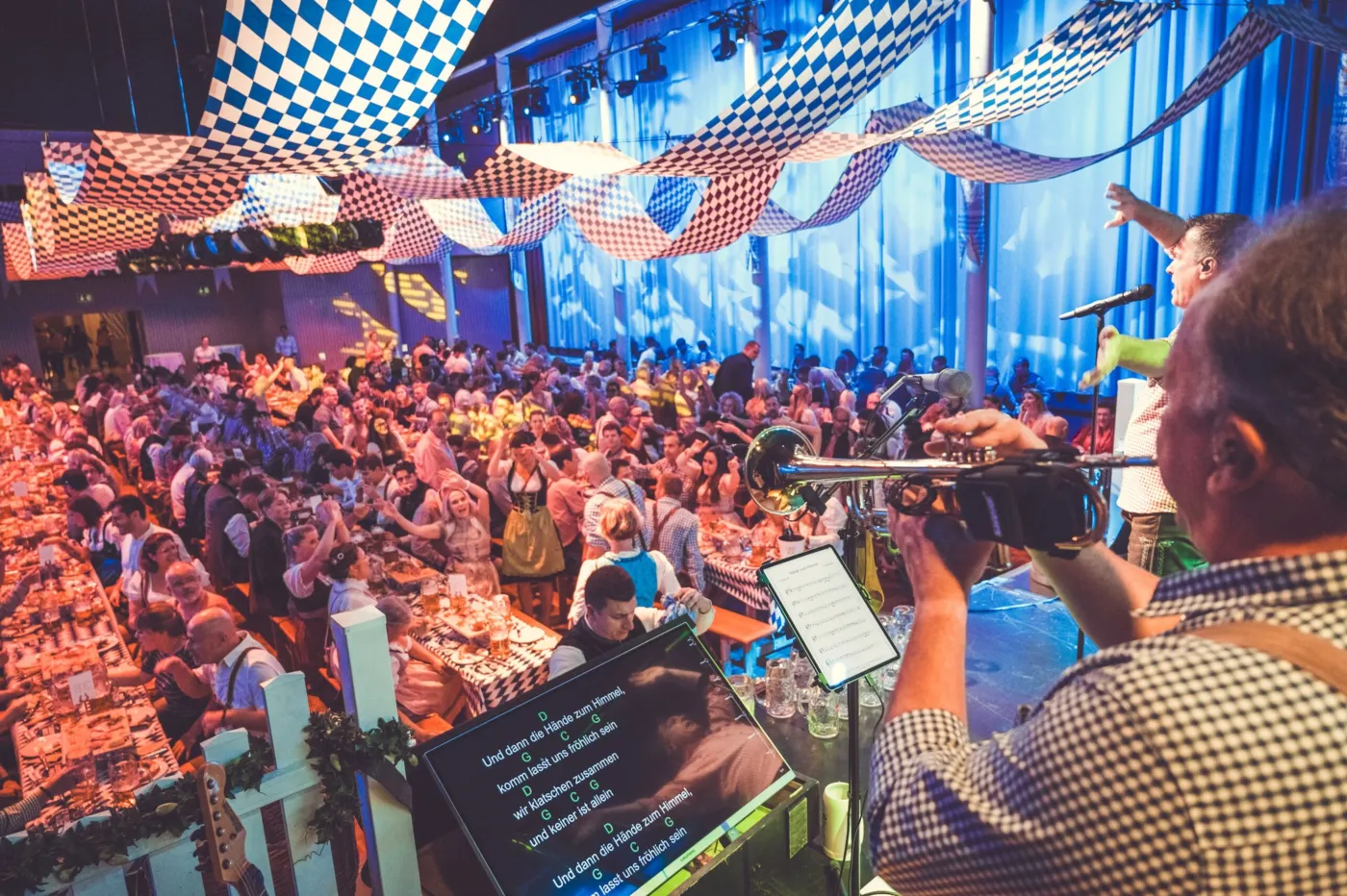 Auf der Bühne steht die Compass-Partyband – sechs eingespielte Musiker, welche dir die grossen Wiesn-Hits wie «Skandal im Sperrbezirk», «Hulapalu», «Viva Colonia», «Layla» oder «Atemlos» um die Ohren schmettern und dich dazu bringen, auf den Bänken zu tanzen, bevor überhaupt die erste Mass leer ist.