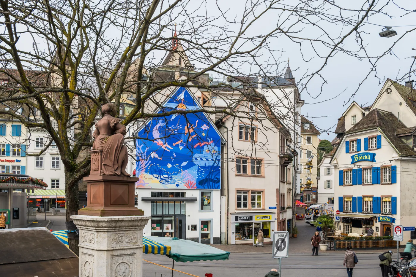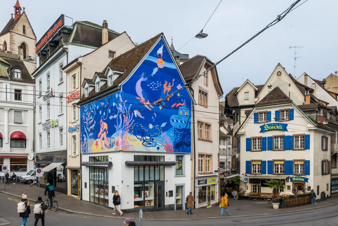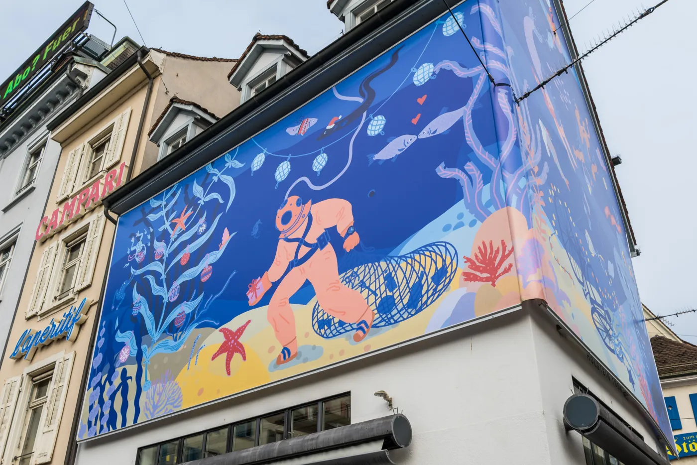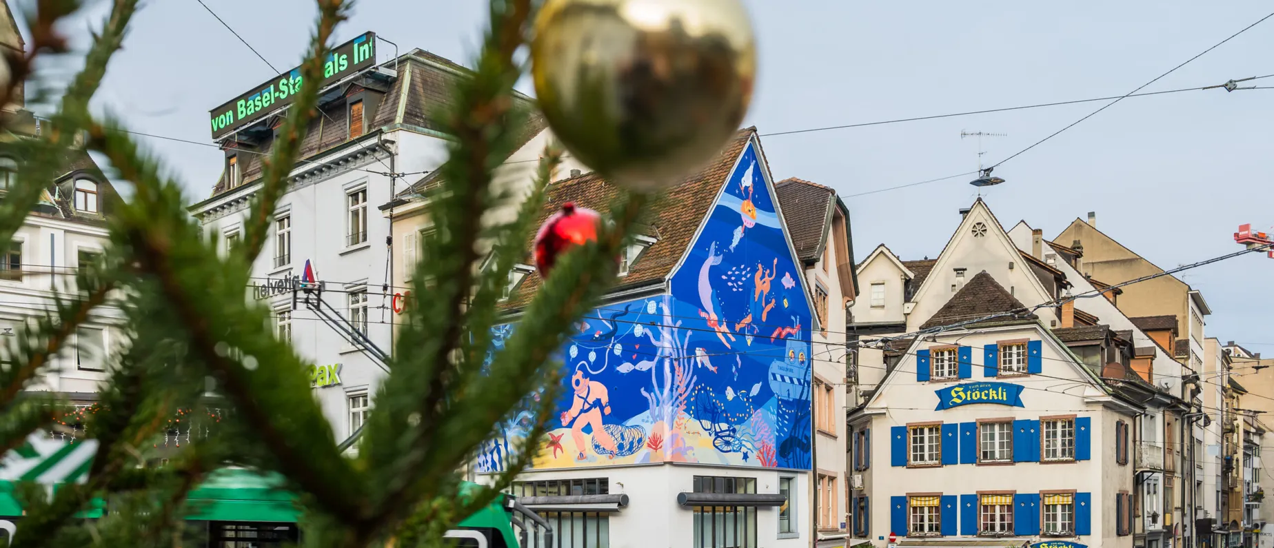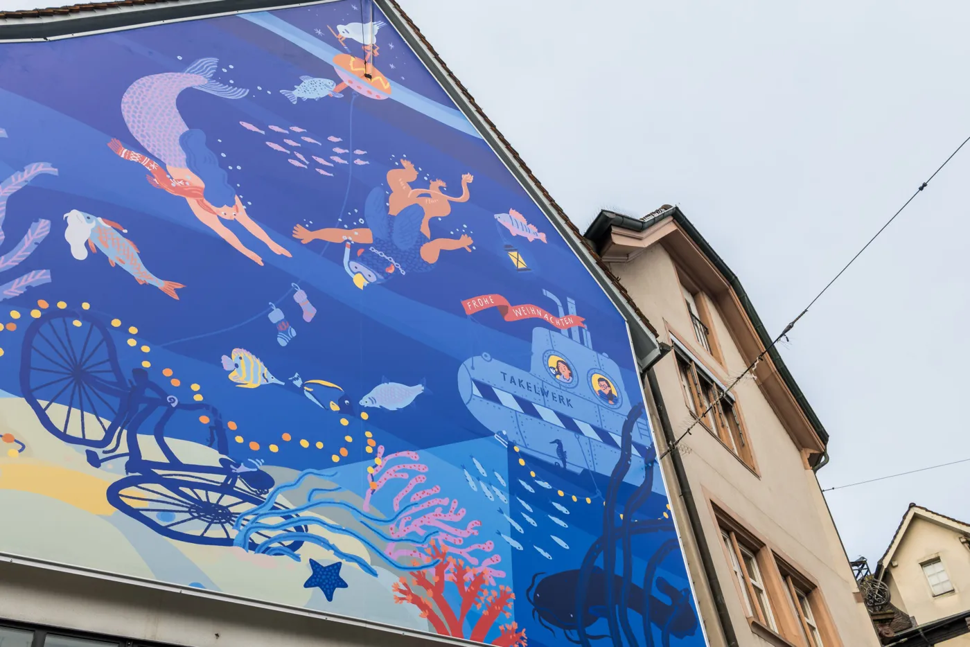 Seit nunmehr fünf Jahren darfst du dich auf deinem weihnachtlichen Stadtbummel am Barfi über ein weihnachtliches Kunstwerk rund um die Fassade der Maison Oris freuen. Mit ihrem mittlerweile traditionellen Winter Art Project gibt die Maison Oris der lokalen Kunstszene eine Plattform und fördert – in Zusammenarbeit mit dem Basler Artstübli und Kurator Philipp Brogli – Kunst im öffentlichen Raum. Die farbenfrohe Illustration von Takelwerk entführt uns dieses Jahr in ein weihnachtliches Basel unter Wasser. Hier treffen wir auch auf Vogel Gryff und eine Meerjungfrau, welche die Tiefen des Rheins, der unsere Stadt verbindet und prägt, mit uns erkunden. Die Basler Fähre verwandelt sich in diesem Kunstwerk in ein U-Boot, ein Taucher begibt sich samt wasserdichter Oris-Uhr am Handgelenk auf Geschenkemission und sorgt zusammen mit den festlich gekleideten Rheinbewohnerinnen und -bewohnern für weihnachtliche Stimmung in der Unterwasserwelt von Basel. Auch das Thema Nachhaltigkeit wird auf spielerische Weise im Kunstwerk aufgenommen – so zieht der Taucher ein Netz mit eingesammeltem Müll hinter sich her, welcher er in den Tiefen des Rheins gefunden hat.