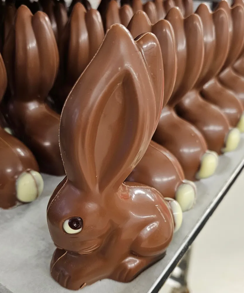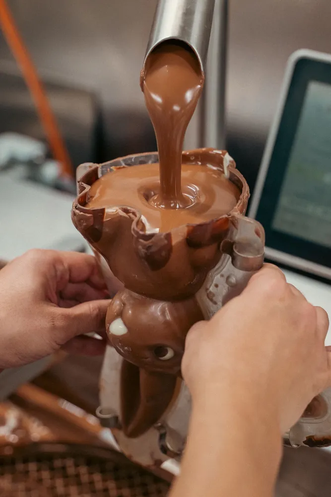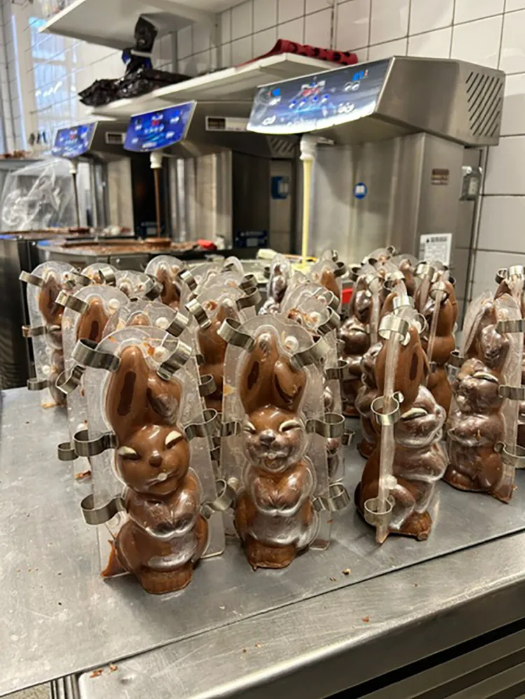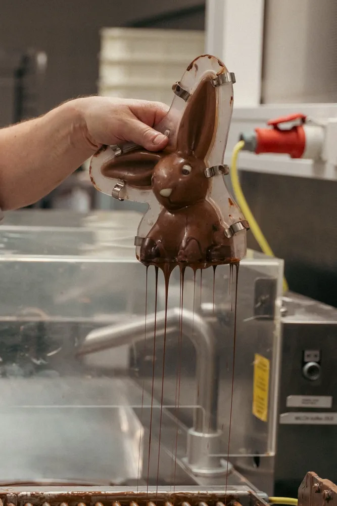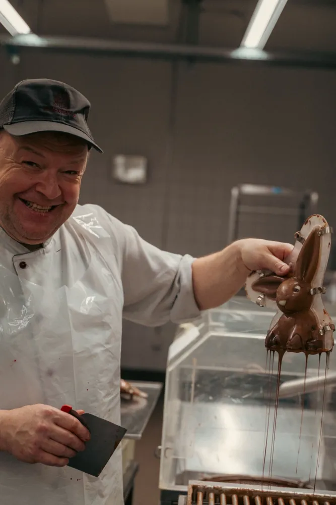 Beschle-Chocolatier Jean ist mit viel Herzblut und Leidenschaft am Werk und kreiert die kultigen Beschle Lampiohr Hasen sowie weiteren Osterkreationen von Hand und mit feinster Schokoladenqualität. Die Hasen werden allesamt in der Manufaktur in der Clarastrasse hergestellt.